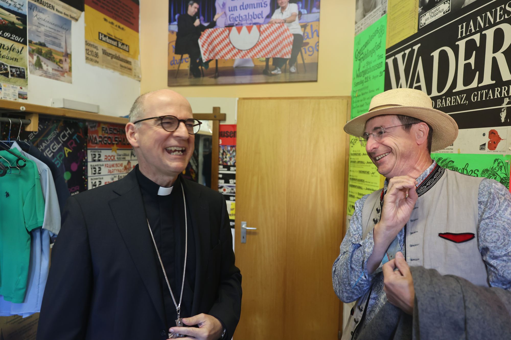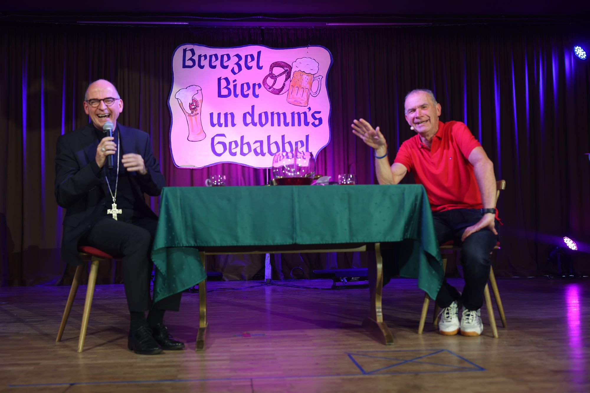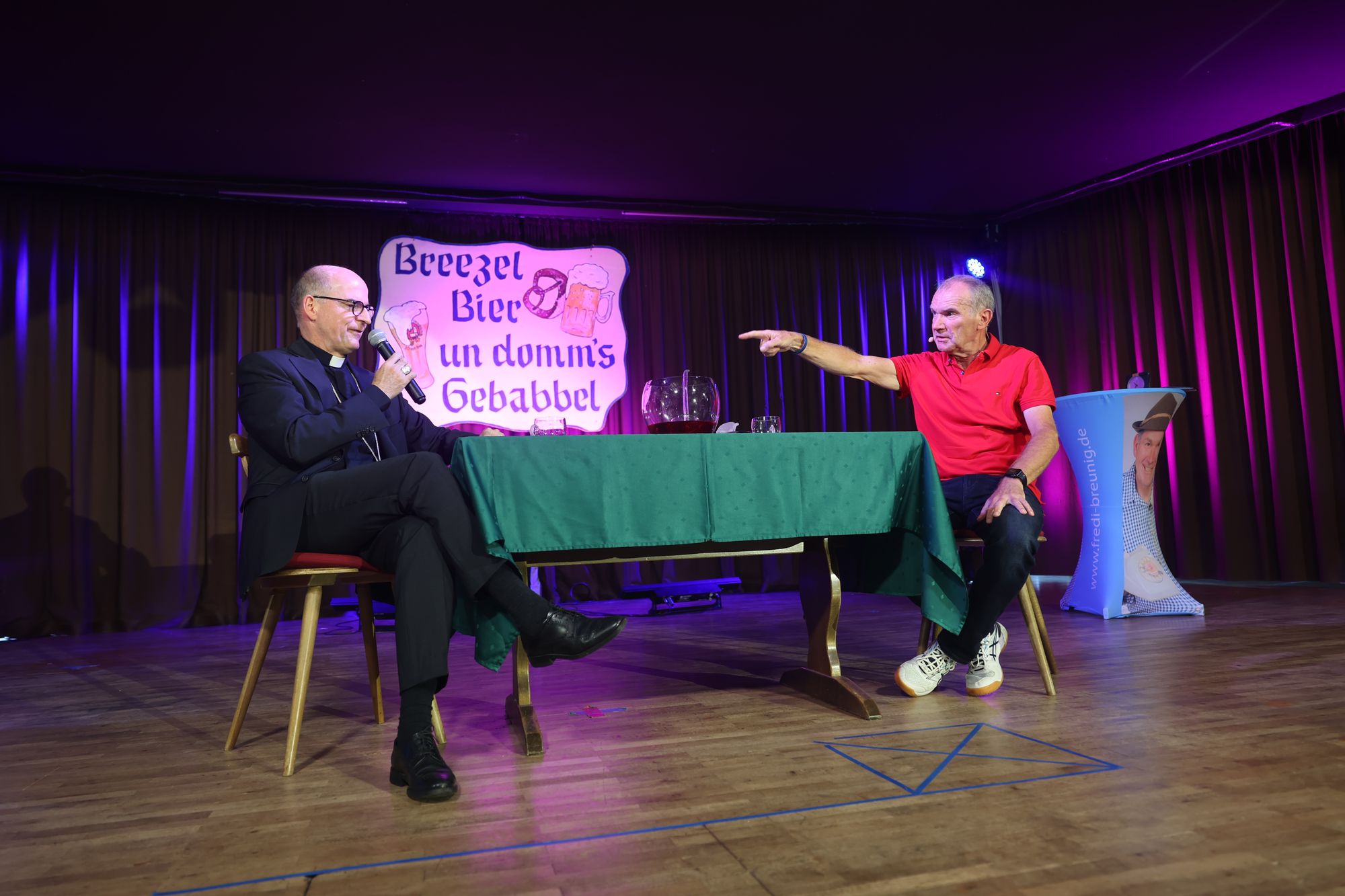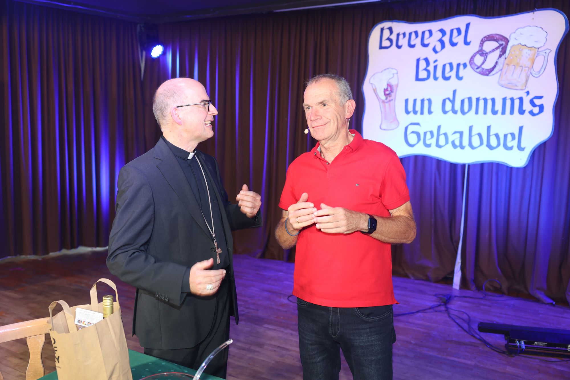 Wargolshausen (POW) Mario Basler hat es getan, Markus Söder ‒ und nun auch Bischof Dr. Franz Jung: Am Sonntag, 22. September, trat er als Überraschungsgast bei Fredi Breunigs kabarettistischem Frühschoppen „Breezel, Bier und domm's Gebabbel" in Wargolshausen (Landkreis Rhön-Grabfeld) auf. Eine knappe halbe Stunde wurde er bei roter Bowle auf der Bühne im Haus des Gastes interviewt. Im Publikum saßen mehr als 300 Personen. Der Bischof stand Rede und Antwort zu seiner Person ‒ einige überraschende Erkenntnisse inklusive. Weiterer Überraschungsgast an diesem Vormittag war Otti Schmelzer aus Oberschwappach, der mit Musik und schrägen Geschichten begeisterte.
