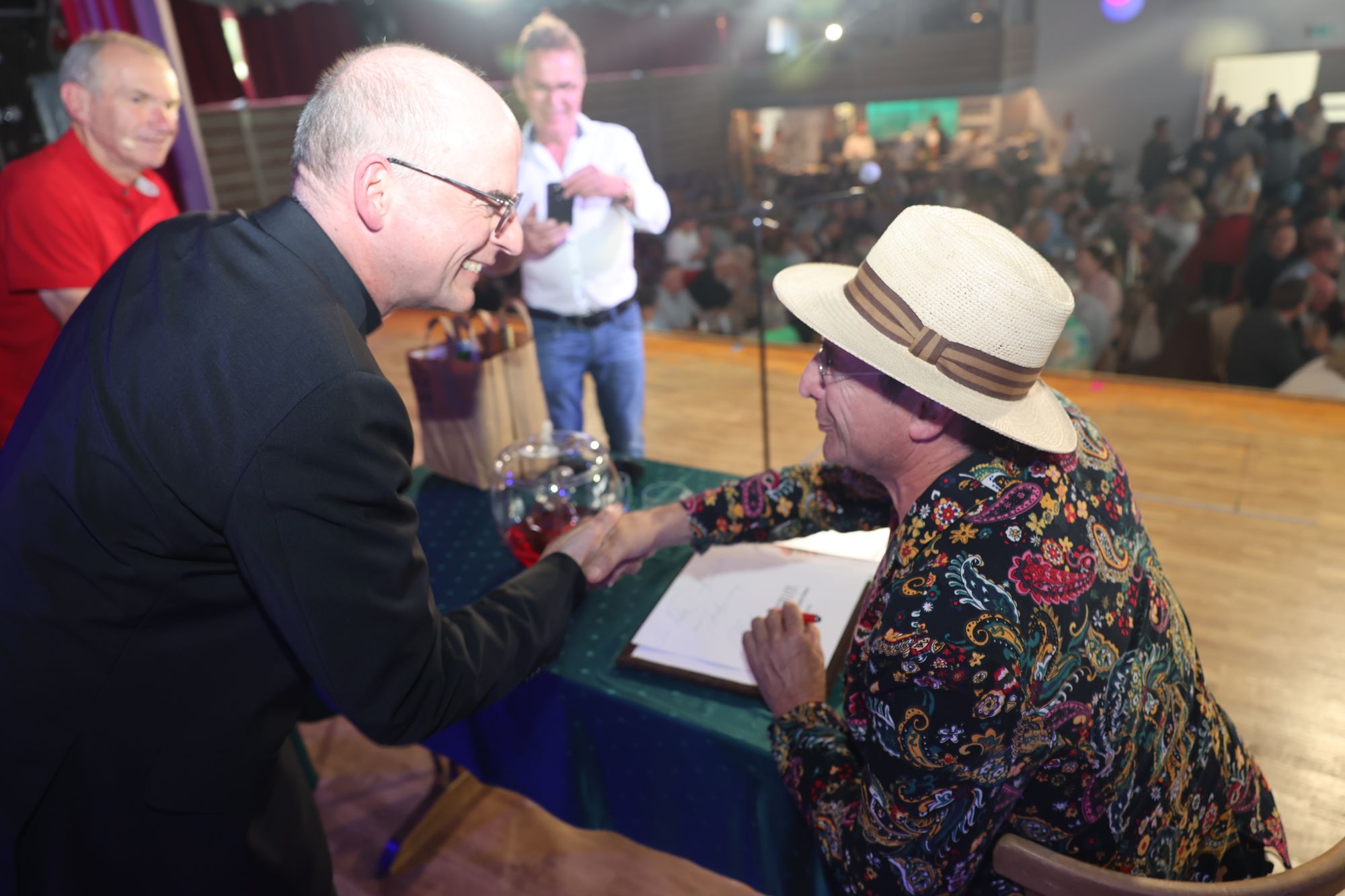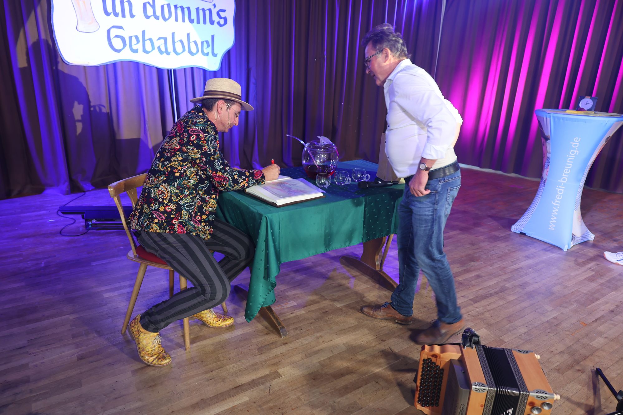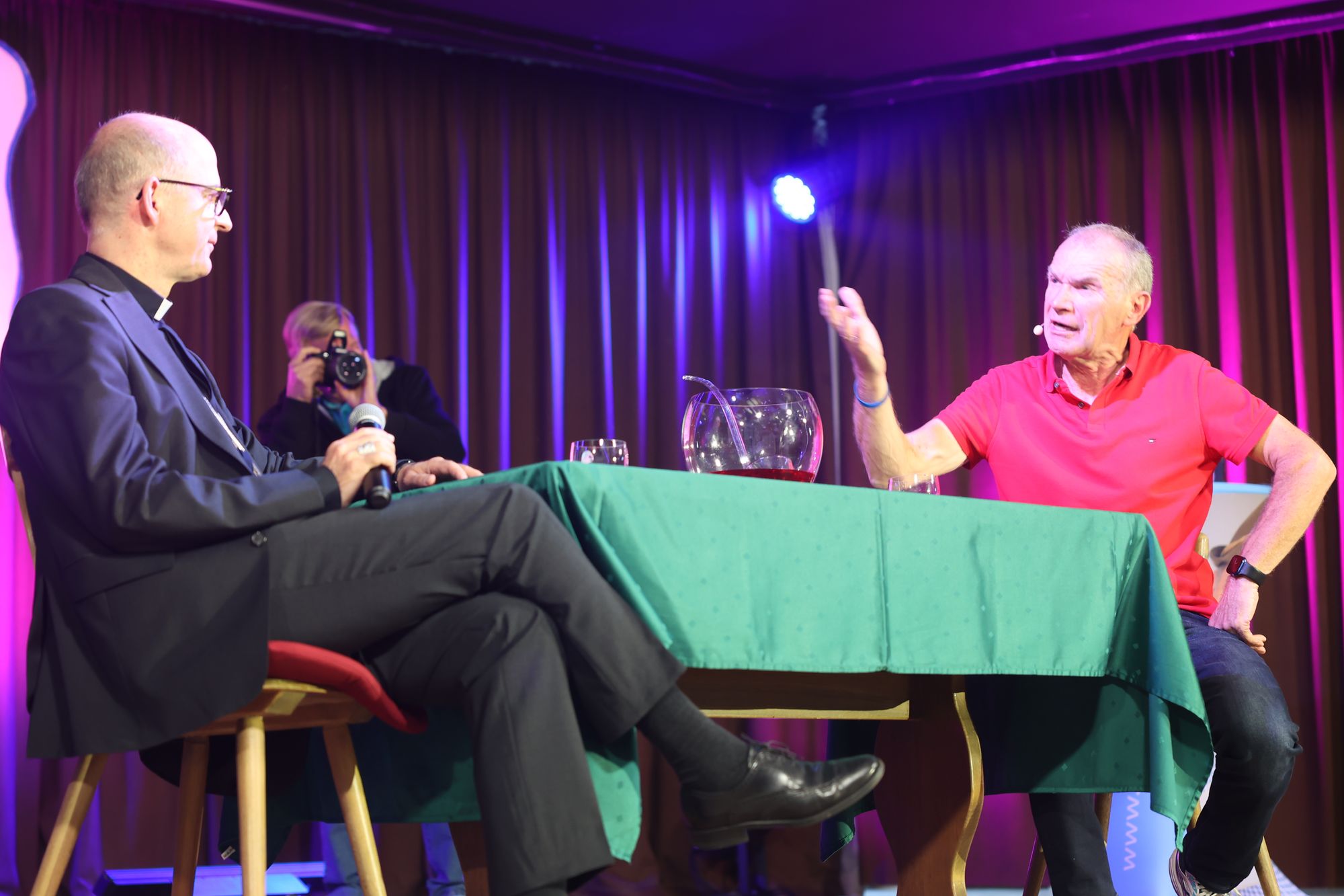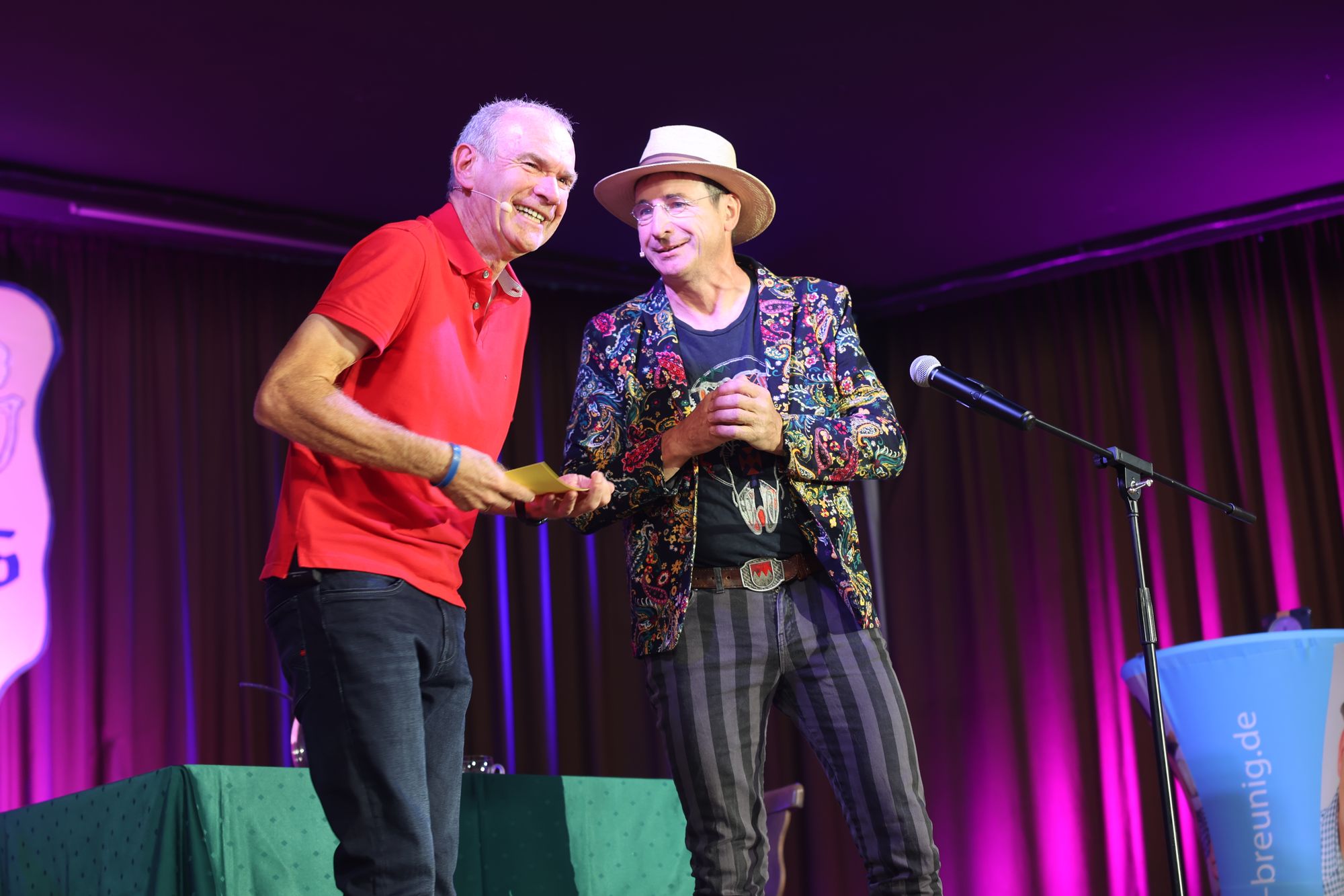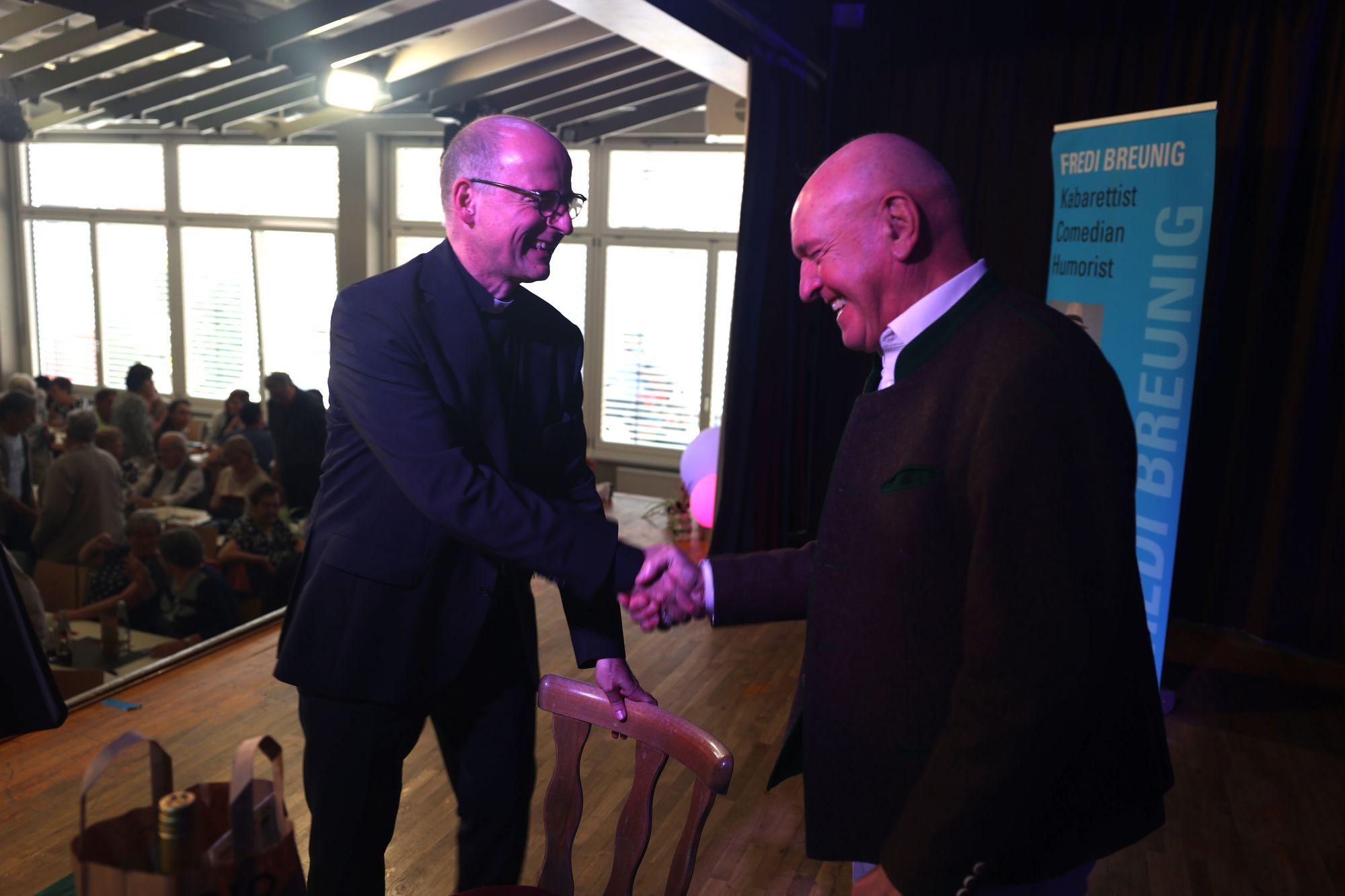 Wargolshausen (POW) Mario Basler hat es getan, Markus Söder ‒ und nun auch Bischof Dr. Franz Jung: Am Sonntag, 22. September, trat er als Überraschungsgast bei Fredi Breunigs kabarettistischem Frühschoppen „Breezel, Bier und domm's Gebabbel" in Wargolshausen (Landkreis Rhön-Grabfeld) auf. Eine knappe halbe Stunde wurde er bei roter Bowle auf der Bühne im Haus des Gastes interviewt. Im Publikum saßen mehr als 300 Personen. Der Bischof stand Rede und Antwort zu seiner Person ‒ einige überraschende Erkenntnisse inklusive. Weiterer Überraschungsgast an diesem Vormittag war Otti Schmelzer aus Oberschwappach, der mit Musik und schrägen Geschichten begeisterte.