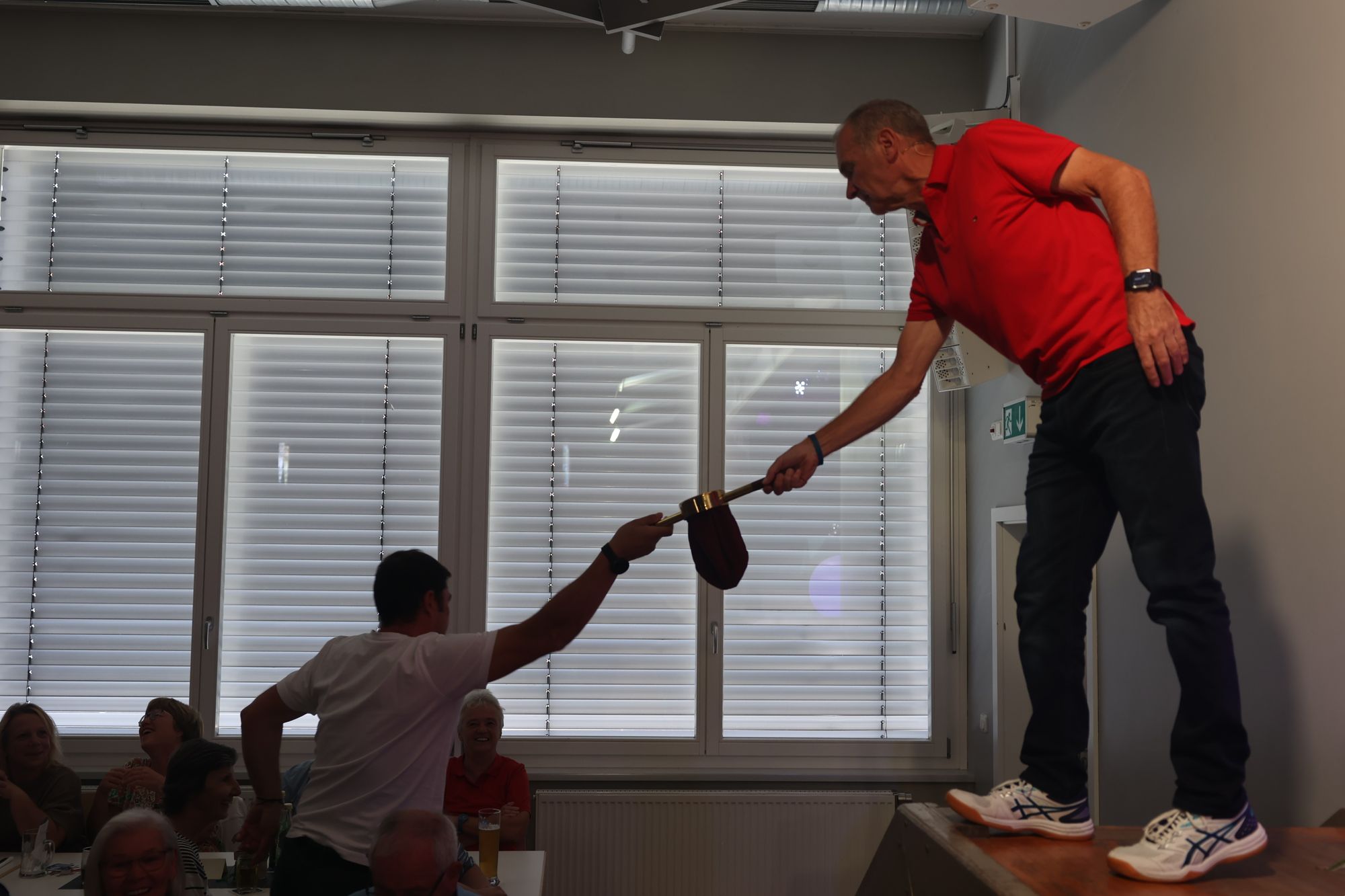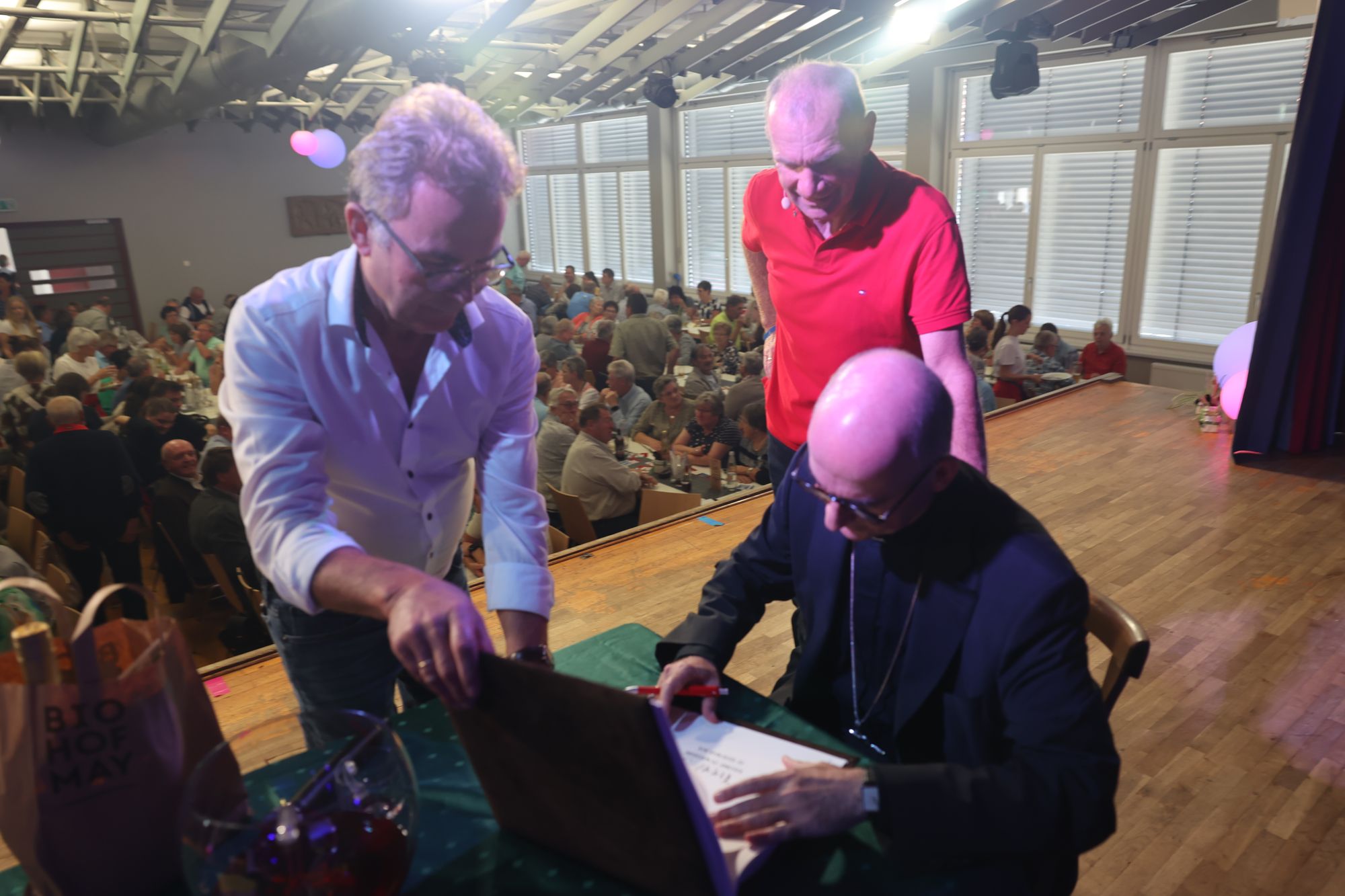 „Schön, einen Gast zu haben, der nicht lügen darf“, begrüßte Breunig den Bischof. Dieser dürfe sich ganz entspannen, es gebe wohl im ganzen Umland kein schwärzeres Dorf als die 450-Seelen-Ortschaft. Hier gebe es noch „70 bis 80 Prozent Gottesdienstbesucher am Sonntag“. Eine Zahl, die Ansgar Büttner, Vorsitzender der Vereinsgemeinschaft und Mitorganisator des Frühschoppen, nur wildes Kopfschütteln entlockte. Breunig ließ den Bischof wissen, dass er Verwandtschaft im pfälzischen Dudenhofen habe und den Klang des dortigen Dialekts liebe. „Sagen Sie doch bitte mal auf Pfälzisch: Der Pfarrer geht in der Pfalz mit der Pfeife in die Kirche!“ ‒ „Der Parrer geht in de Palz mit de Peif nei die Kersch!“ Und weil zum sonntäglichen Gottesdienst auch immer der Klingelbeutel dazugehört, ließ Breunig diesen im Saal kreisen. „Für einen guten Zweck, den Sie bestimmen, Herr Bischof.“
