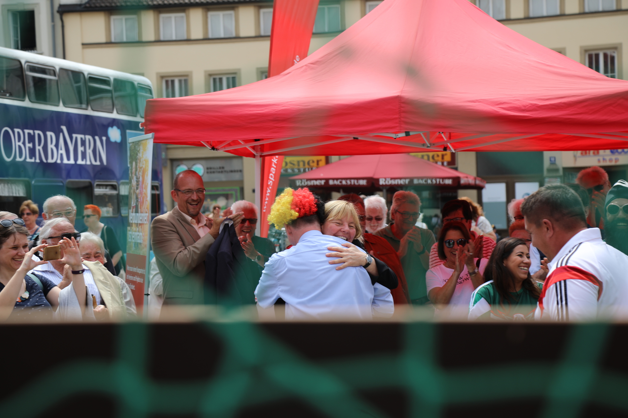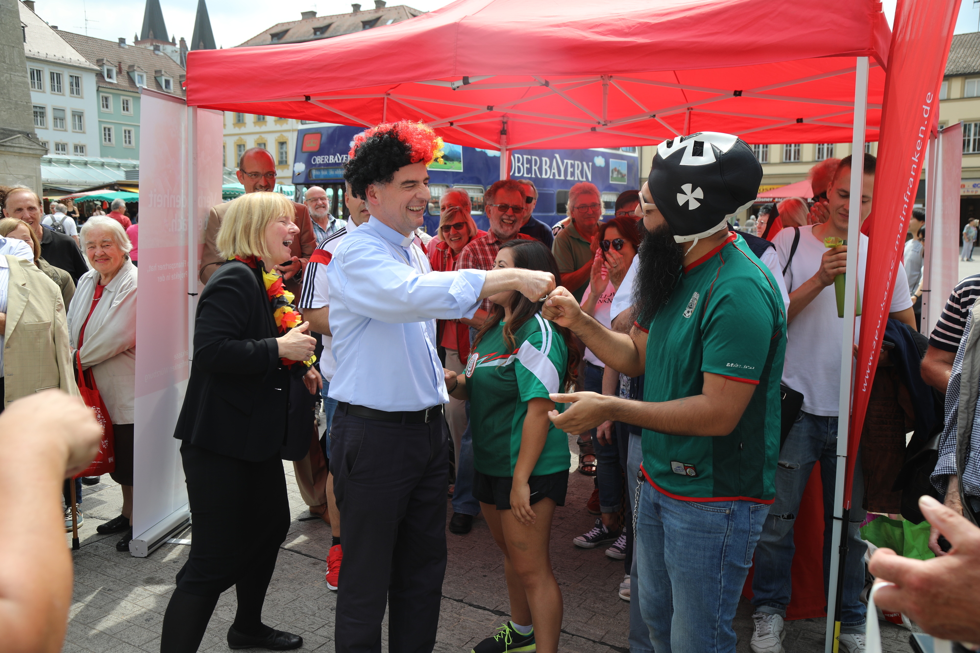 Zumindest, wenn man dem Ergebnis eines am Freitag, 15. Juni, ausgetragenen symbolischen Wettstreits zwischen Vertretern beider Nationen als Vorhersage traut. Als treffsicher erwies sich Bischof Dr. Franz Jung beim Torwandschießen von Main-Post und Sparkasse Mainfranken auf dem Unteren Markt. Dort trat er gemeinsam mit der evangelisch-lutherischen Dekanin Dr. Edda Weise an, um sich im spielerischen Wettstreit mit dem mexikanischen Fotografen Ulises Ruiz und der mexikanischen Studentin Maya Zapata zu messen. Jeder Spieler hatte unten wie oben drei Schuss. Bischof Jung erzielte mit einem Kraftschuss in das linke obere Loch den Siegtreffer. „Ein Glückstreffer“, wie er sagte. Er sei kein geübter Fußballer, erzählte Bischof Jung vor Beginn der Veranstaltung. Seinen letzten Treffer habe er 1987 bei einem Elfmeter während der deutschen Fußballmeisterschaft der Priesterseminare erzielt.