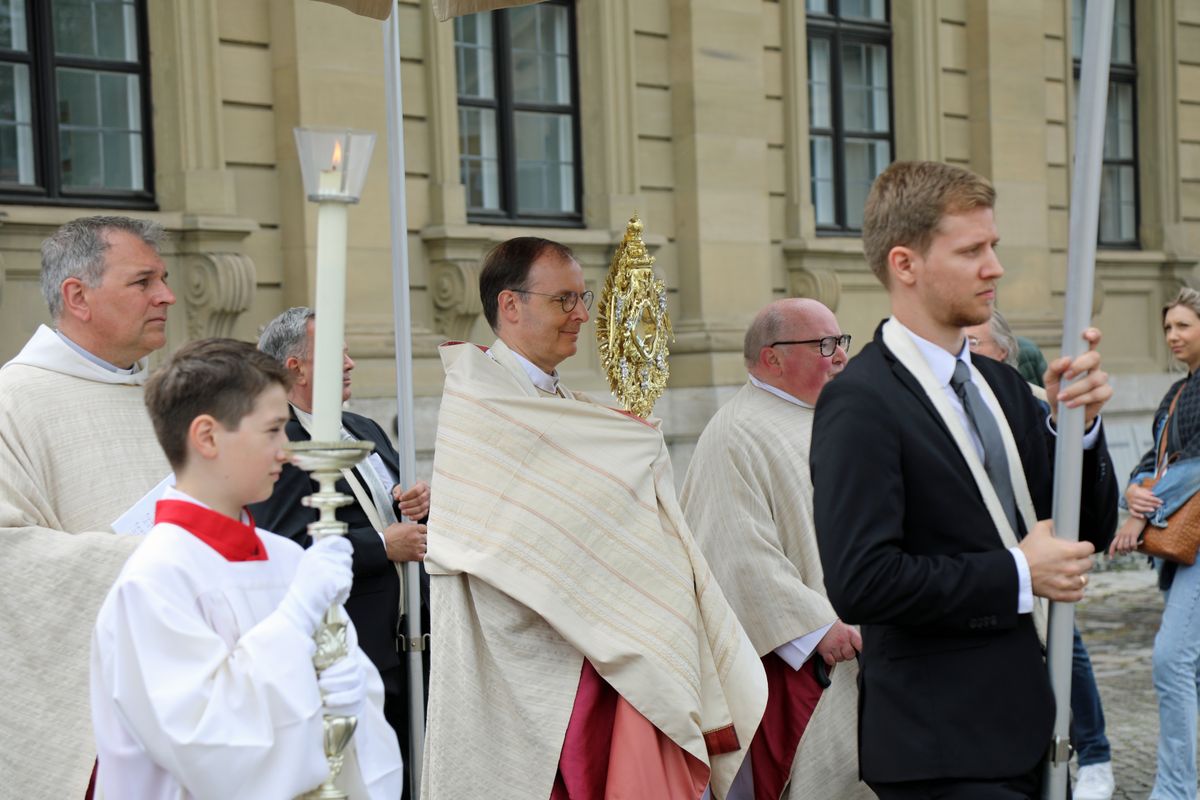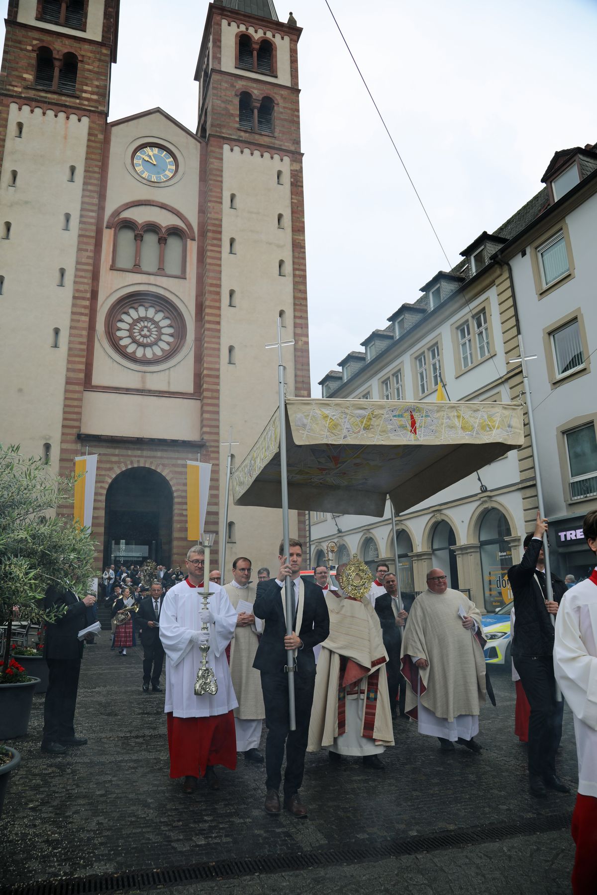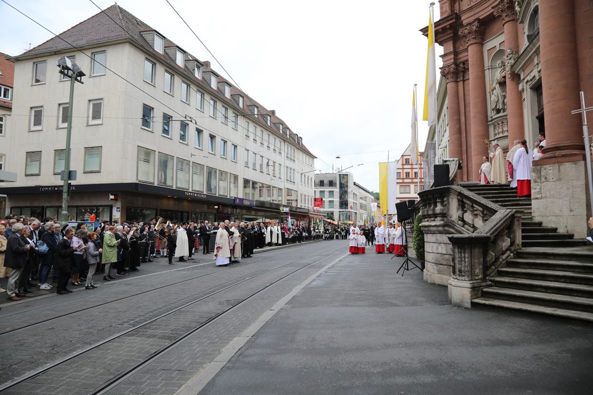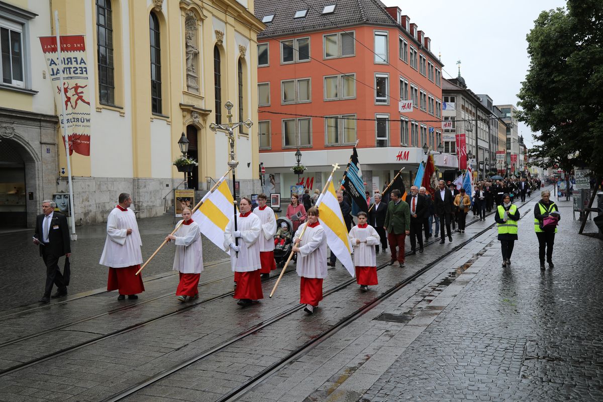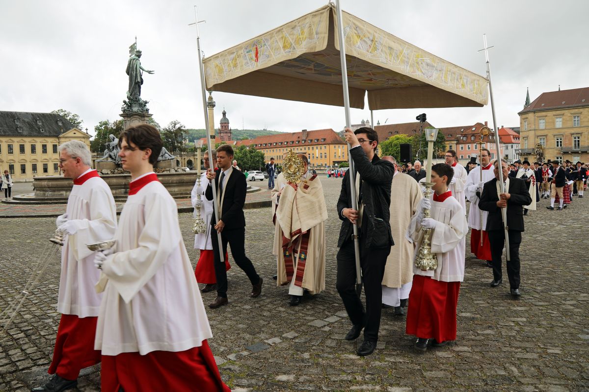 Begleitet von den Gläubigen aus den Würzburger Innenstadtpfarreien trug Bischof Jung im Anschluss an den Pontifikalgottesdienst die Monstranz mit dem Allerheiligsten durch die Straßen. Weihbischof Paul Reder und Dompfarrer Domkapitular Stefan Gessner assistierten dem Bischof unter dem Tragehimmel. Mitglieder des Domkapitels, Ordensleute, Mitglieder der Ritterorden sowie Verbände, Vereine, Studentenverbindungen und Innungen gingen dem Allerheiligsten voran. Hinter dem Tragehimmel liefen Oberbürgermeister Christian Schuchardt und weitere Vertreter des öffentlichen Lebens, Ordensfrauen sowie Gläubige vor allem aus den Innenstadtpfarreien Dom, Neumünster, Sankt Peter und Paul, Sankt Gertraud und Stift Haug. Einige Häuser entlang des Prozessionswegs waren mit Blumen und Fahnen geschmückt. Die Texte der Prozession hatte das Referat Verkündigung und Liturgie vorbereitet. Der Weg führte vom Dom durch die Schönbornstraße, Juliuspromenade und Theaterstraße zum Residenzplatz. Dort wurde Statio gehalten, ehe der Zug über die Balthasar-Neumann-Promenade, Neubaustraße, Schönthal- und Plattnerstraße zum Neumünster führte. Auf der Treppenanlage der Grabeskirche der Frankenapostel erteilte Bischof Jung, wie bereits an der Residenz, den eucharistischen Segen mit der Monstranz. Mit dem Lied „Großer Gott, wir loben Dich“ klang die knapp dreistündige Feier aus.