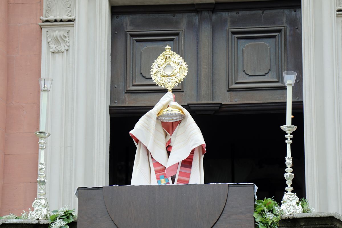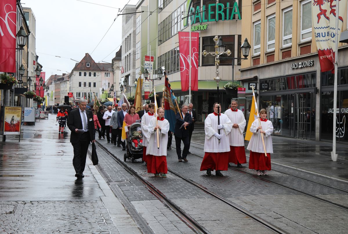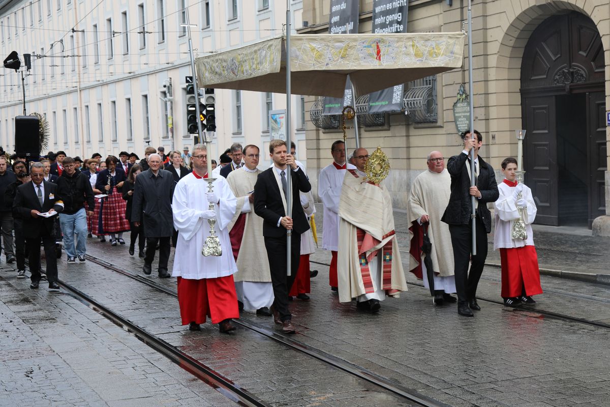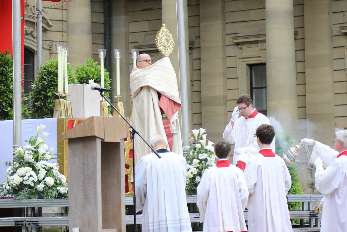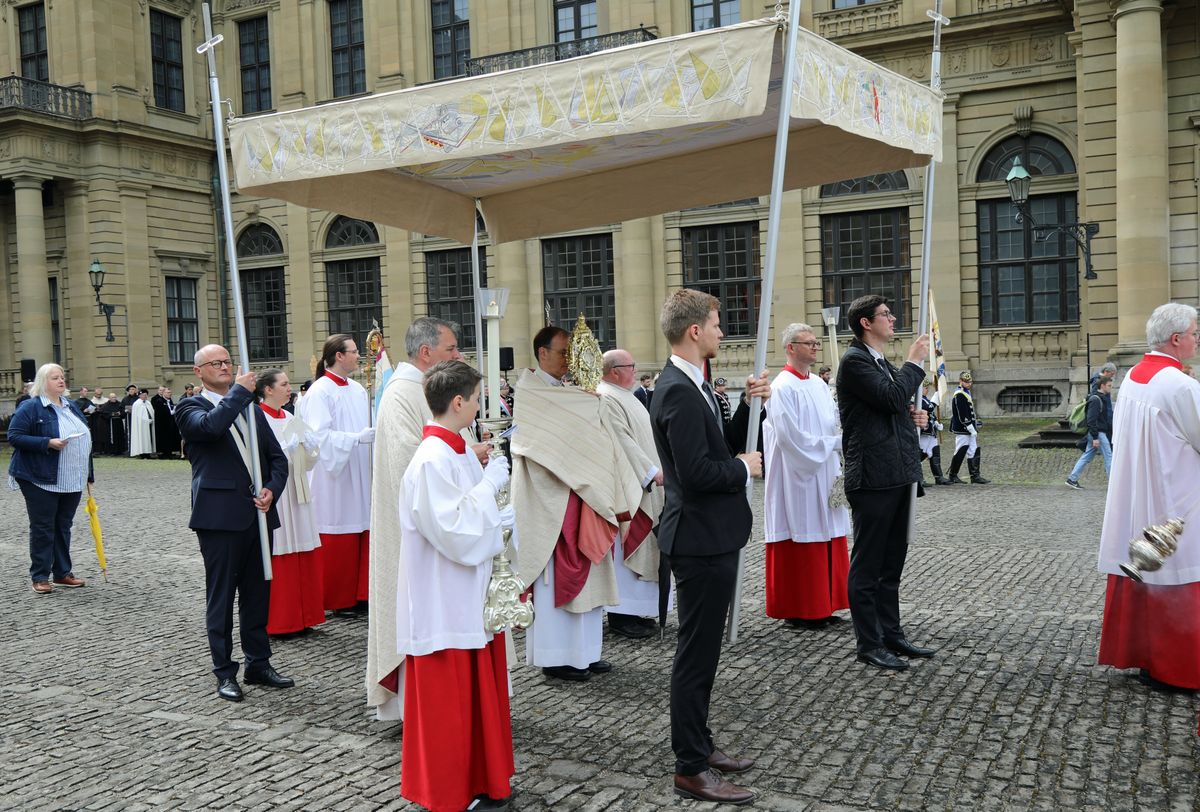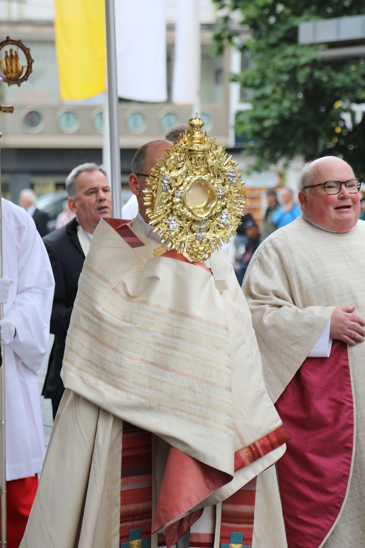 Begleitet von den Gläubigen aus den Würzburger Innenstadtpfarreien trug Bischof Jung im Anschluss an den Pontifikalgottesdienst die Monstranz mit dem Allerheiligsten durch die Straßen. Weihbischof Paul Reder und Dompfarrer Domkapitular Stefan Gessner assistierten dem Bischof unter dem Tragehimmel. Mitglieder des Domkapitels, Ordensleute, Mitglieder der Ritterorden sowie Verbände, Vereine, Studentenverbindungen und Innungen gingen dem Allerheiligsten voran. Hinter dem Tragehimmel liefen Oberbürgermeister Christian Schuchardt und weitere Vertreter des öffentlichen Lebens, Ordensfrauen sowie Gläubige vor allem aus den Innenstadtpfarreien Dom, Neumünster, Sankt Peter und Paul, Sankt Gertraud und Stift Haug. Einige Häuser entlang des Prozessionswegs waren mit Blumen und Fahnen geschmückt. Die Texte der Prozession hatte das Referat Verkündigung und Liturgie vorbereitet. Der Weg führte vom Dom durch die Schönbornstraße, Juliuspromenade und Theaterstraße zum Residenzplatz. Dort wurde Statio gehalten, ehe der Zug über die Balthasar-Neumann-Promenade, Neubaustraße, Schönthal- und Plattnerstraße zum Neumünster führte. Auf der Treppenanlage der Grabeskirche der Frankenapostel erteilte Bischof Jung, wie bereits an der Residenz, den eucharistischen Segen mit der Monstranz. Mit dem Lied „Großer Gott, wir loben Dich“ klang die knapp dreistündige Feier aus.