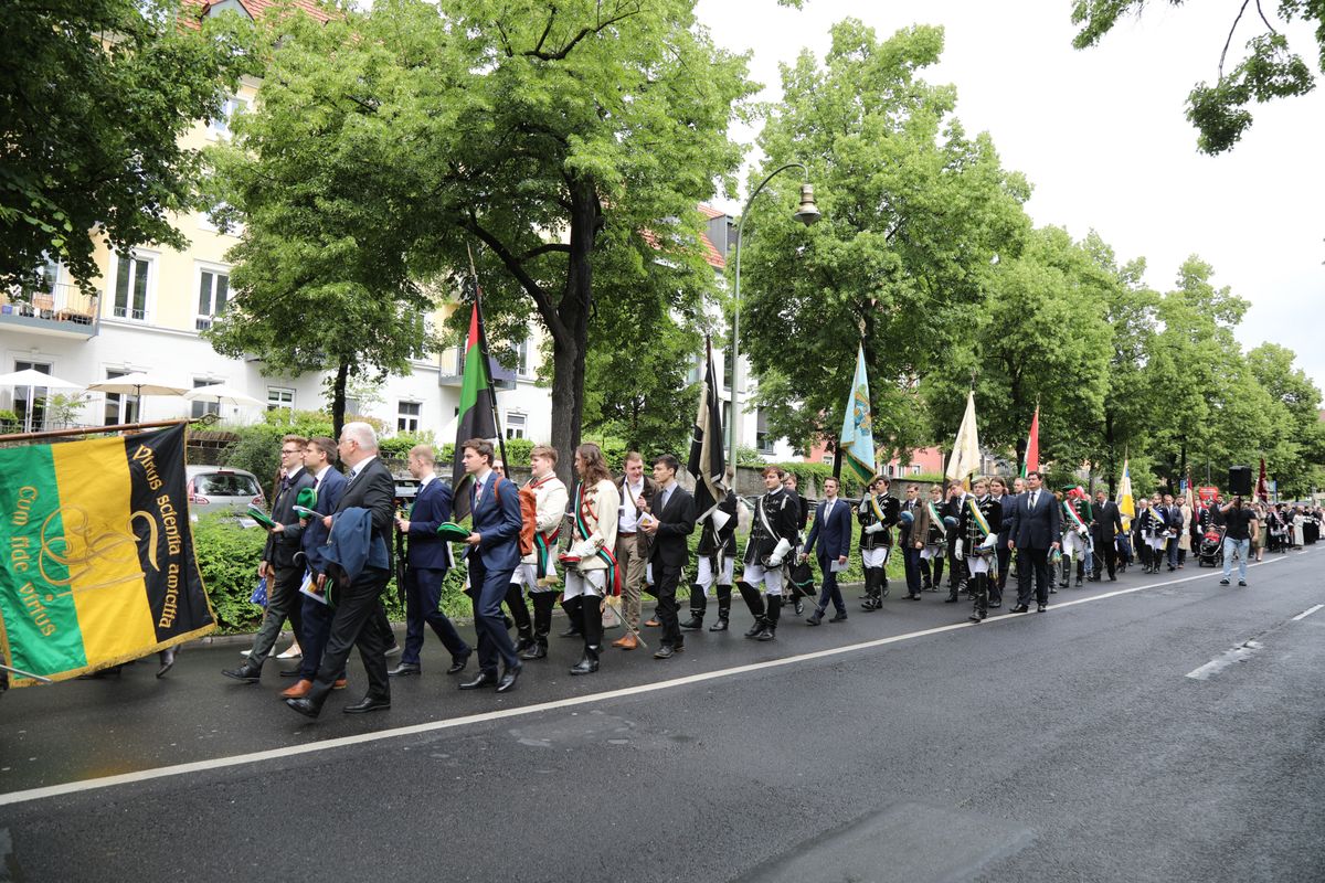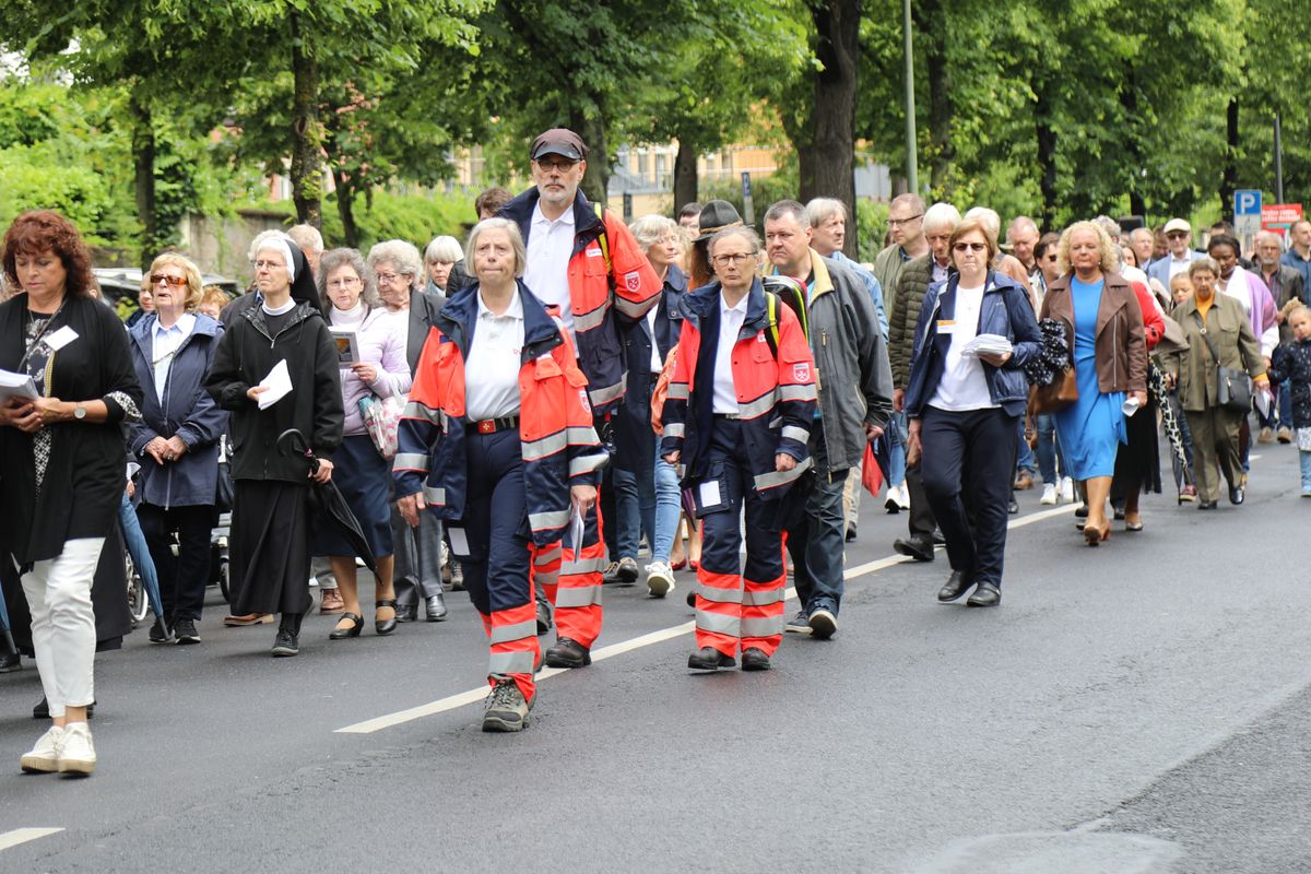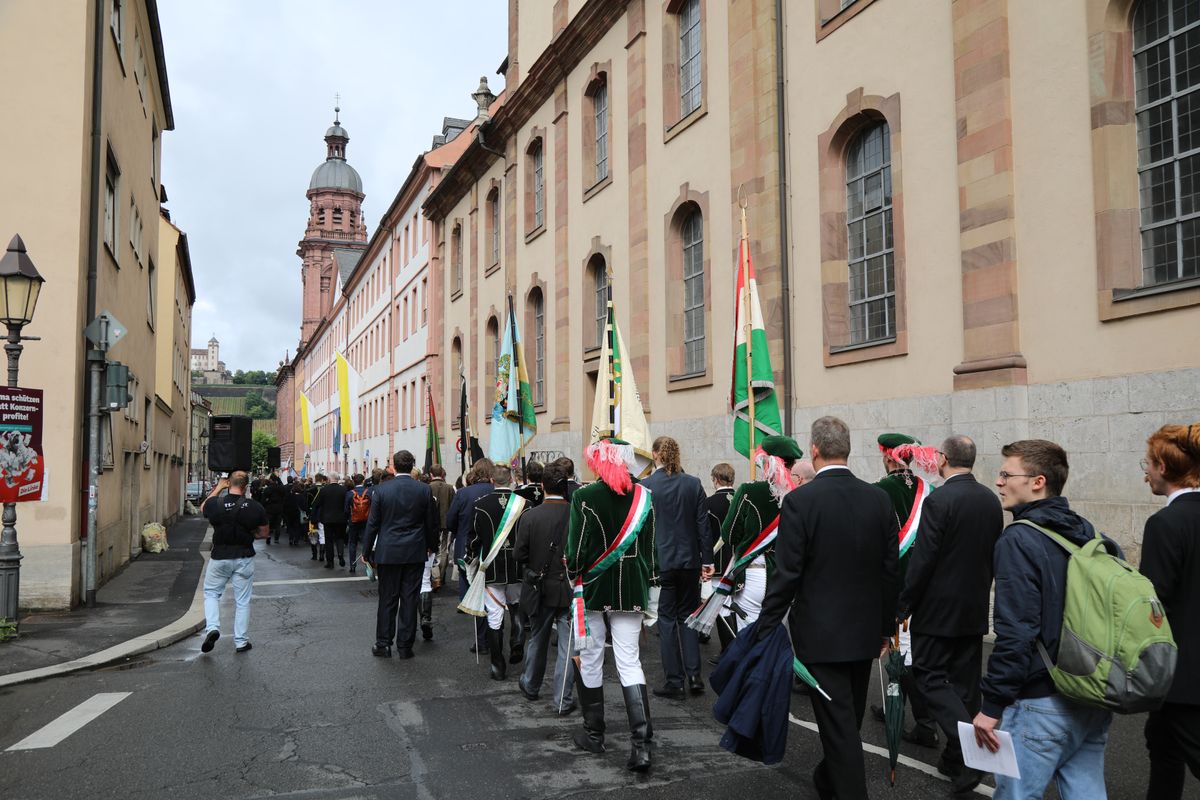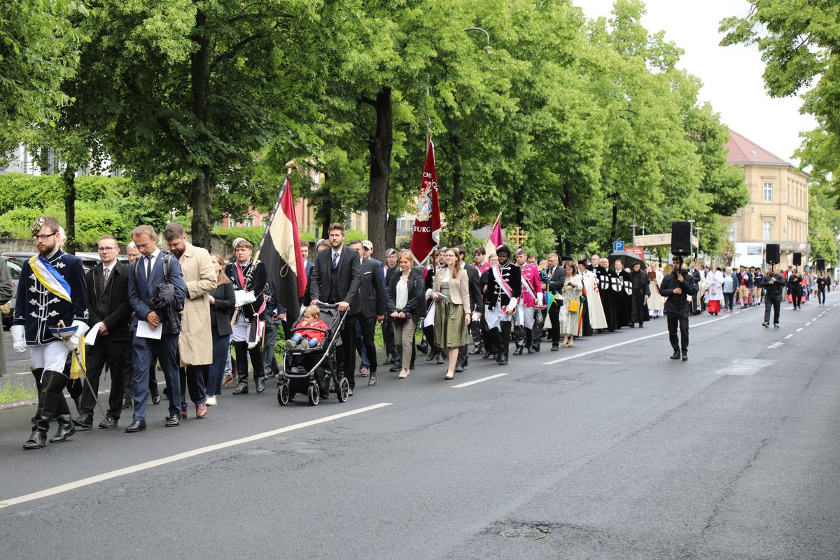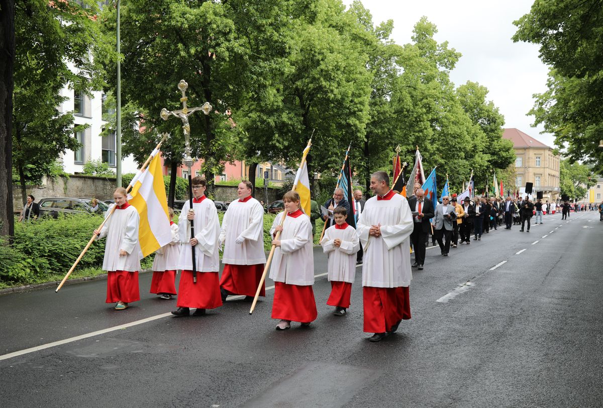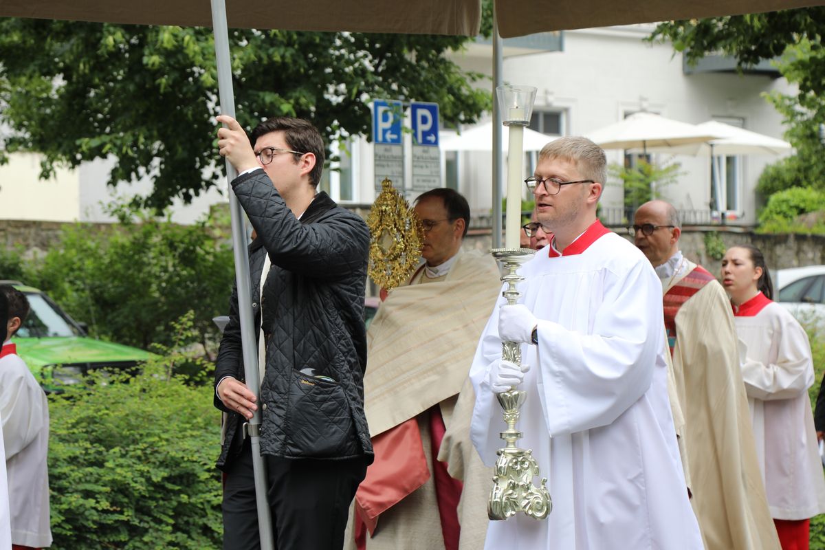 Begleitet von den Gläubigen aus den Würzburger Innenstadtpfarreien trug Bischof Jung im Anschluss an den Pontifikalgottesdienst die Monstranz mit dem Allerheiligsten durch die Straßen. Weihbischof Paul Reder und Dompfarrer Domkapitular Stefan Gessner assistierten dem Bischof unter dem Tragehimmel. Mitglieder des Domkapitels, Ordensleute, Mitglieder der Ritterorden sowie Verbände, Vereine, Studentenverbindungen und Innungen gingen dem Allerheiligsten voran. Hinter dem Tragehimmel liefen Oberbürgermeister Christian Schuchardt und weitere Vertreter des öffentlichen Lebens, Ordensfrauen sowie Gläubige vor allem aus den Innenstadtpfarreien Dom, Neumünster, Sankt Peter und Paul, Sankt Gertraud und Stift Haug. Einige Häuser entlang des Prozessionswegs waren mit Blumen und Fahnen geschmückt. Die Texte der Prozession hatte das Referat Verkündigung und Liturgie vorbereitet. Der Weg führte vom Dom durch die Schönbornstraße, Juliuspromenade und Theaterstraße zum Residenzplatz. Dort wurde Statio gehalten, ehe der Zug über die Balthasar-Neumann-Promenade, Neubaustraße, Schönthal- und Plattnerstraße zum Neumünster führte. Auf der Treppenanlage der Grabeskirche der Frankenapostel erteilte Bischof Jung, wie bereits an der Residenz, den eucharistischen Segen mit der Monstranz. Mit dem Lied „Großer Gott, wir loben Dich“ klang die knapp dreistündige Feier aus.