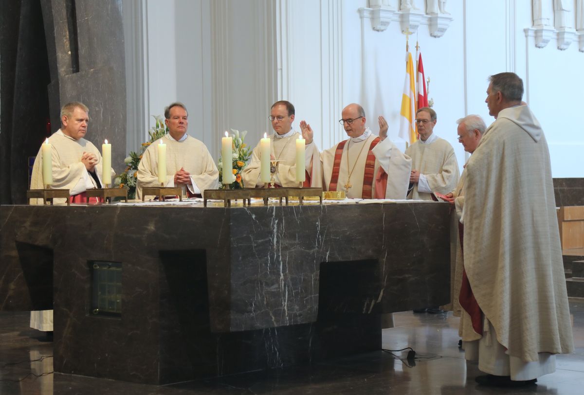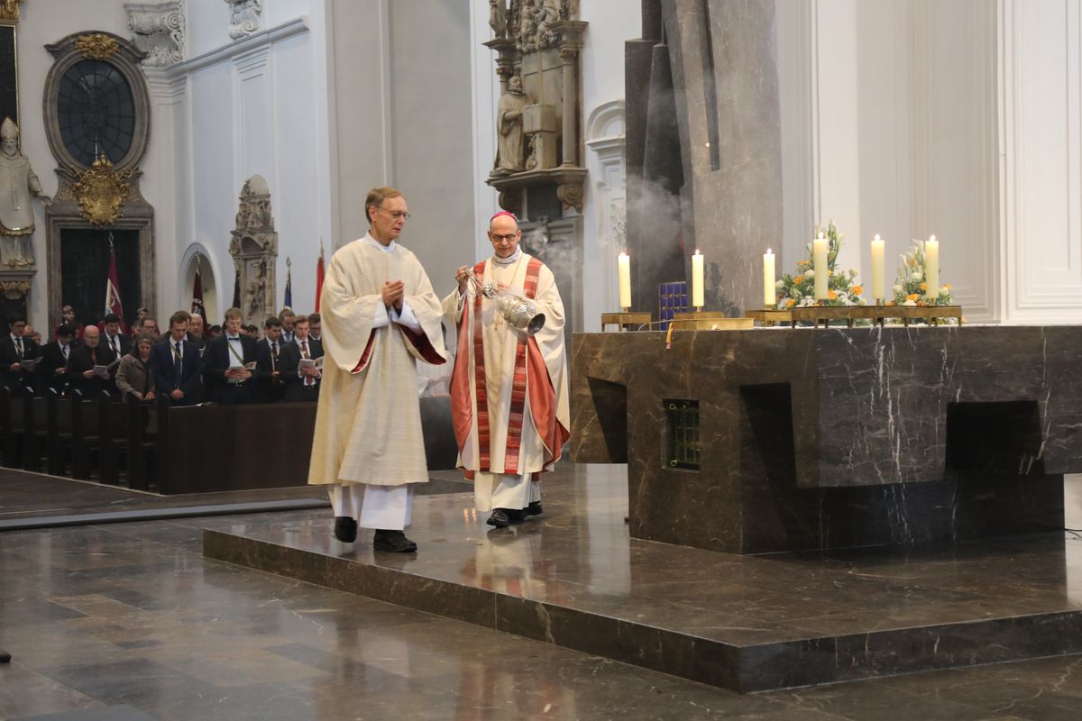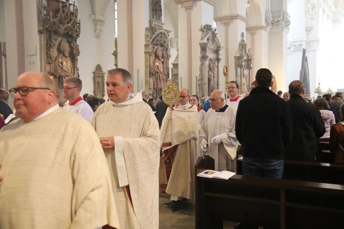 In einer Vision habe Hildegard von Bingen neben dem Kreuz die Kirche mit einem Kelch gesehen, in dem sie das Blut aus der Seite Christi auffängt. Dieser Heilige Gral diene dazu, dass „kein Tropfen des heiligen Blutes umsonst vergossen wird, sondern die Kirche ihn bewahrt und weiterträgt in der Eucharistie, um allen Menschen Heil und Versöhnung zu schenken“, erklärte der Bischof. Die Sorgfalt, die in der heiligen Messe im Umgang mit den eucharistischen Gaben aufgewandt werde, damit kein Partikel des Leibes Christi und kein Tropfen Blut verloren gehe, brauche es auch im Umgang miteinander: „Es ist der entscheidende Tropfen, der alles verändert – bei mir, bei dir und bei uns.“