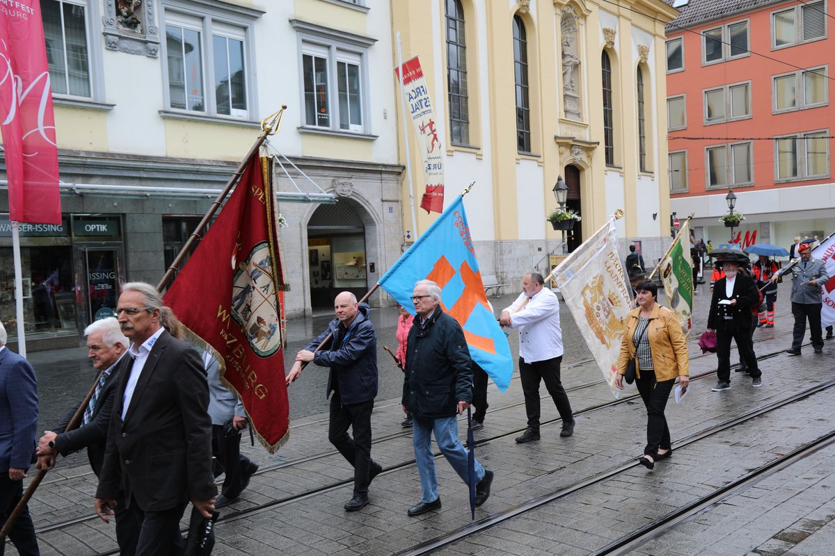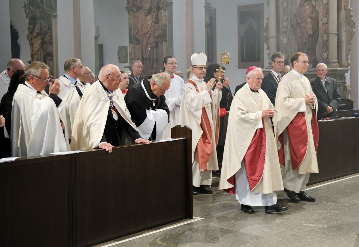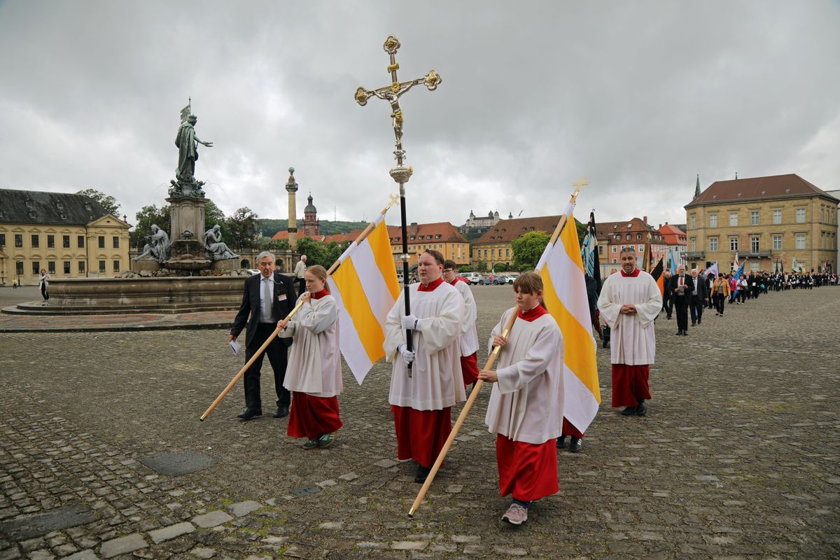 Würzburg (POW) Bei wechselhaftem Wetter haben die Katholikinnen und Katholiken im Bistum Würzburg an Fronleichnam, Donnerstag, 30. Mai, das eucharistische Brot durch die Straßen der Städte und Dörfer Unterfrankens begleitet. In Würzburg war es zu Beginn der Prozession zwar nass und kühl, doch das Wetter hielt bis zum Schluss. Hier sowie in den Städten Aschaffenburg und Schweinfurt fanden zentrale Feiern statt. „Ich danke Ihnen allen für dieses wunderbare Glaubenszeugnis“, dankte Bischof Dr. Franz Jung den Gläubigen: „Der Himmel geht mit uns, wie wir heute erlebt haben.“ Die Prozession durch die Würzburger Innenstadt im Anschluss an den Pontifikalgottesdienst im Kiliansdom stand unter dem Leitwort „Wir haben seinen Stern aufgehen sehen“. Nach Schätzungen der Veranstalter nahmen rund 700 Menschen teil. Das Pontifikalamt im Dom wurde live auf Bibel TV online, TV Mainfranken (Kabel), dem YouTube-Kanal des Bistums sowie unter www.livestreams.bistum-wuerzburg.de übertragen.