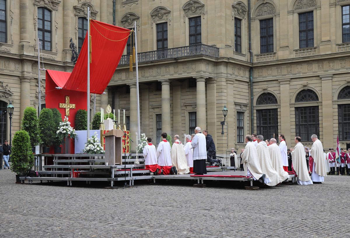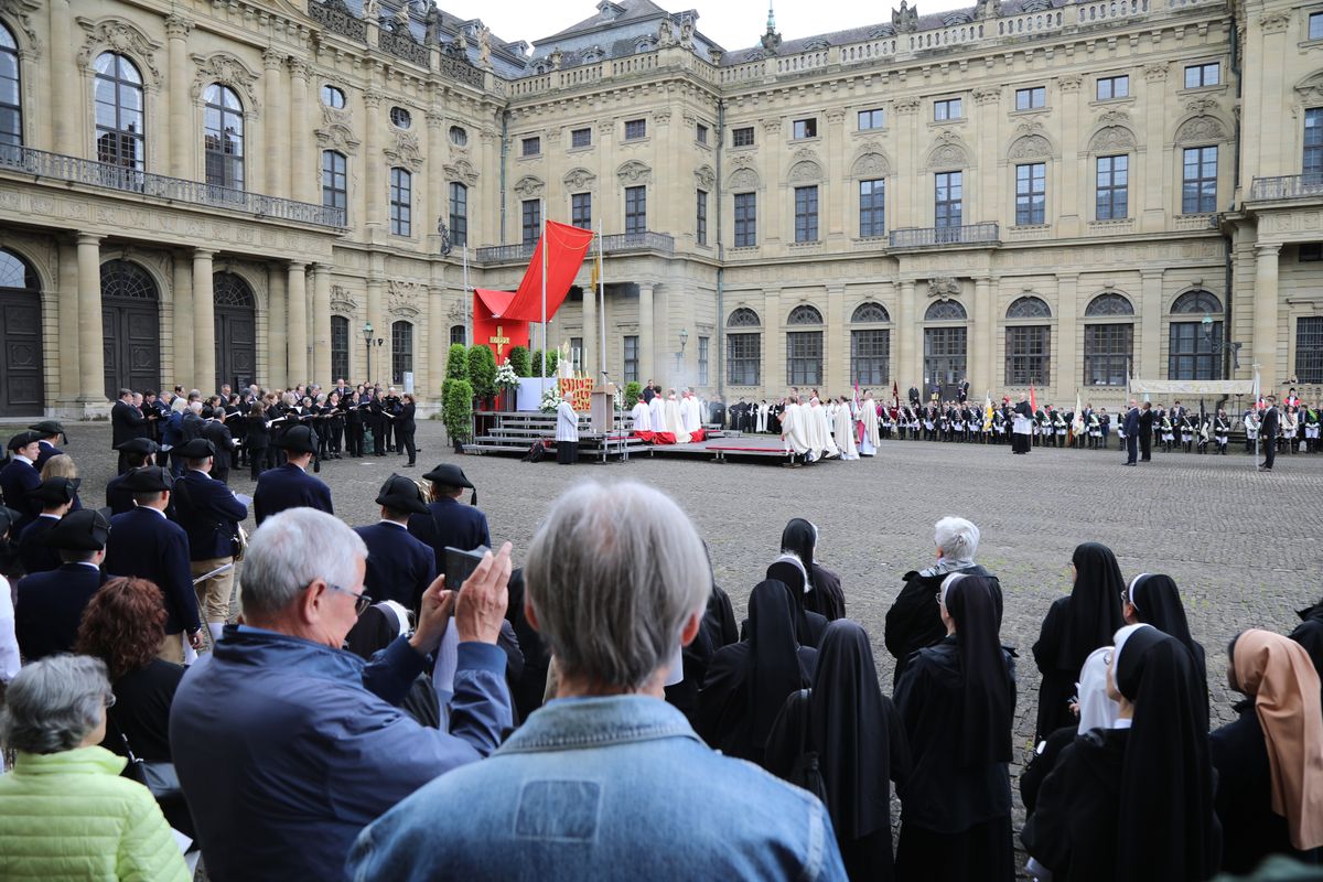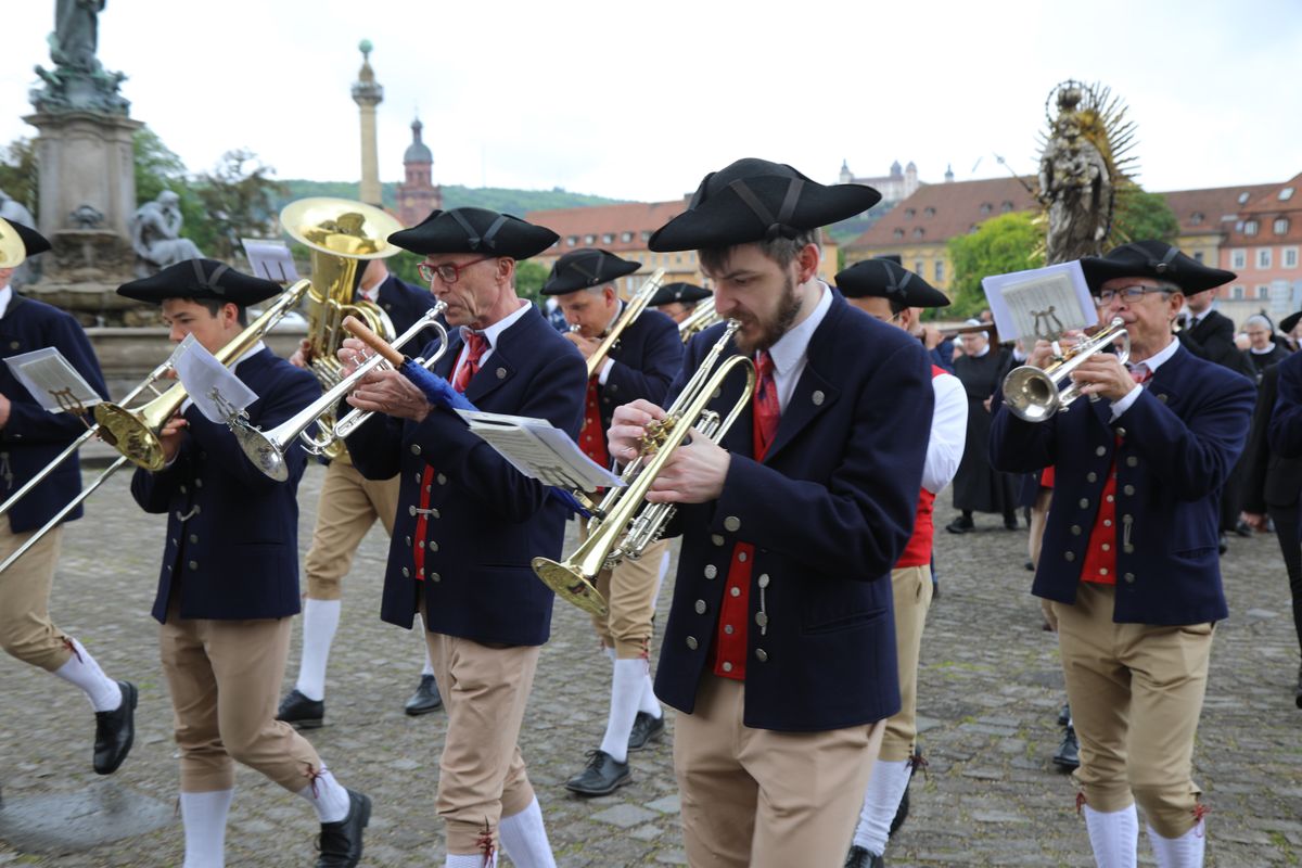 Das Pontifikalamt sowie die Feier vor dem Stationsaltar an der Residenz gestalteten der Domchor unter der Leitung von Lena Herber, Assistentin des Domkapellmeisters, sowie das Symphonische Blasorchester Kürnach unter der Leitung von Stefan Wunderlich unter anderem mit der „Missa Aeterna Christi munera“ von Giovanni P. da Palestrina, „Gehet, und verkündet der Welt“ von Max Reger und „Exsultate Deo“ von Alessandro Scarlatti. Kantorin war Juliane Zeuch, die Domorgel spielte Domorganist Professor Stefan Schmidt.