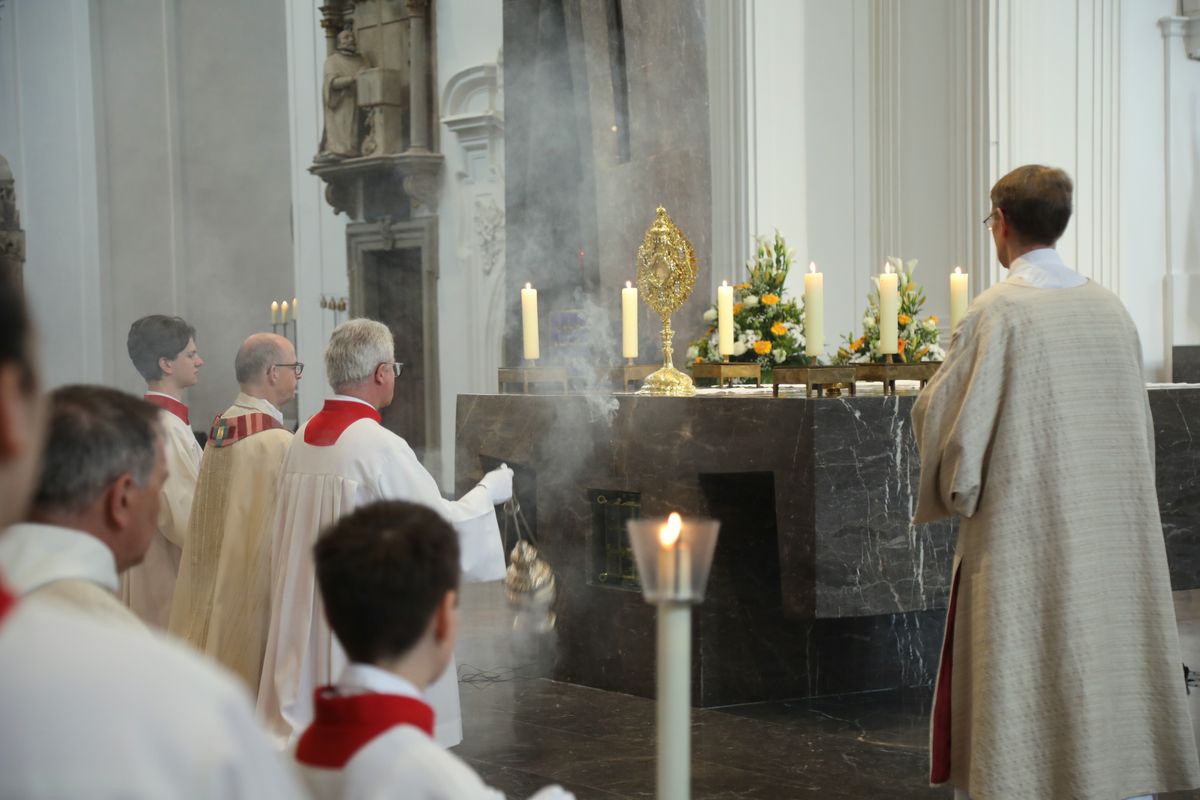 Die Tragödie des menschlichen Lebens bestehe darin, dass oftmals dieser eine Tropfen fehle: Der Tropfen Großzügigkeit, der einen dazu bringe, einen Schritt auf den anderen zu zu tun, oder der Tropfen Liebenswürdigkeit, der Wertschätzung vermittele. Der Tropfen Herzblut, der zeige, dass nicht einfach nur Routine abgespult werde, oder der Tropfen Zuwendung, der deutlich mache: Ich habe dich gesehen. Der Tropfen Versöhnlichkeit, der die Brücken nicht ganz abbreche, oder der Tropfen Geduld, der die Gelassenheit schenke, die Dinge auch mal stehen zu lassen im Vertrauen darauf, dass sie sich gut entwickeln werden. „Der eine Tropfen fehlt oft, und er macht den Unterschied“, sagte Bischof Jung. Der eine Tropfen des Blutes Christi reinige von alter Schuld, stärke gegen böse Gedanken, helfe, seelische Wunden zu schließen, und schenke die Leidenschaft für Gott.