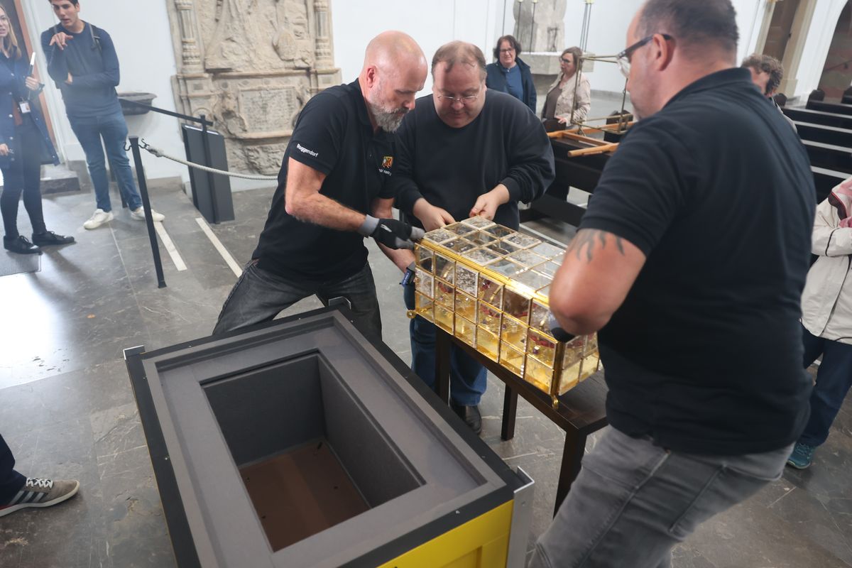 Würzburg (POW) Die Häupter der Frankenapostel sind schon vorausgereist: Am Donnerstag, 26. September, sind bei einer liturgischen Feier die Reliquien aus dem Altar des Kiliansdoms genommen und im Anschluss für den Transport via Lkw in Richtung Irland verladen worden. Insgesamt über 100 Gläubige aus dem Bistum sind von Mittwoch, 2., bis Sonntag, 6. Oktober, mit Bischof Dr. Franz Jung und Generalvikar Dr. Jürgen Vorndran auf Pilgerreise in der irischen Heimat Kilians, Kolonats und Totnans. Der Kiliansschrein wurde für die Irlandreise in einer speziellen Klimakiste verpackt und wird von einer Fach-Kunstspedition auf die grüne Insel gebracht. Vor Ort übernehmen die irischen Gastgeber die Reliquien und betreuen sie während der gesamten Reise. Wie während der Kiliani-Wallfahrtswoche bleibt der Altar des Doms an dieser Stelle leer. Es sind jedoch weitere Reliquien dort fest eingelassen.