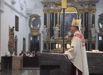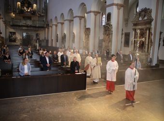 Würzburg (POW) Mit einem Pontifikalgottesdienst mit Bischof Dr. Franz Jung im Kiliansdom und einem Festakt im Burkardushaus hat die Mitarbeitervertretung (MAV) des Bischöflichen Ordinariats Würzburg am Montag, 13. Juli, ihr 50. Jubiläum begangen „Das ist eine Erfolgsgeschichte im Blick auf das Bistum, aber auch ein Stück Lerngeschichte der Kirche“, betonte der Bischof im Gottesdienst. „Ausdrücklich danke ich Ihnen für das ausgesprochen konstruktive Miteinander und für Ihre Bereitschaft, alle anstehenden Fragen offen und transparent mit dem Dienstgeber zu klären, ohne es zum Bruch kommen zu lassen. Ich weiß das sehr zu schätzen.“ Das Mitdenken und Mitsorgen sei aktuell besonders gefragt, da es gelte, sich neu aufzustellen angesichts geringer werdender Mittel. „In der Krise zeigt sich, was man aneinander hat und wie sich Abläufe bewähren, die man über Jahre eingeübt und gepflegt hat“, sagte der Bischof.
