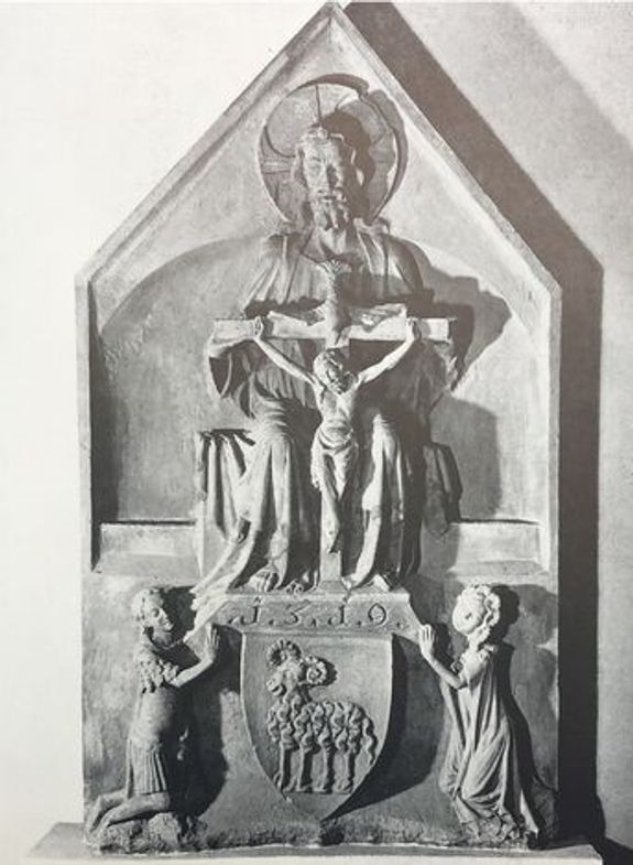 Von ganz unten wandert nun unser Blick in die Mitte des Gedenksteins. In der klassischen Darstellung des sogenannten Gnadenstuhls sieht man Gottvater, der der Christenheit den gekreuzigten Sohn zur Verehrung darbietet.