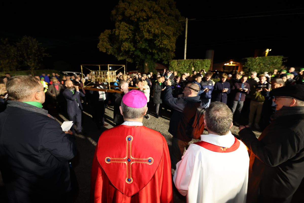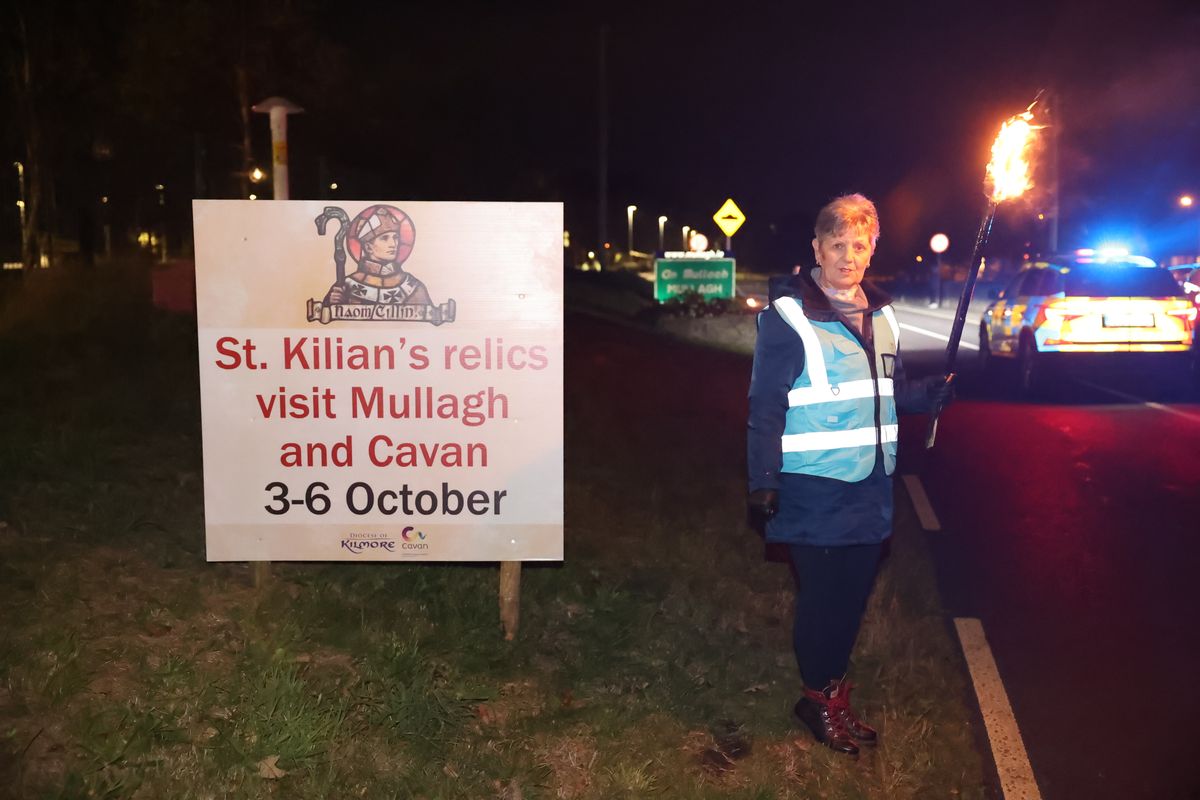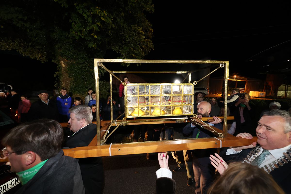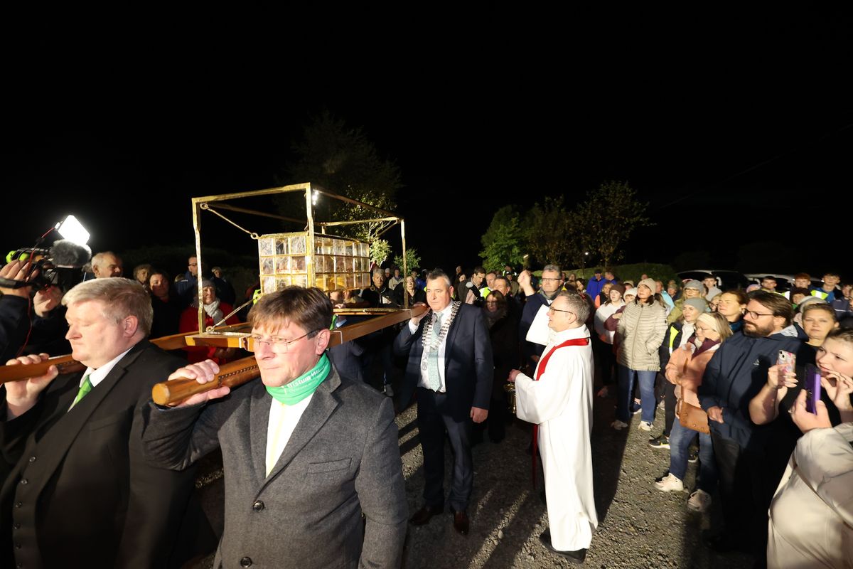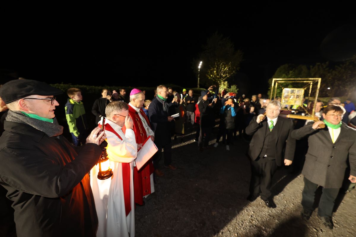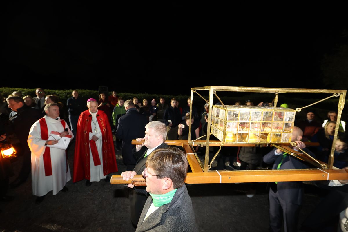 Dann naht das von Polizeiautos eskortierte Transportfahrzeug mit dem Reliquienschrein der Frankenapostel mit dem Nummernschild „Kilian 2024“. Deutsche und Iren tragen die Häupter in die Mitte der auf dem Gelände an der Quelle versammelten Gläubigen. Der Chor der örtlichen Pfarrei singt irische Weisen. Father Paul Prior, Pfarrer von Mullagh, besprengt die Reliquien mit Weihwasser. Auf der abgesperrten Straße setzt sich die Prozession in Richtung Mullagh in Bewegung. Zur Linken ist in der Ferne ein großes Feuer auf dem Berg von Mullagh zu sehen. Sphärischer irischsprachiger Gesang und der tiefe Klang von Hörnern schallen aus großen Lautsprechern beim Feuer herunter und umgeben den stillen Zug mit einer besonderen Stimmung. „Wir haben diesen Abend so lange herbeigesehnt“, raunt der Ortspfarrer seinem Nebenmann zu.