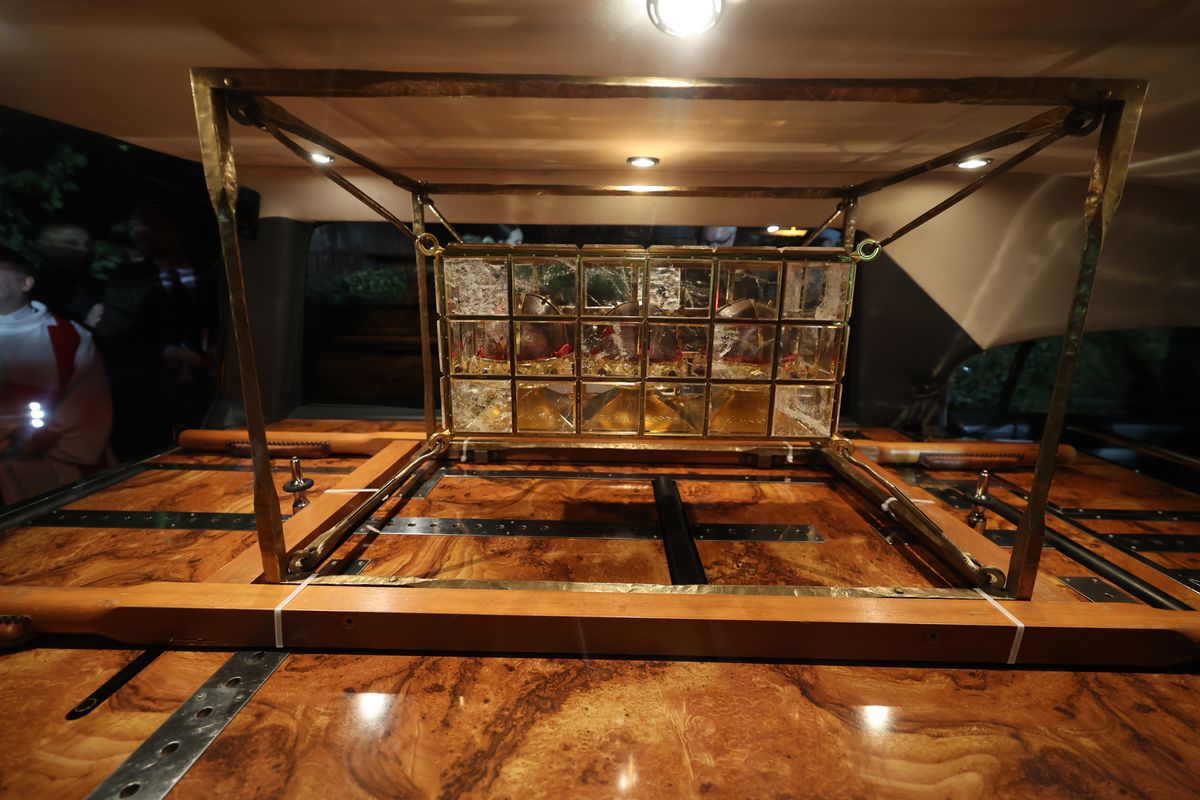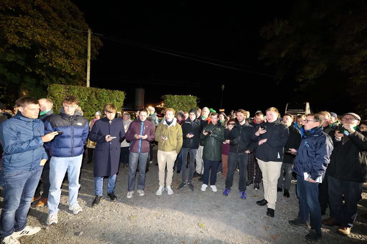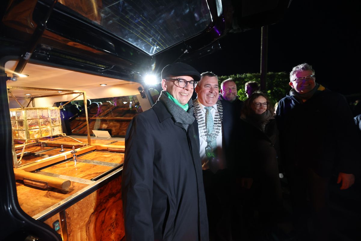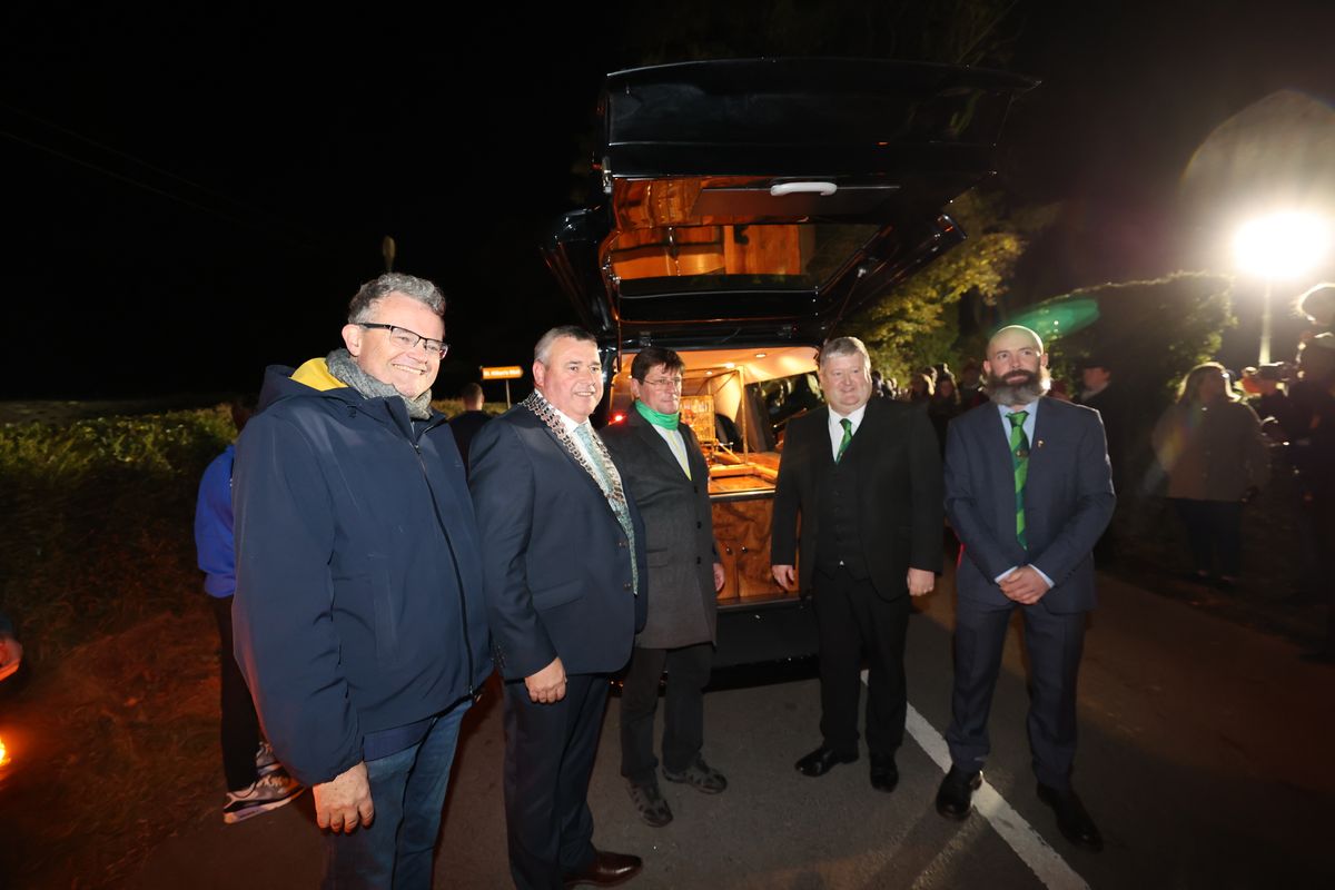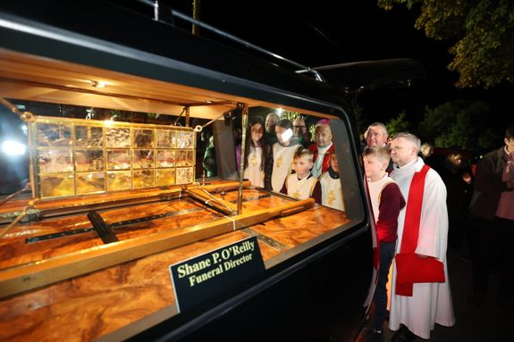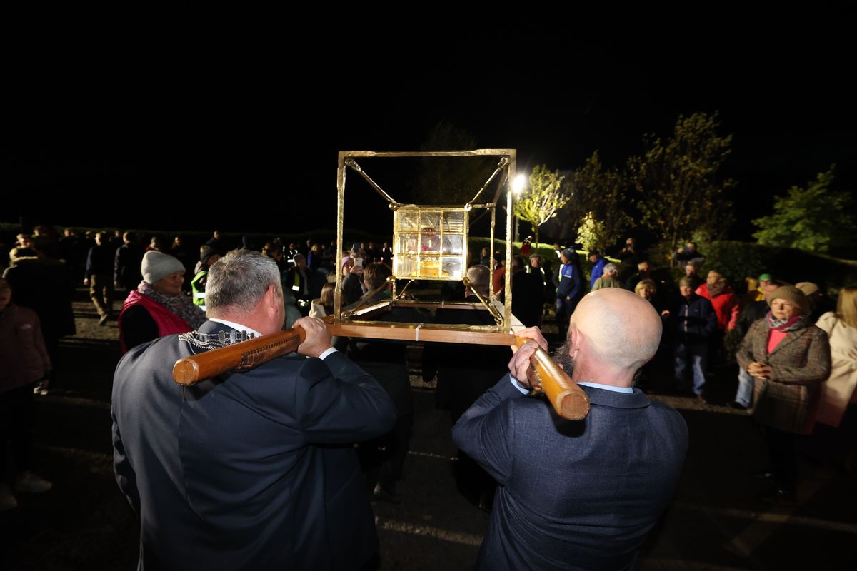 Dann naht das von Polizeiautos eskortierte Transportfahrzeug mit dem Reliquienschrein der Frankenapostel mit dem Nummernschild „Kilian 2024“. Deutsche und Iren tragen die Häupter in die Mitte der auf dem Gelände an der Quelle versammelten Gläubigen. Der Chor der örtlichen Pfarrei singt irische Weisen. Father Paul Prior, Pfarrer von Mullagh, besprengt die Reliquien mit Weihwasser. Auf der abgesperrten Straße setzt sich die Prozession in Richtung Mullagh in Bewegung. Zur Linken ist in der Ferne ein großes Feuer auf dem Berg von Mullagh zu sehen. Sphärischer irischsprachiger Gesang und der tiefe Klang von Hörnern schallen aus großen Lautsprechern beim Feuer herunter und umgeben den stillen Zug mit einer besonderen Stimmung. „Wir haben diesen Abend so lange herbeigesehnt“, raunt der Ortspfarrer seinem Nebenmann zu.
