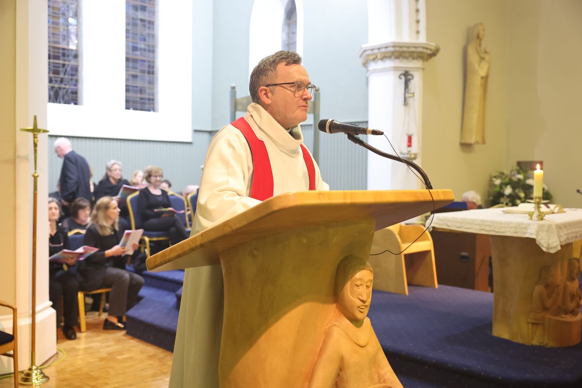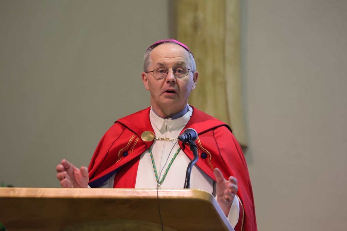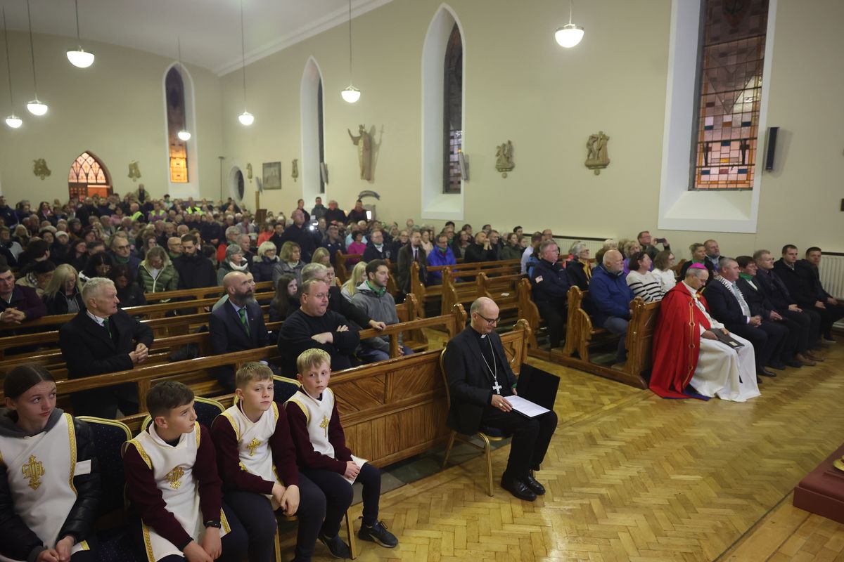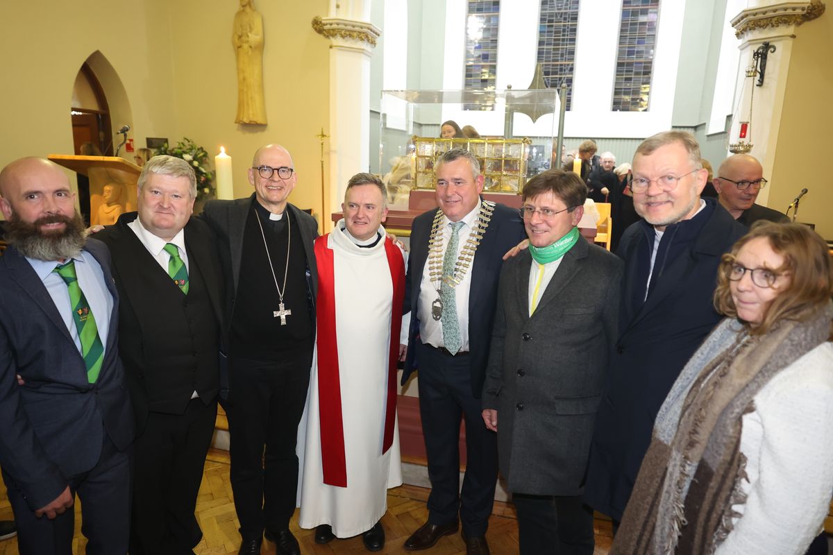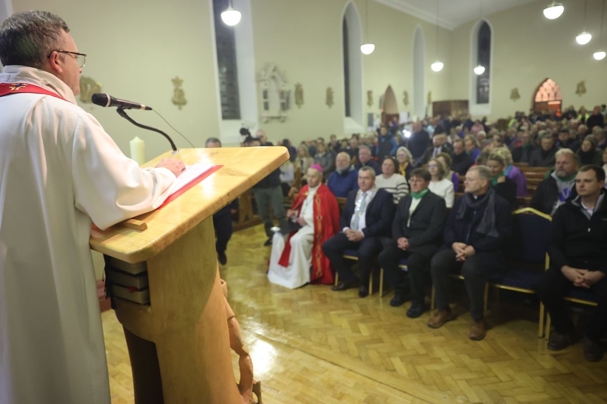 „Uns erfüllt heute eine besondere feierliche Stimmung. Kilian ist mit seinen Gefährten nach Hause zurückgekehrt. Heute sind wir alle Sankt Kilian“, sagt Father Prior. Die Hoffnung, dass Gott den Menschen Glauben und Mut schenkt, verbinde die Menschen der Gegenwart mit dem Frankenapostel und seinen Gefährten. Bischof Hayes legt in seiner Predigt die Berufung der Jünger Jesu am See Genesareth aus. „Wie die Jünger sind wir aufgerufen, uns mit Jesus auf den Weg zu machen, auch wenn wir nicht wissen, was uns unterwegs erwartet.“ Das bedeute auch, den Nächsten vorbehaltlos auf der Pilgerschaft zu begleiten. „Dazu fordert uns Papst Franziskus auf“, betont Bischof Hayes. Schließlich dankt er Bischof Jung, dem Würzburger Domkapitel und der ganzen Diözese Würzburg, die den lang gehegten Wunsch der Rückkehr der Reliquien Kilians und seiner Gefährten nach Mullagh ermöglicht haben.