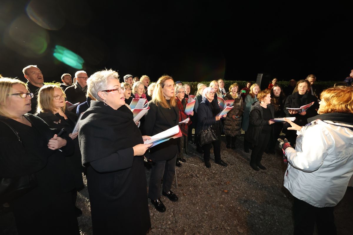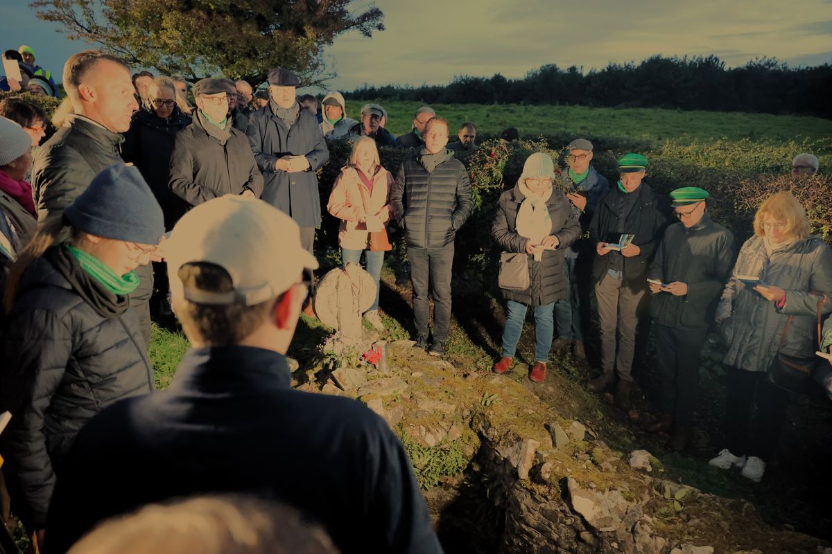 Knapp eine halbe Stunde zuvor haben sich etwa einen Kilometer vom See entfernt an diesem Donnerstagabend, 3. Oktober, die Würzburger Pilgergruppe und zahlreiche Irinnen und Iren an der von mobilen Scheinwerfern hell erleuchteten Sankt Kiliansquelle versammelt. Nicht nur wegen der Verbindung mit dem Frankenapostel ist die äußerlich unscheinbare Wasserstelle ein wichtiger Ort. Sie war auch für die Katholiken der Gegend ein wichtiger Versammlungsort, als während der englischen Besatzung jede öffentliche Ausübung des katholischen Glaubens untersagt war. Es erklingen das Kilianslied „Wir rufen an den teuren Mann“ und das von einem Iren verfasste Kiliansgebet. Darin heißt es: „Der See, der Hügel, und die Quelle in Mullagh, die Du geliebt und doch verlassen hast, erinnern uns bis heute an Deine mutige Pilgerschaft für Christus. Mögen Deine verbindende Reise und Dein heldenhaftes Martyrium uns im Geist erfüllen und tragen.“ Als Zeichen der Verbundenheit zwischen Deutschland und Irland pflanzen die Bischöfe Martin Hayes und Dr. Franz Jung einen jungen Eichenbaum, gezogen aus einem Samen aus Kürnach.