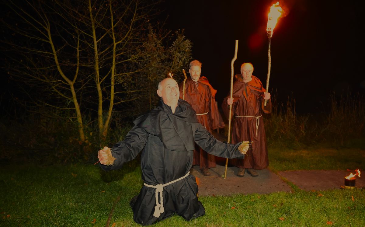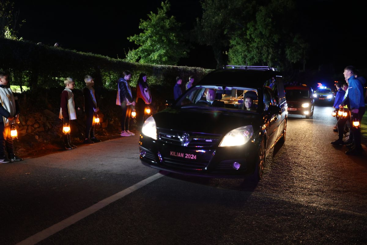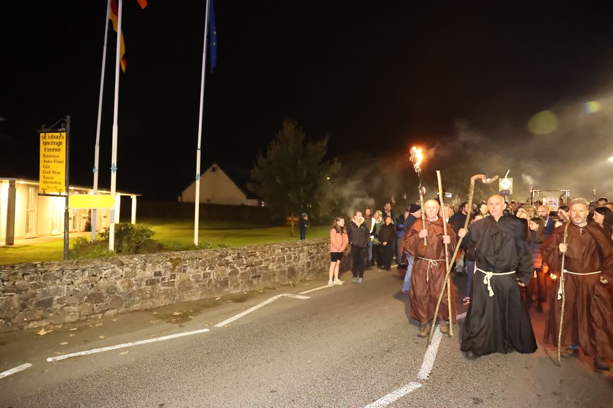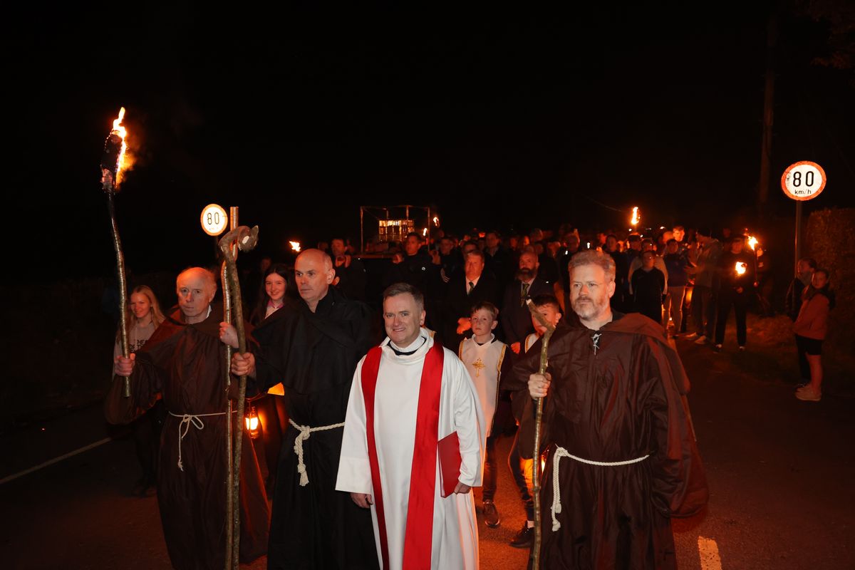 Am See setzen sich die drei Mönche an die Spitze der Gruppe. „Auf zur Kirche“, ruft der Mönch mit dem Bischofsstab. Die Jungen Herren der Würzburger Domsingknaben unter der Leitung von Domkapellmeister Alexander Rüth sorgen unter anderem mit dem irischen Halleluja für die musikalische Umrahmung. Alle paar Meter entfernt stehen links und rechts der Straße Frauen und Männer mit Fackeln und beleuchten so den Weg durch die Nacht. Insgesamt knapp drei Kilometer zieht die Prozession vom Ausgangspunkt zum Ziel. In der Kilianskirche von Mullagh wird der Schrein der Märtyrer aus dem Tragegestell genommen und vor dem Altar aufgestellt.