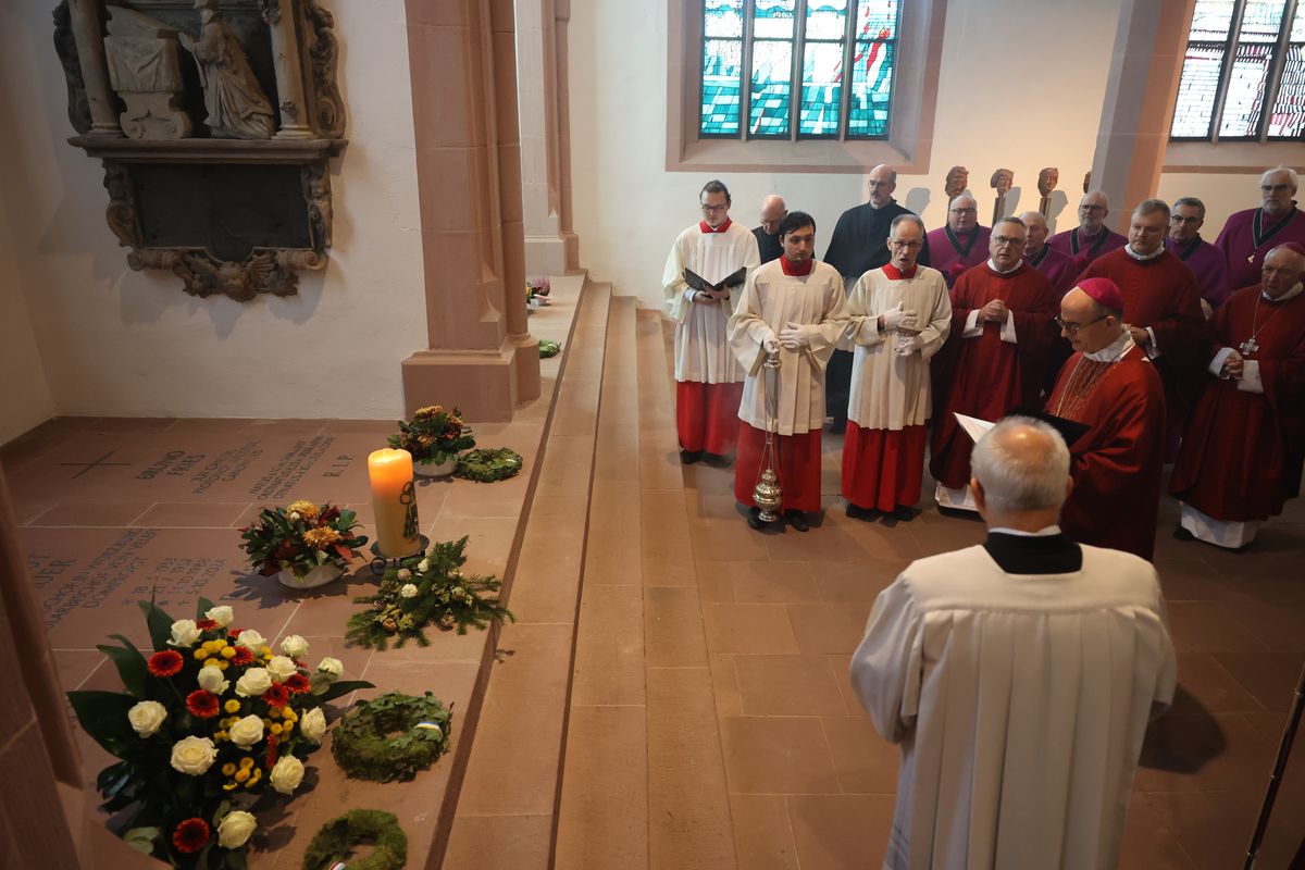 Würzburg (POW) Die besonderen Verdienste von Generalvikar Dr. Karl Hillenbrand und Weihbischof em. Alfons Kempf hat Bischof Dr. Franz Jung am Freitag, 22. November, bei einem Gedenkgottesdienst im Würzburger Kiliansdom gewürdigt. Hillenbrand starb 2014, Kempf 1999. „Die Menschen im Bistum Würzburg wissen bis heute, was sie an diesem Priester, Seelsorger und Generalvikar verloren haben“, sagte Bischof Jung. Weihbischof Kempf, der fast 300.000 Kindern und Jugendlichen das Sakrament der Firmung gespendet hat, sei bistumsweit vielen Menschen als guter Hirte in Erinnerung. Nach dem Gottesdienst segnete der Bischof die Gräber der beiden Verstorbenen im Domkreuzgang beziehungsweise der Sepultur.