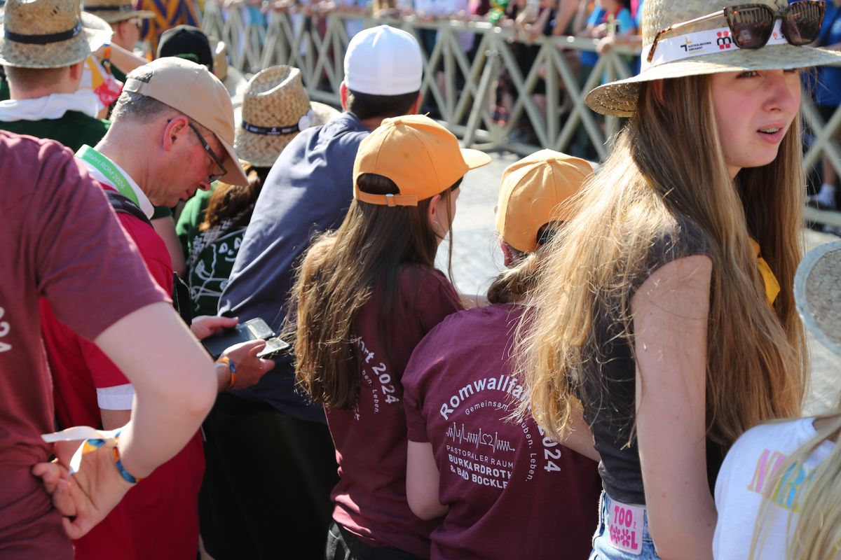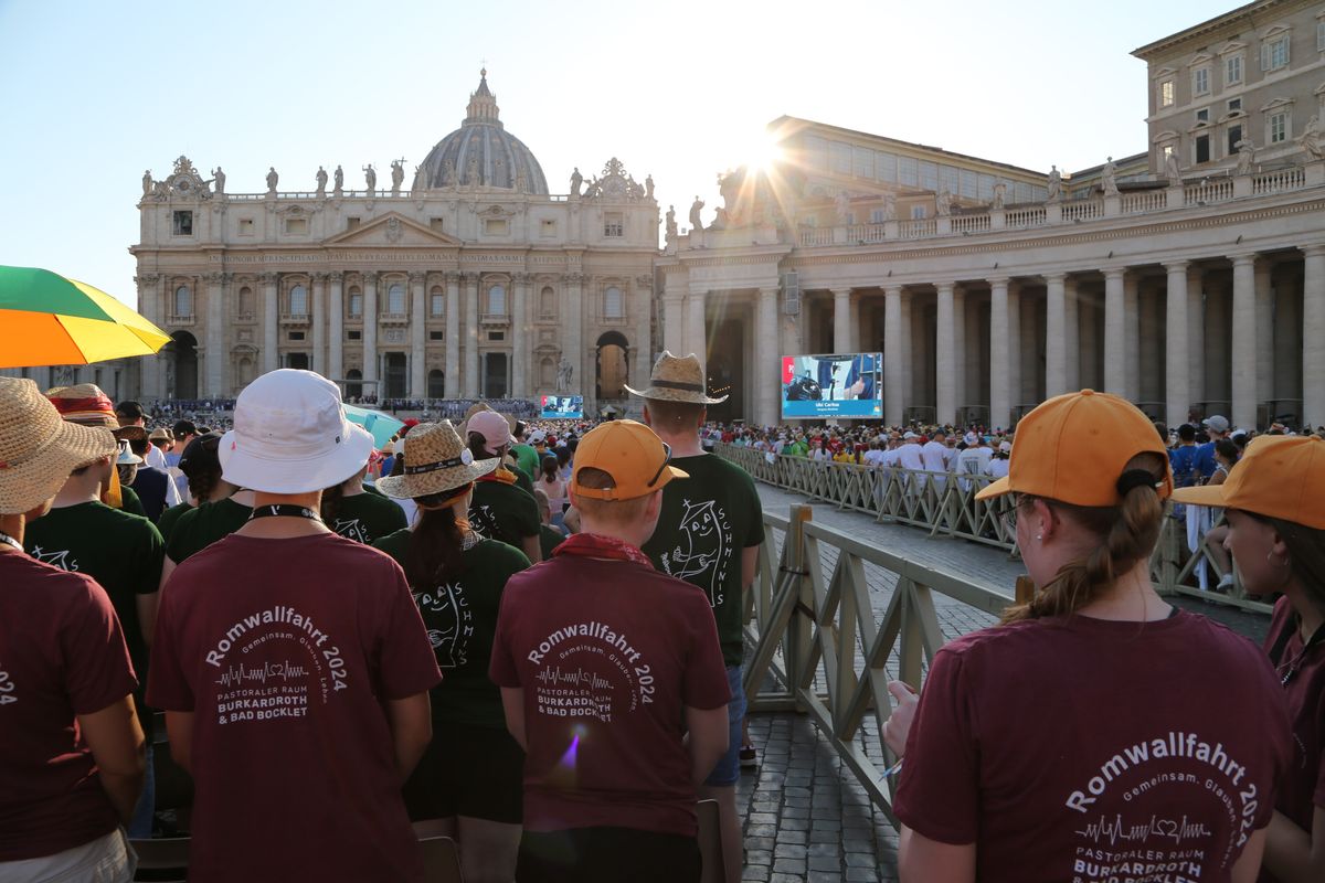 Würzburg/Bad Bocklet/Burkardroth/Rom (POW) Etwa 40 Jugendliche, viele davon in dunkelroten T-Shirts mit der Aufschrift „Romwallfahrt 2024 – Pastoraler Raum Burkardroth Bad Bocklet“, drängen sich auf dem Petersplatz in Rom vor einer Barrikade. Um sie herum, in abgegrenzten Bereichen, stehen tausende weitere Jugendliche. Da ruft ein Junge, der auf einen der Plastikstühle gestiegen ist: „Er ist da drüben!“ Wenige Minuten später kommt der Moment, auf den die Ministrantengruppe aus Burkardroth und Bad Bocklet seit über zwei Stunden in der prallen Sonne wartet: Das weiße Papamobil mit Papst Franziskus biegt in den Durchgang hinter der Absperrung. Die Jugendlichen klatschen, winken und zücken ihre Handys. Ein paar Jungen und Mädchen wedeln ihre Pilgertücher wild durch die Luft.