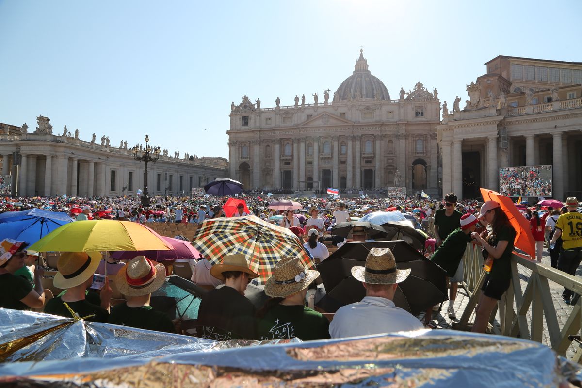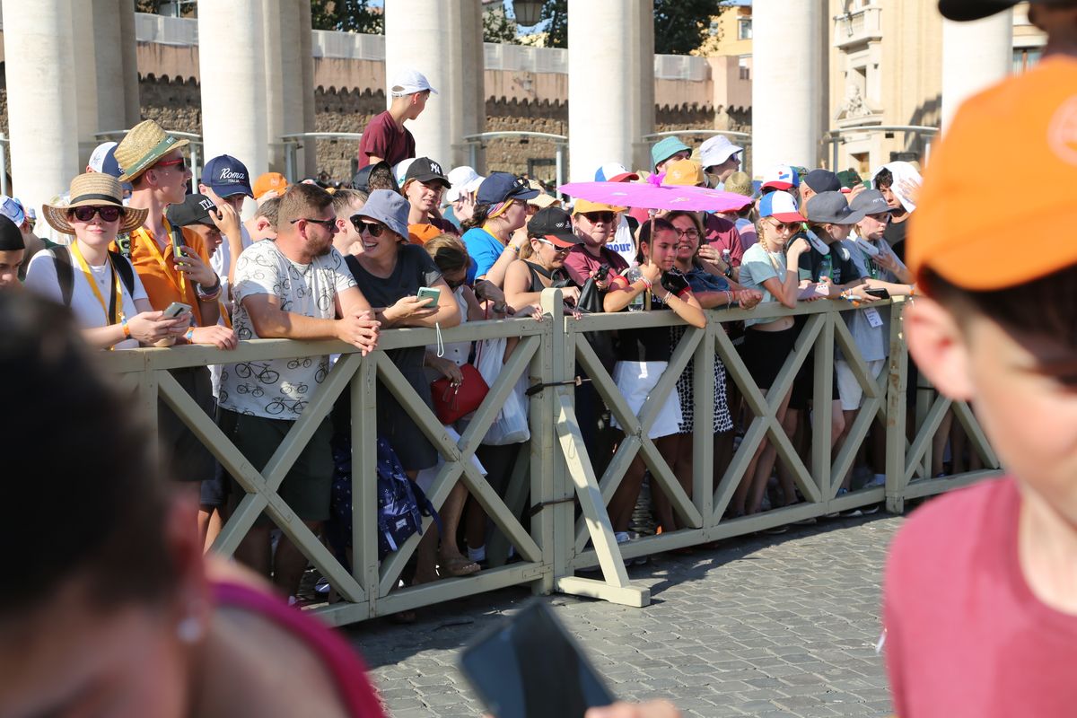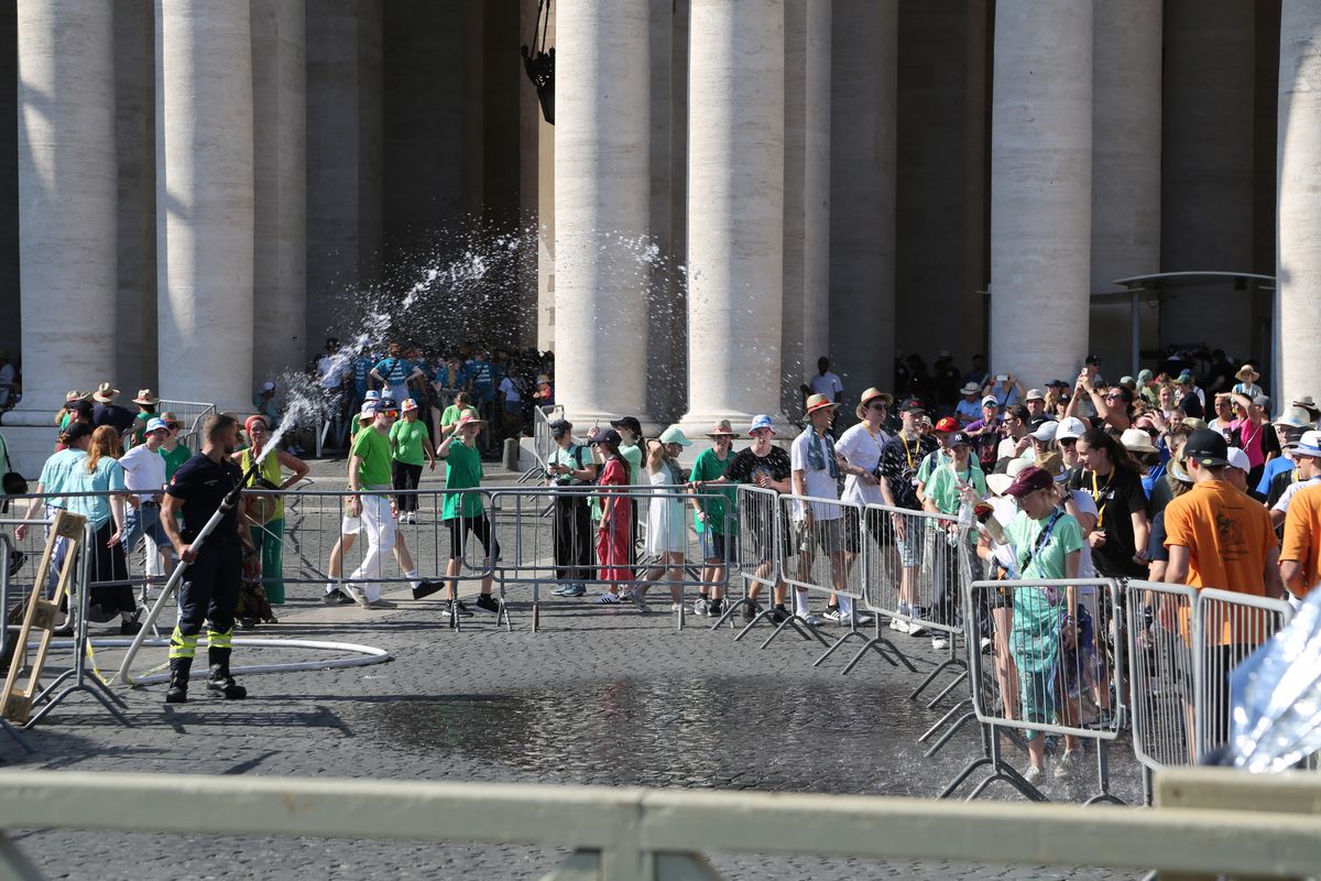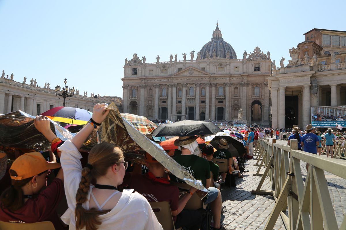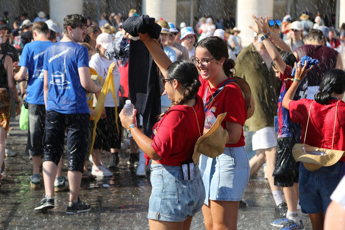 Es ist Dienstagnachmittag, 30. Juli, und die Jugendlichen, die sich hier auf dem Petersplatz versammelt haben, sind Teil der 13. internationalen Ministrantenwallfahrt nach Rom. Etwa 50.000 Ministrierende und ihre Begleitpersonen aus rund 20 Ländern sind es laut Informationen der Deutschen Bischofskonferenz, rund 1600 davon aus dem Bistum Würzburg. Sie verbindet ein Ziel: Sie wollen den Papst von Nahem sehen. „Es wäre schon cool, den auch so zu treffen, nicht nur auf Bildern“, sagt Ministrant Valentin Fehr (13) aus der Gruppe aus Burkardroth vor der Audienz. Sein Freund Philipp Schmitt (13) ergänzt, er wolle zuhause erzählen, er habe den Papst aus zwei bis drei Metern Entfernung gesehen. Deshalb war ihre Gruppe auch schon früh auf dem Platz. Ausgestattet mit Isolierdecken aus dem Erste-Hilfe-Kasten und ausreichend Wasser, haben sie in der römischen Hitze ausgeharrt. Zwischendurch kam auch die Abkühlung durch die Feuerwehr gelegen. Diese „hat uns nass gemacht, das war schön kühl“, sagt Fehr, der sich mit Schmitt direkt unter den Wasserstrahl gestellt hat.