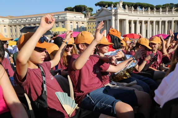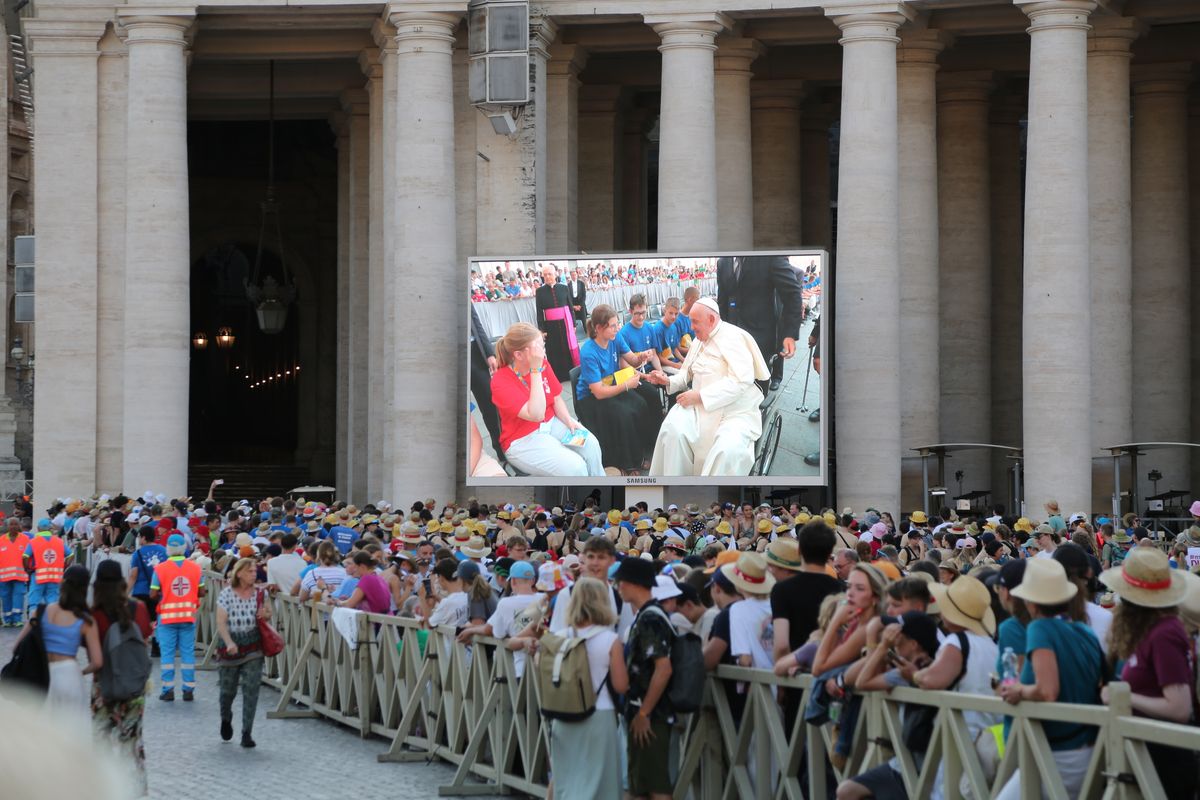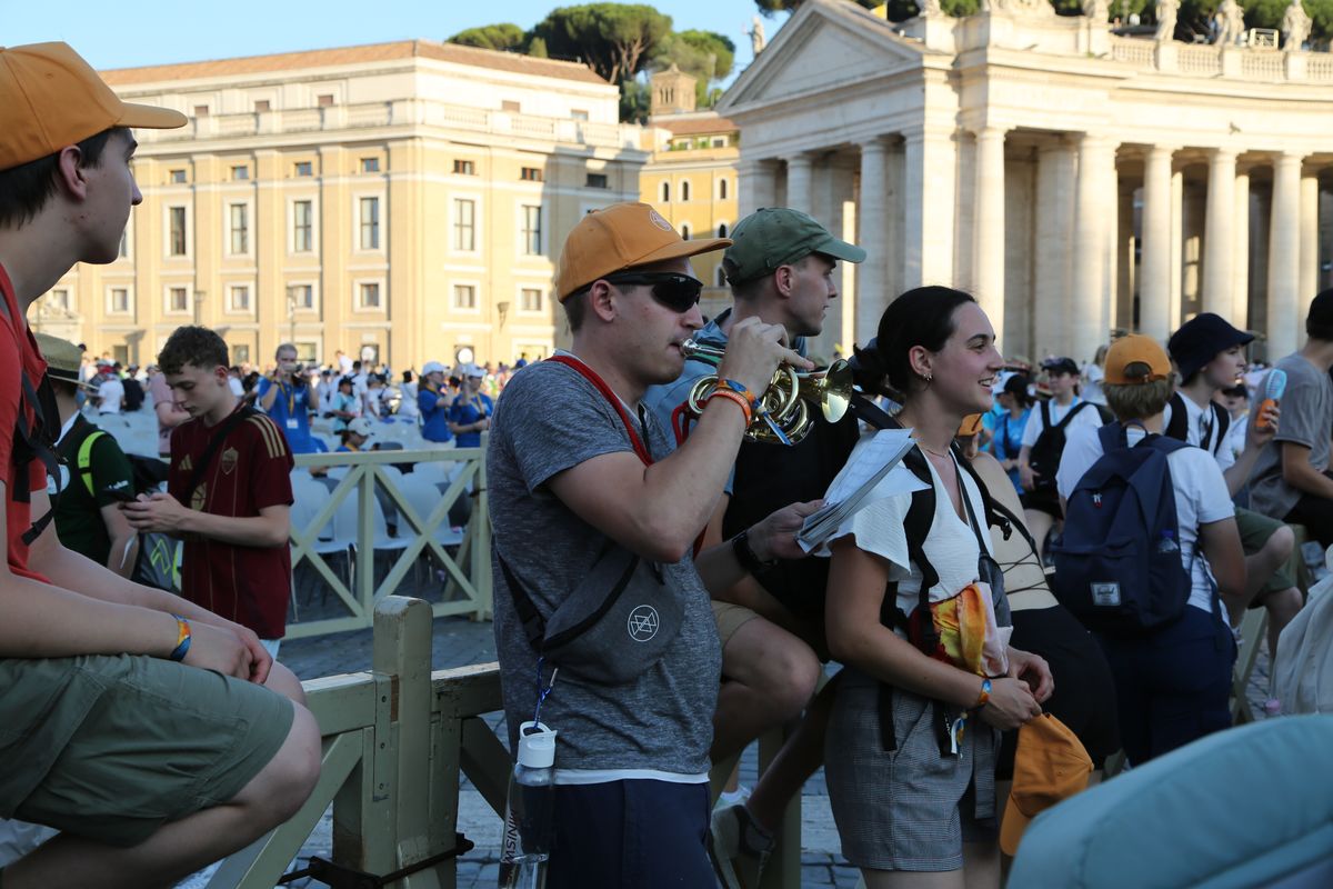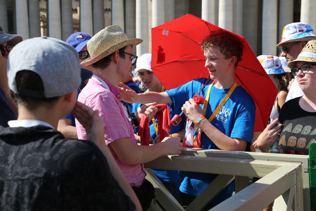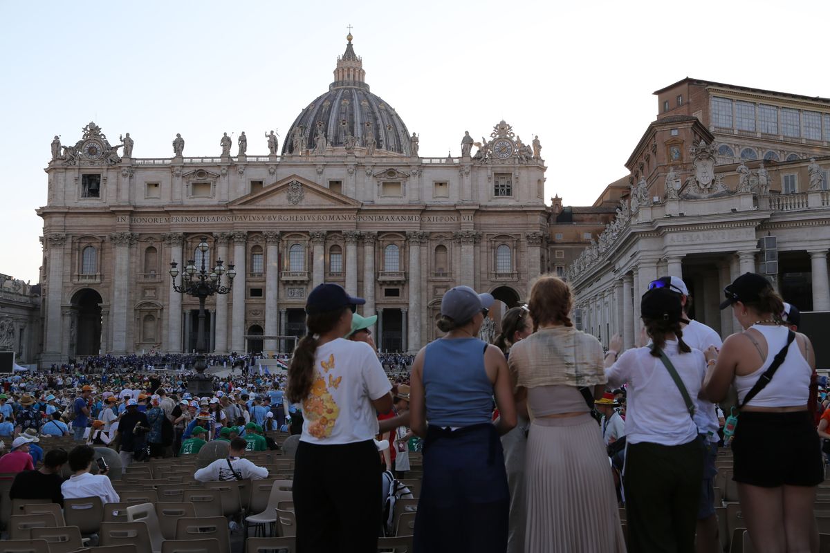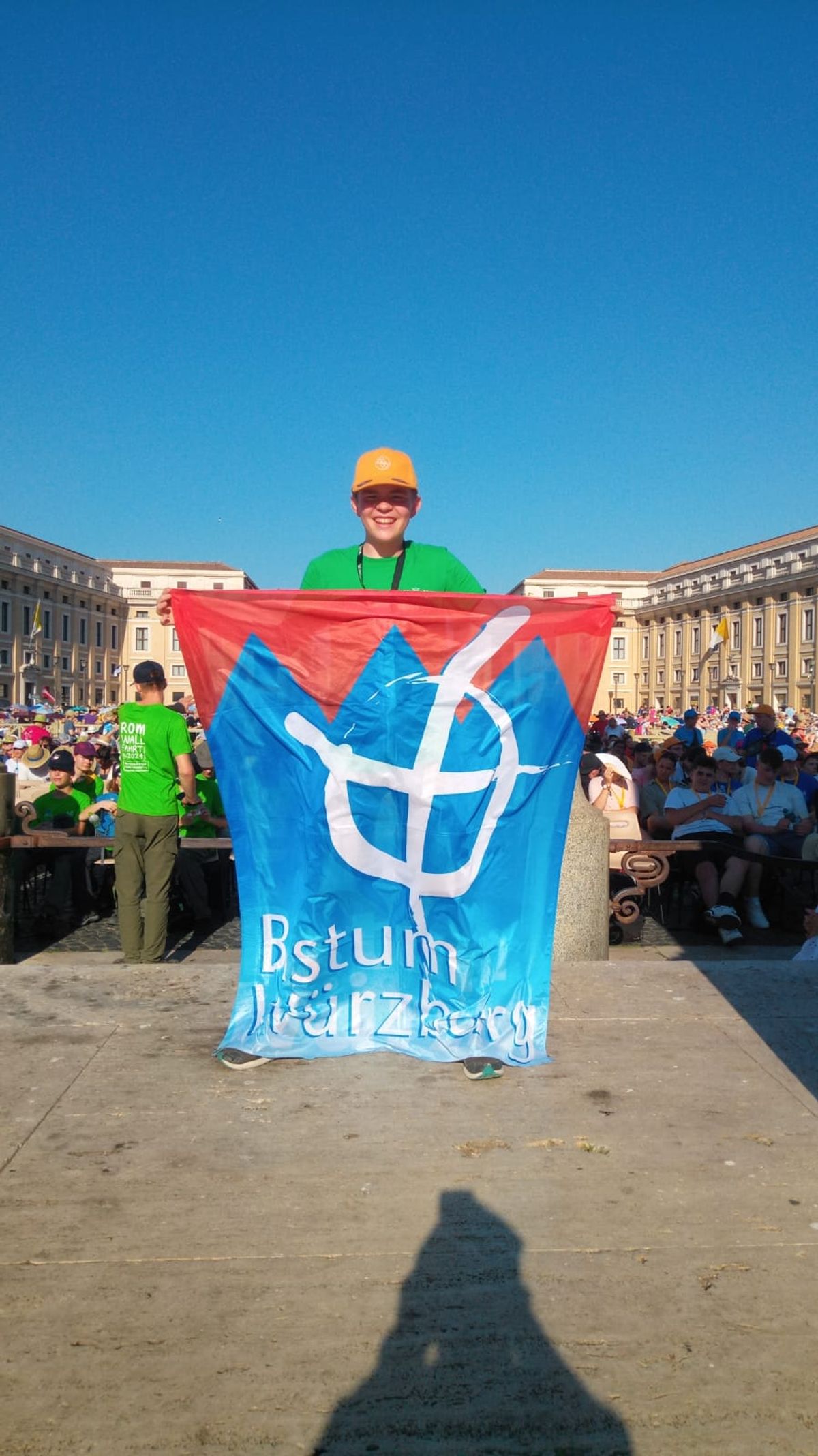 Die ausgelassene Audienzstimmung ebbt nicht ab, als Papst Franziskus kurz vor 19 Uhr den Petersplatz verlässt. Es werden Gruppenbilder gemacht. Ein Ministrant aus Lengfeld mit oranger Wallfahrtskappe hat sein Blasinstrument ausgepackt und spielt zu der Melodie von „With you, mit dir, contigo“. Einige Menschen stimmen in den Refrain mit ein. Eine Gruppe Mädchen steht auf den Stühlen, tanzt und klatscht im Takt, während etwas weiter eine österreichische Teilnehmerin die vorbeikommenden Minis abklatscht. Auch durch die Pilgertücher kommen die Teilnehmenden der verschiedenen Nationen in Kontakt. Rot-weiße werden gegen schwarz-rot-gelbe getauscht. Ein deutscher Teilnehmer verkündet beim Verlassen des Petersplatzes, er müsse zu den Schweizer Pilgerinnen und Pilgern – das Tuch wolle er noch haben. Besonders begehrt sind natürlich auch die weiß-gelben Vatikan-Tücher, die einige der Helfenden an den Wasserstationen geschenkt bekommen, erzählt Annika Herzog von der Wallfahrtsleitung des Bistums Würzburg nach der Audienz. Und so verlässt eine bunte Menschentraube im Abendlicht den Petersplatz. Die Papstaudienz sei „etwas, das in Erinnerung bleibt“, sagt Ministrantin Romy Leiber.
