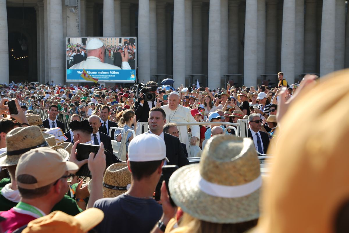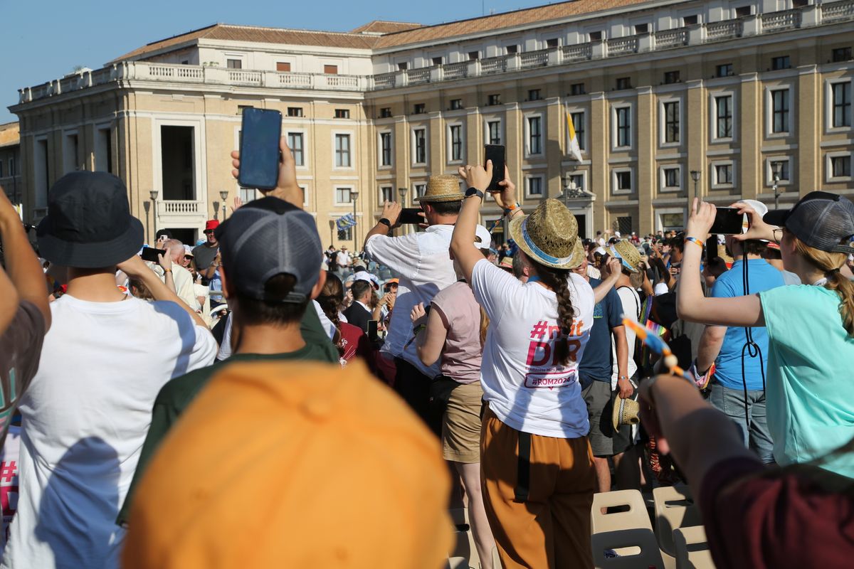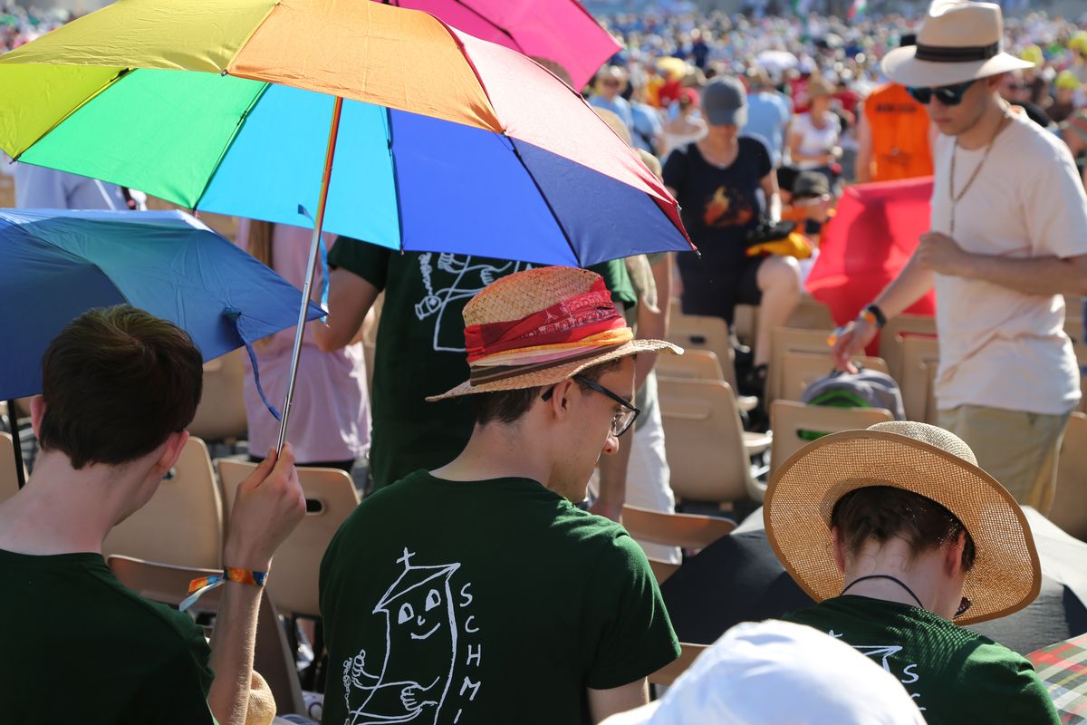 Spätestens als Papst Franziskus die Messe beginnt und der Chor die ersten Lieder singt, kommt die Menge wieder in Bewegung. Es wird geklatscht, mitgewunken, und vor allem den Wallfahrtssong „With you, mit dir, contigo“ können manche bereits mitsingen. Es folgen Ansprachen und Fürbitten von Ministrierenden aus unterschiedlichen Ländern – unter anderem auf Deutsch, Italienisch, Französisch.