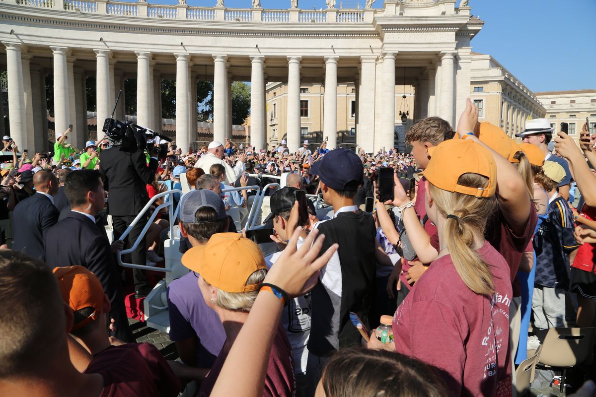 Romy Leiber (13) sagt, sie glaube, dass die Audienz ihren Glauben zumindest ein bisschen bereichert hat. „So etwas erlebt man ja nicht alle Tage.“ Für Fehr hat sich die Romfahrt auf jeden Fall gelohnt. „Der Papst ist direkt vor unserer Nase vorbeigefahren. Also es war ein cooles Erlebnis.“ Schmitt wusste schon im Vorhinein ein bisschen, was ihn erwartet. Vor einigen Jahren hat sein Onkel an einer Papstaudienz teilgenommen und dem Papst die Hand geschüttelt. „Davon gibt es sogar ein Bild“, erzählt der 13-Jährige. Die Hand des Papstes hat er selbst zwar nicht gehalten, trotzdem lautet sein Fazit: „Die Stimmung war sehr gut. Hat sehr, sehr Spaß gemacht.“ Mina Sell (15) freut sich außerdem, dass mit der Zeit der Schatten über den Platz gezogen ist.