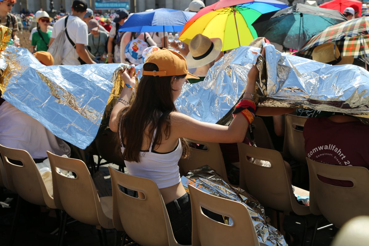 Nun ist es also so weit: Der Papst fährt in Runden durch die tausenden von Minis auf dem Platz und winkt auch den Mädchen und Jungen aus Burkardroth und Bad Bocklet zu, die direkt hinter der Absperrung stehen. „Er hat uns gesegnet, er hat mir direkt in die Augen geschaut“, fasst Fehr die Begegnung später zusammen. Während ein paar der Jugendlichen überlegen, wo sie noch einen zweiten Blick auf Papst Franziskus erhaschen können, verkriechen sich andere wieder unter die Decken. 36 Grad und pralle Sonne können anstrengend sein.