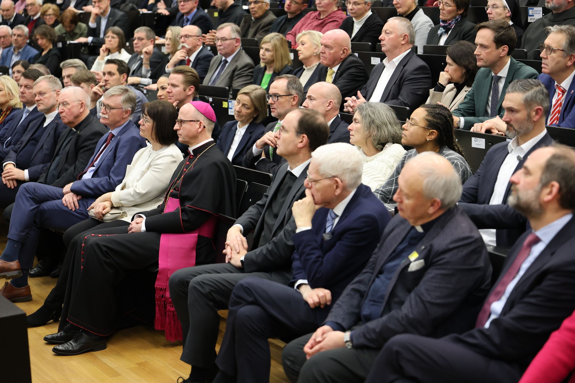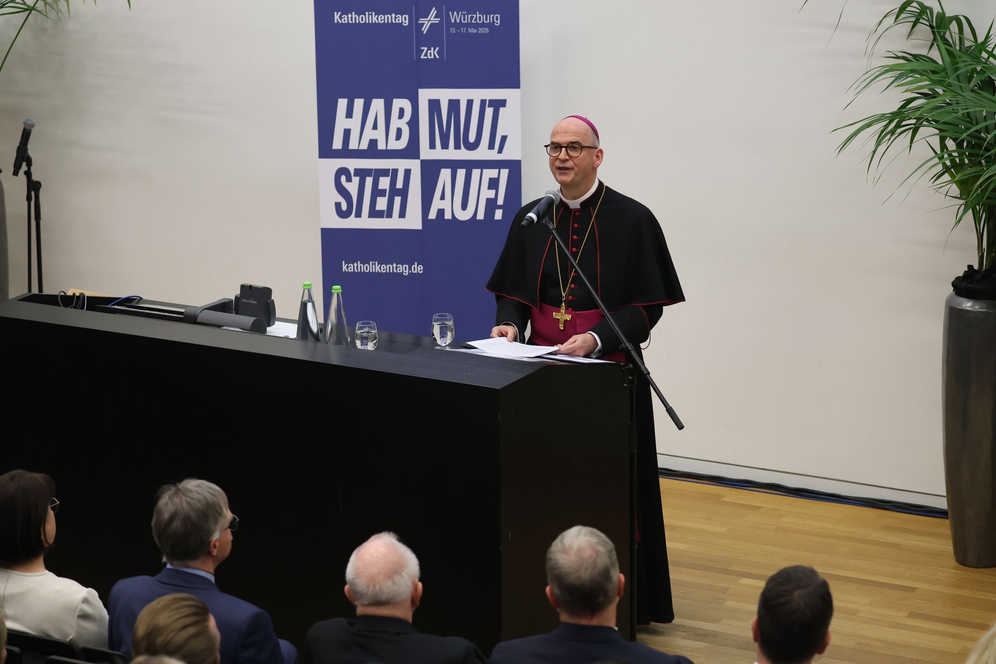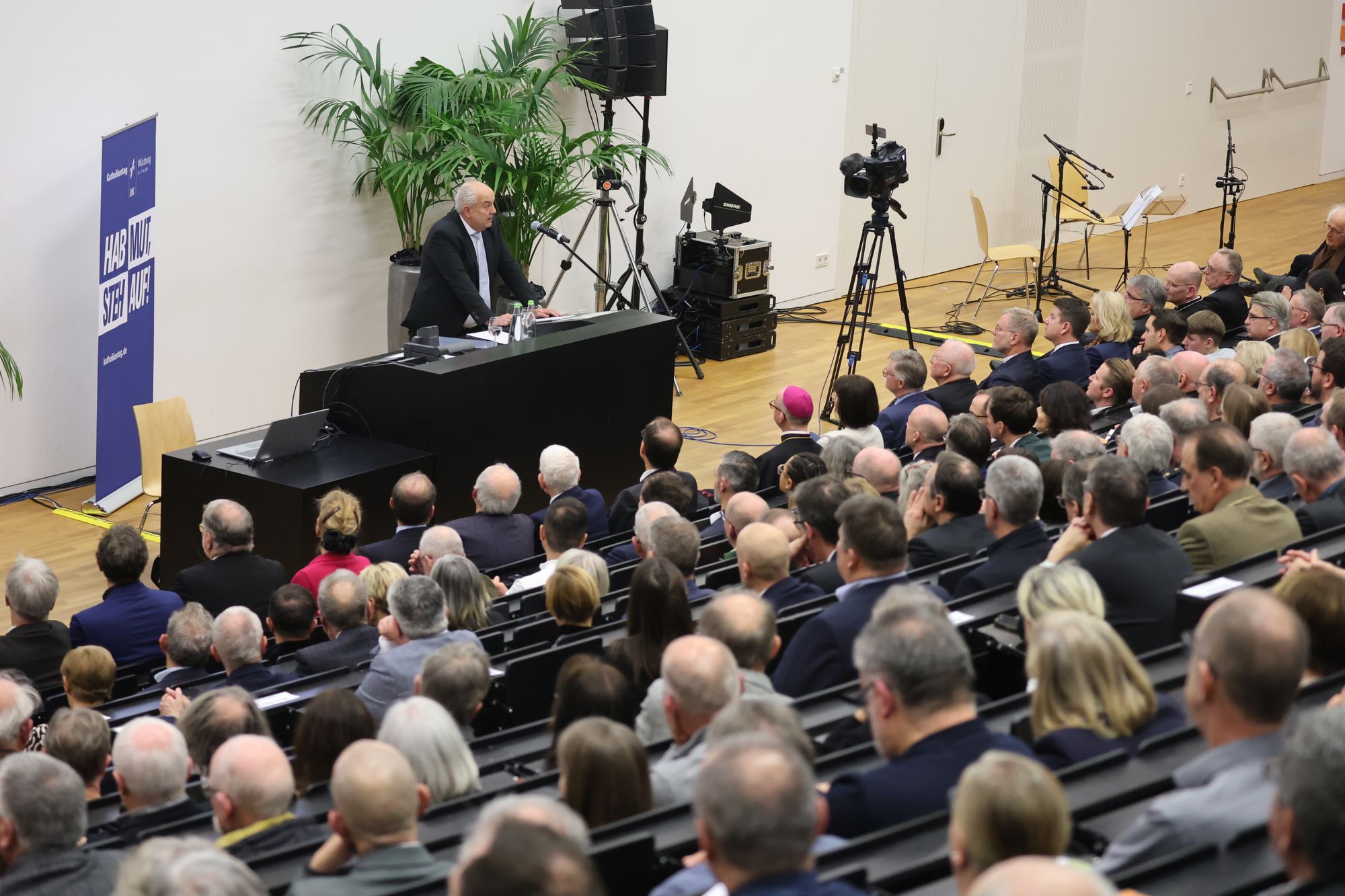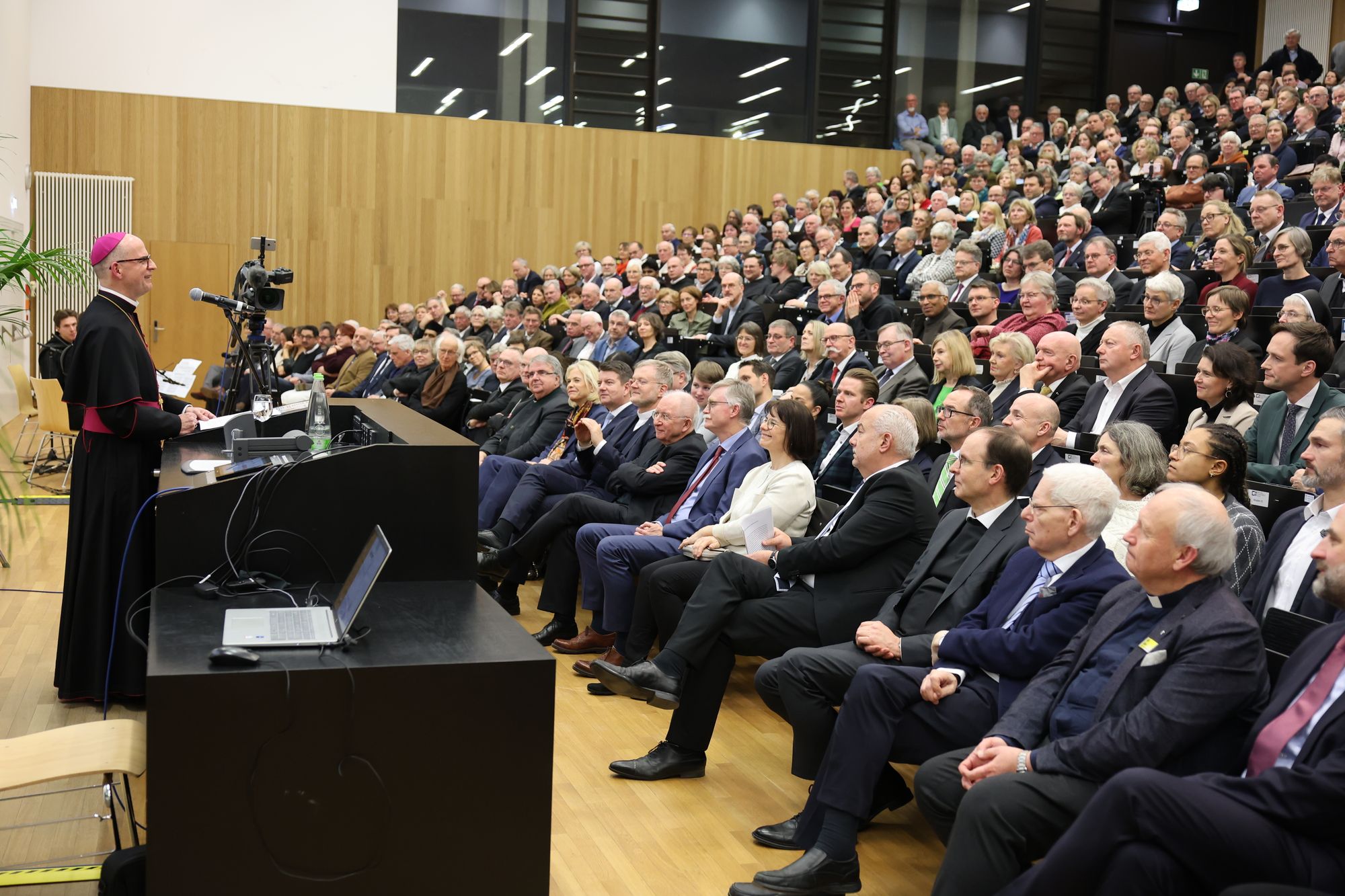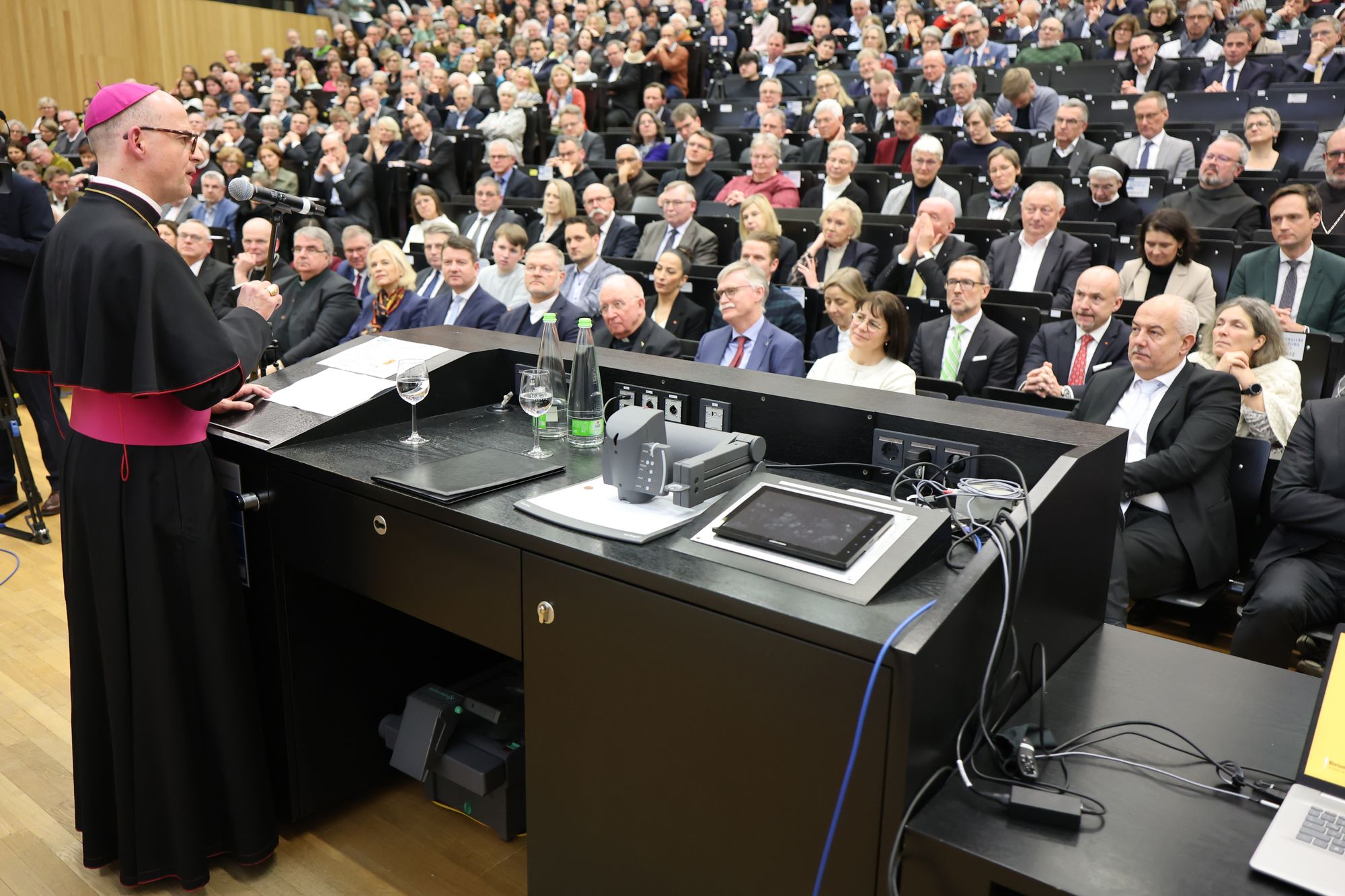 Dem Publikum gab der Bischof mit Blick auf das Leitwort „Hab Mut, steh auf!“ mit auf den Weg: „Hab Mut, steh auf für den demokratischen Rechtsstaat mit seiner Rechtsordnung, in dem zu leben wir das große Privileg und Glück haben. Steh mutig auf, die geltenden Wege der Normfindung und des Aushandelns politischer Streitfragen stark zu machen. Steh mutig dafür auf, Mehrheiten zu organisieren, die helfen, Missstände in unserem Gemeinwesen abzustellen und gute Lösungen voranzubringen. Steh aber auch dann immer mutig auf, wenn es darum geht, Menschenrechtsverletzungen als solche zu benennen und Menschen in ihrer Würde zu schützen.“