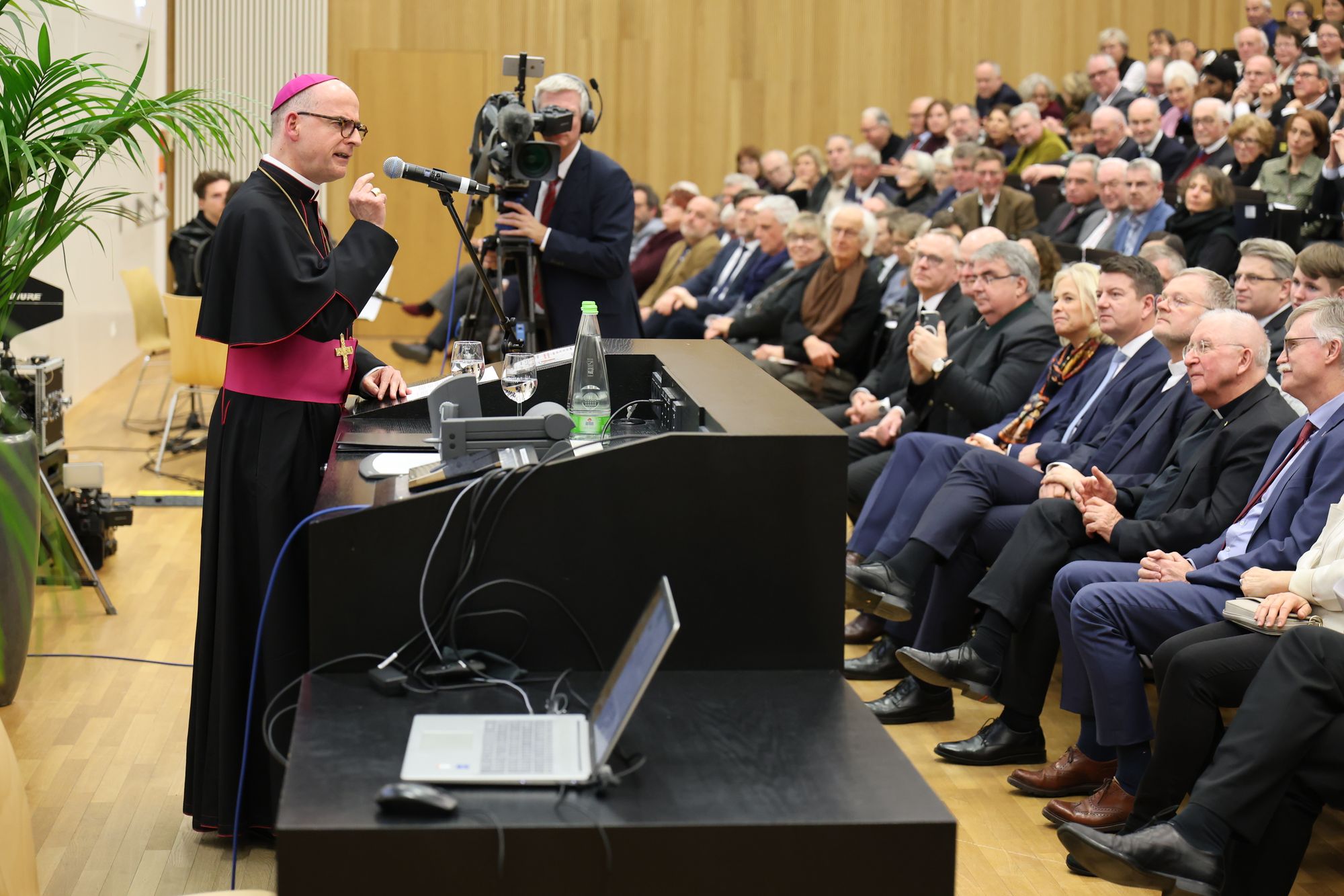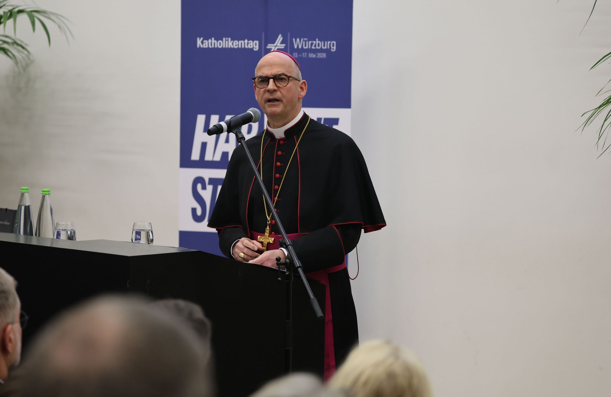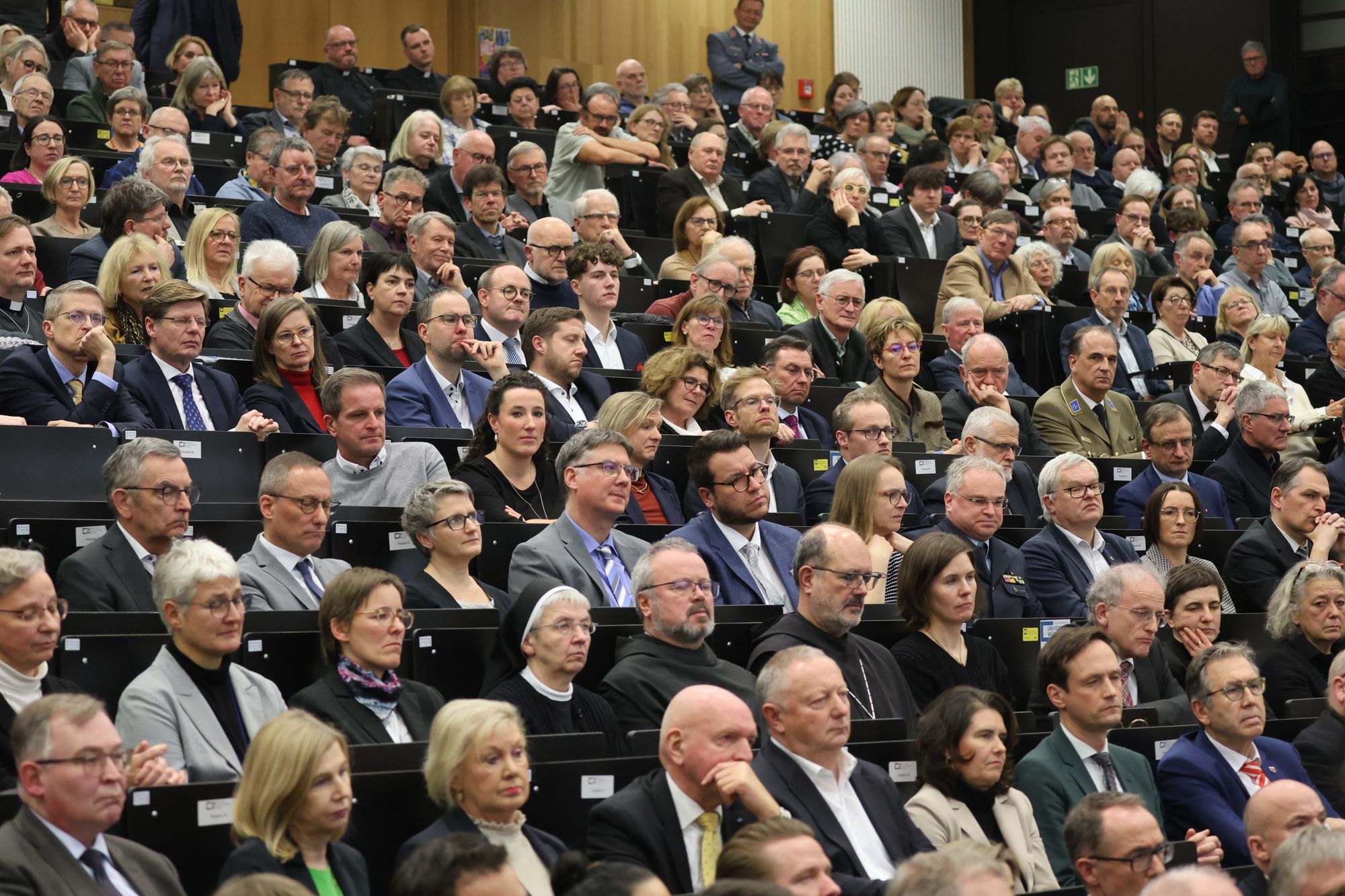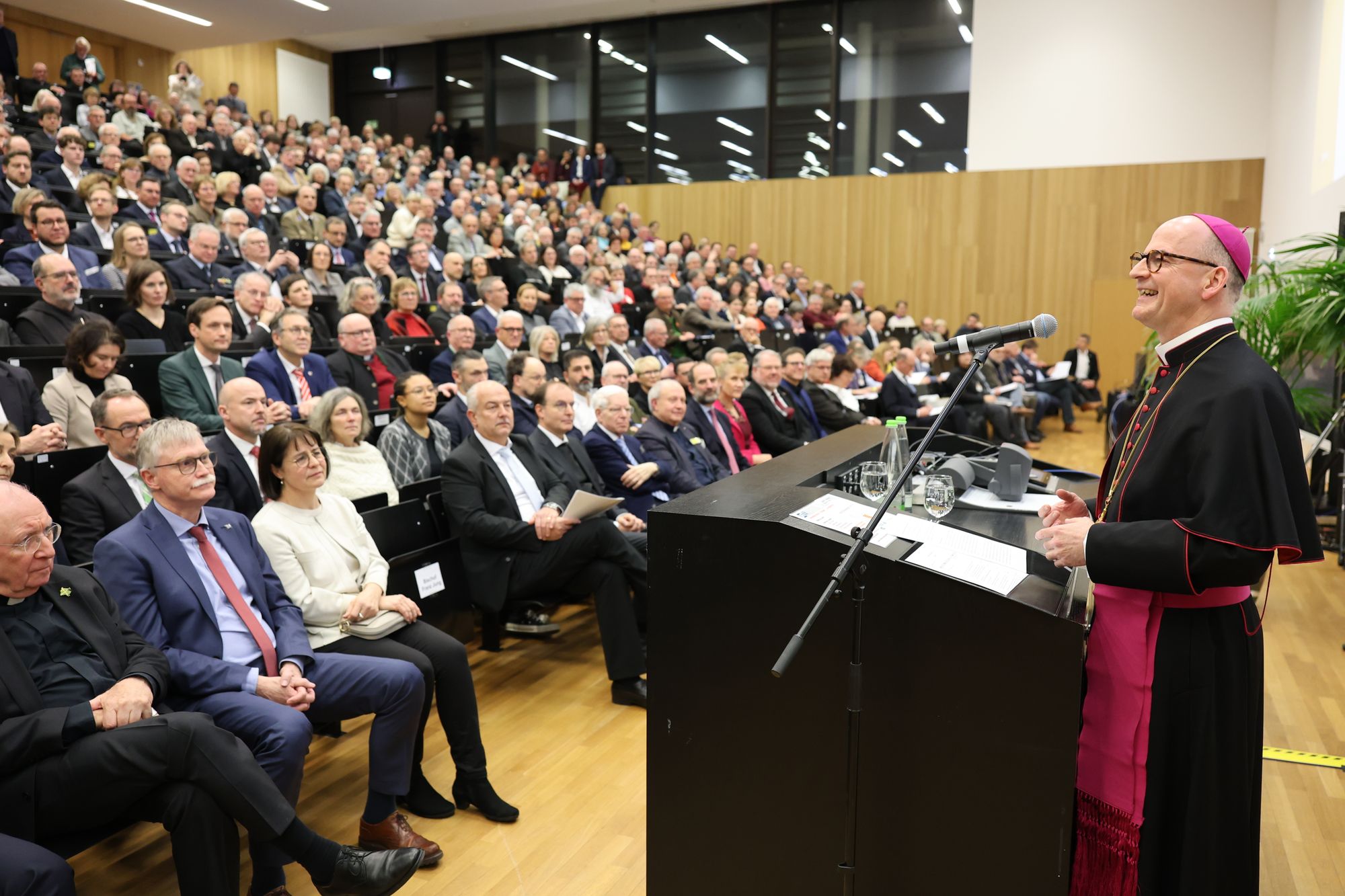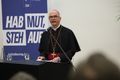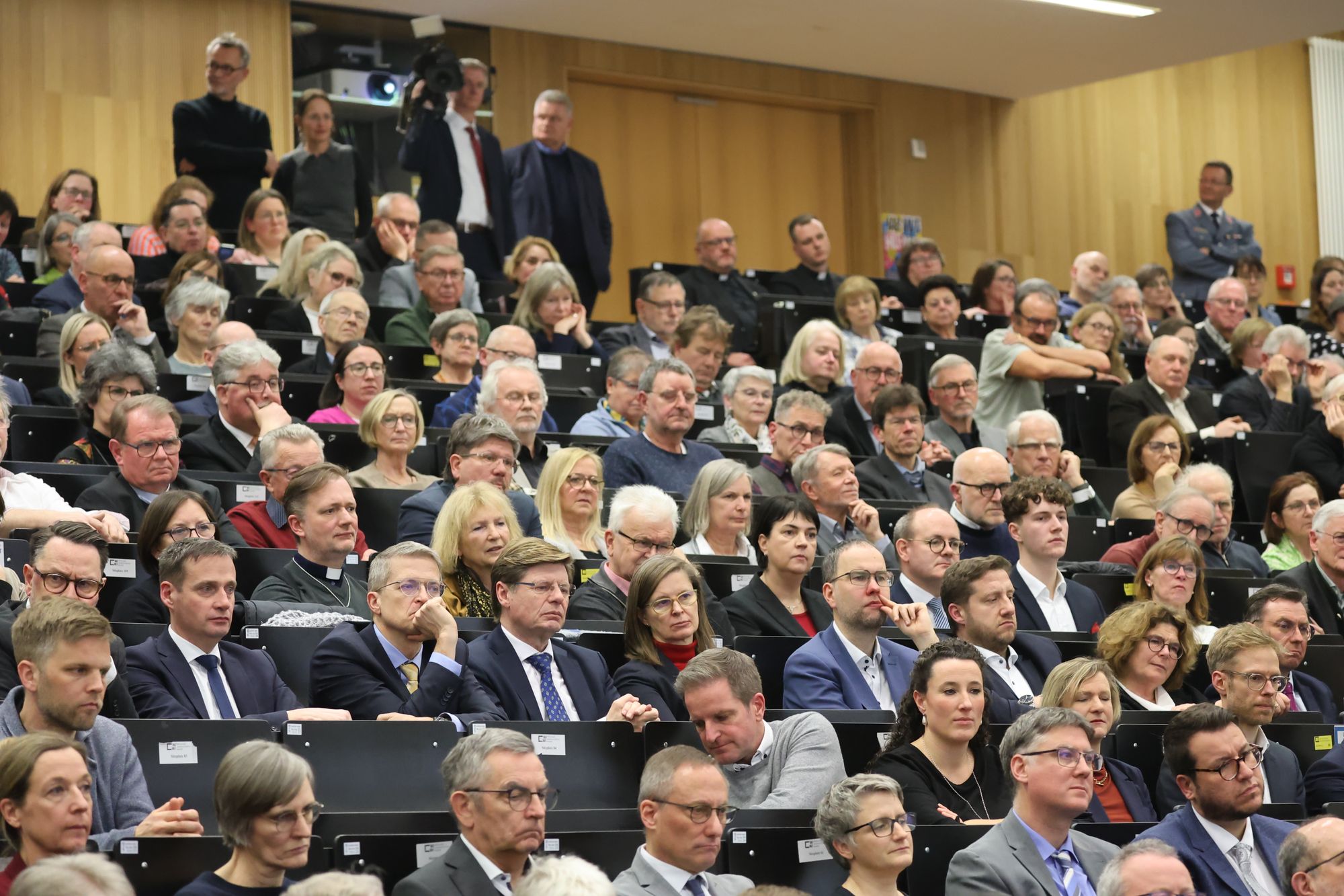 Dem Publikum gab der Bischof mit Blick auf das Leitwort „Hab Mut, steh auf!“ mit auf den Weg: „Hab Mut, steh auf für den demokratischen Rechtsstaat mit seiner Rechtsordnung, in dem zu leben wir das große Privileg und Glück haben. Steh mutig auf, die geltenden Wege der Normfindung und des Aushandelns politischer Streitfragen stark zu machen. Steh mutig dafür auf, Mehrheiten zu organisieren, die helfen, Missstände in unserem Gemeinwesen abzustellen und gute Lösungen voranzubringen. Steh aber auch dann immer mutig auf, wenn es darum geht, Menschenrechtsverletzungen als solche zu benennen und Menschen in ihrer Würde zu schützen.“