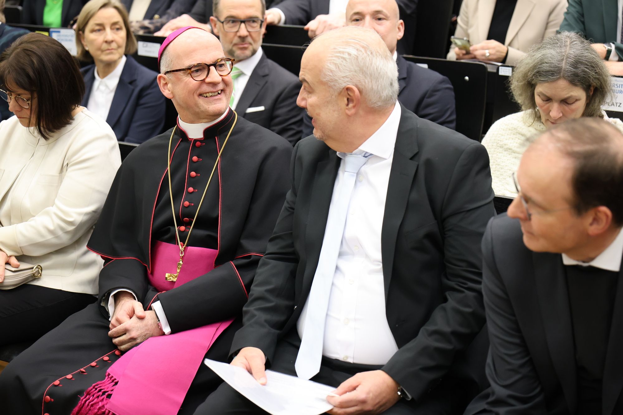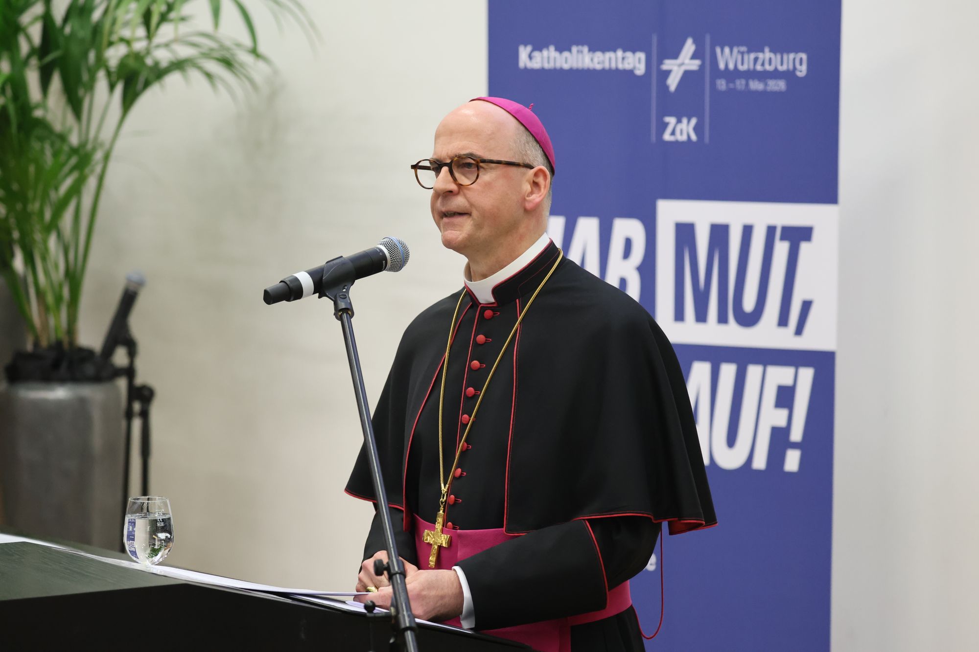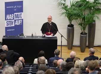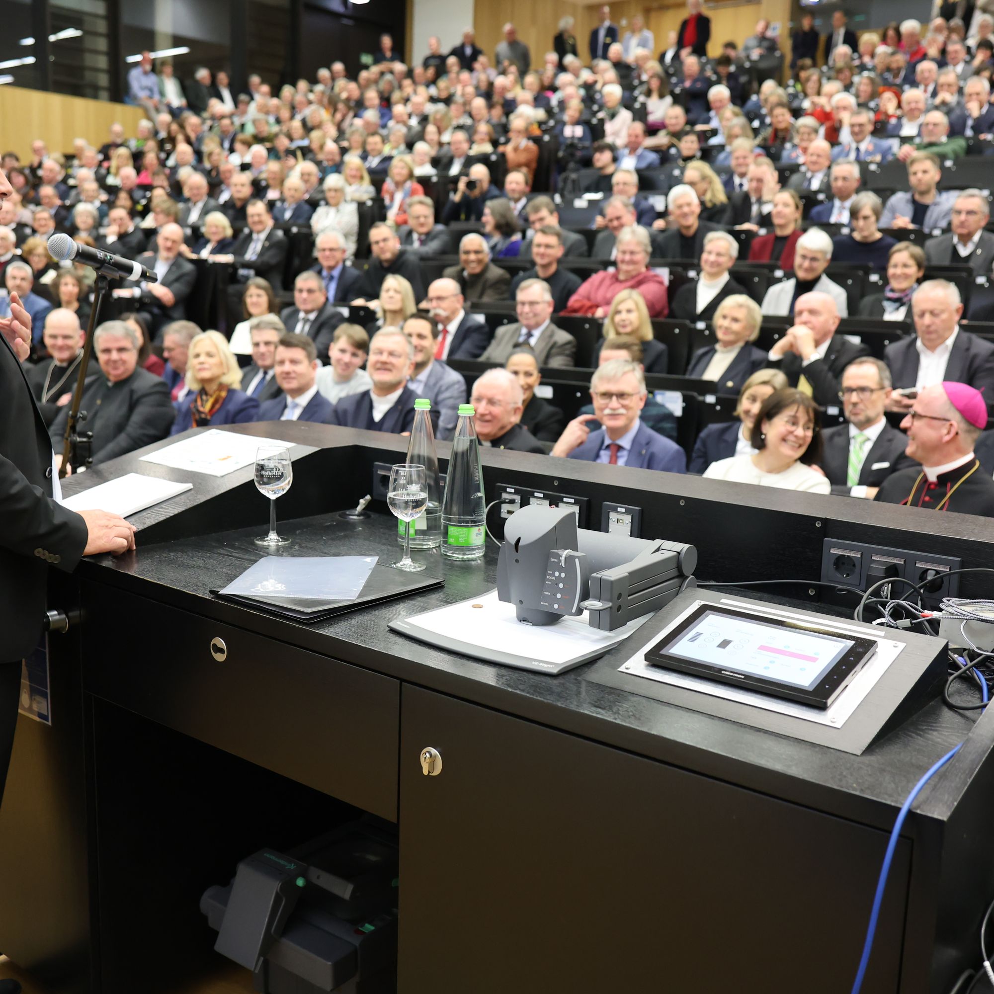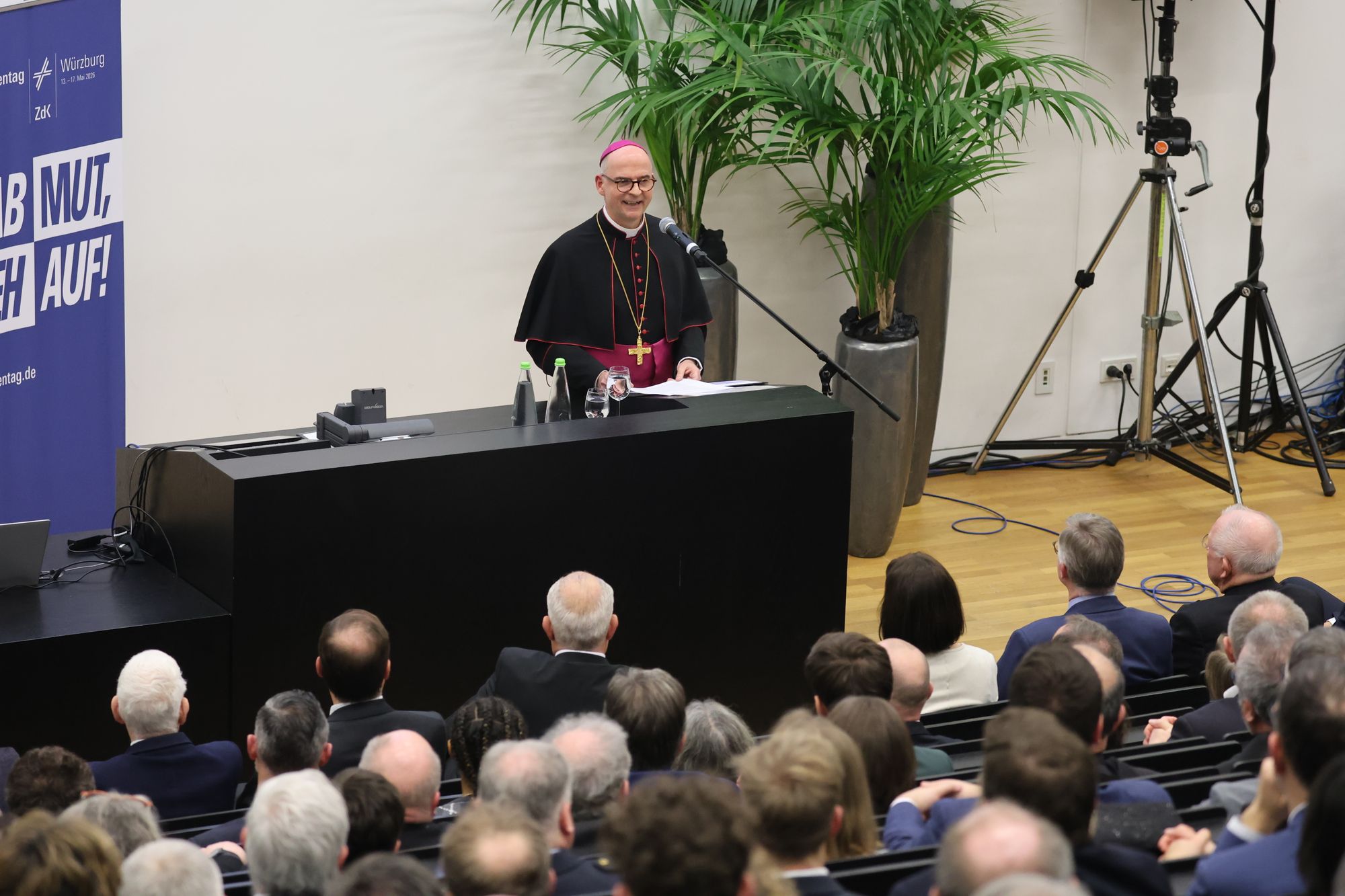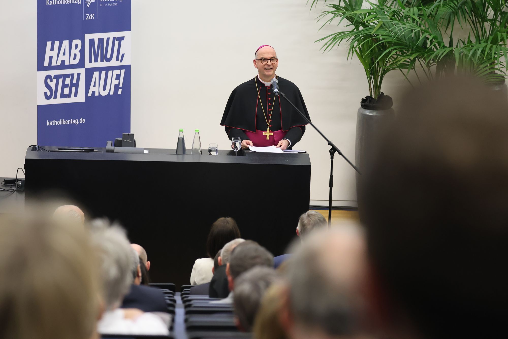 Dem Publikum gab der Bischof mit Blick auf das Leitwort „Hab Mut, steh auf!“ mit auf den Weg: „Hab Mut, steh auf für den demokratischen Rechtsstaat mit seiner Rechtsordnung, in dem zu leben wir das große Privileg und Glück haben. Steh mutig auf, die geltenden Wege der Normfindung und des Aushandelns politischer Streitfragen stark zu machen. Steh mutig dafür auf, Mehrheiten zu organisieren, die helfen, Missstände in unserem Gemeinwesen abzustellen und gute Lösungen voranzubringen. Steh aber auch dann immer mutig auf, wenn es darum geht, Menschenrechtsverletzungen als solche zu benennen und Menschen in ihrer Würde zu schützen.“