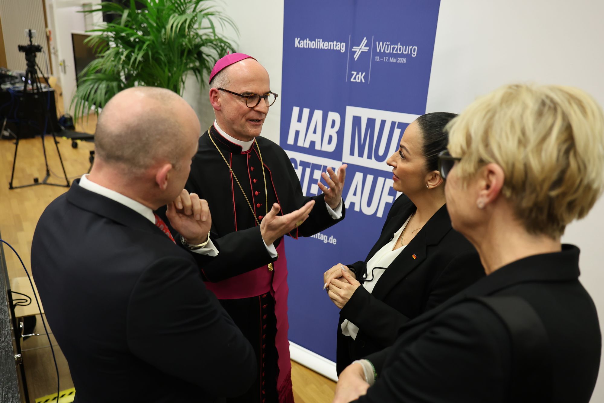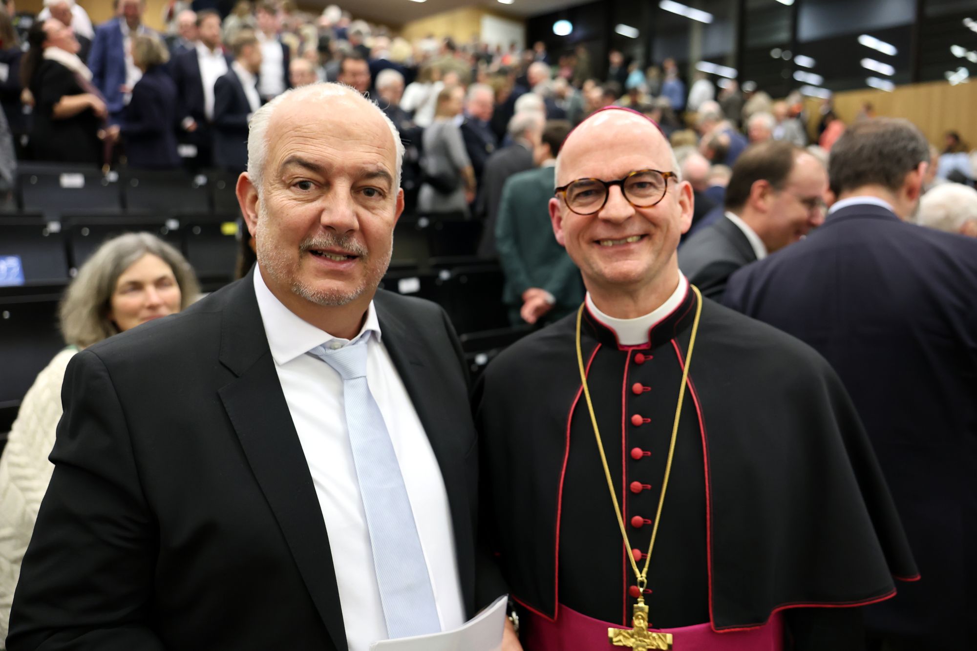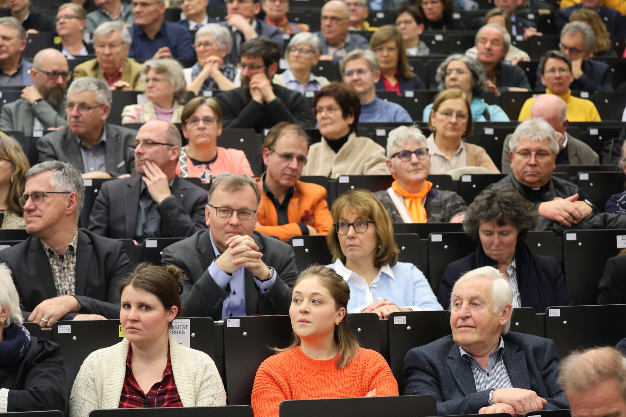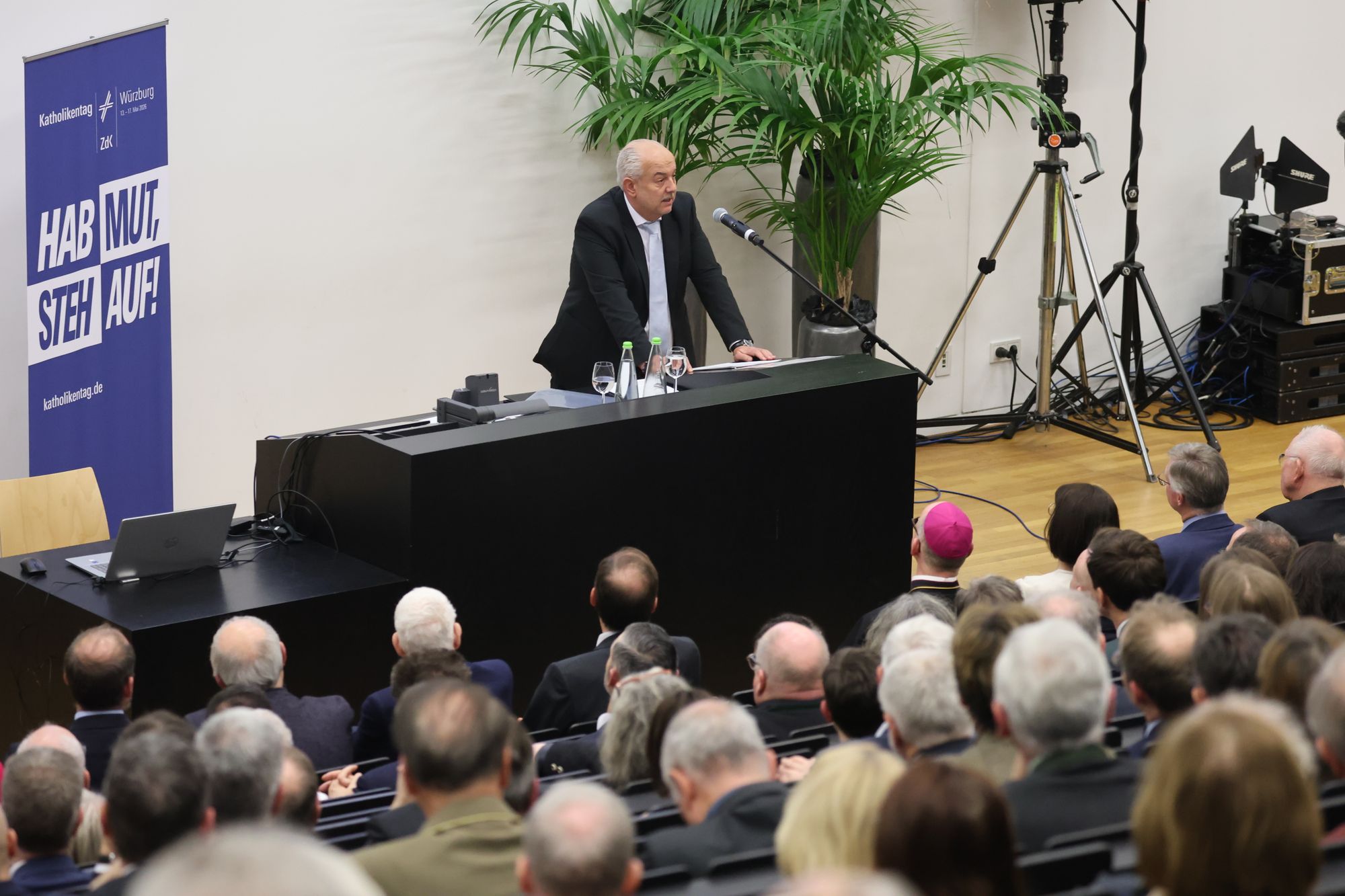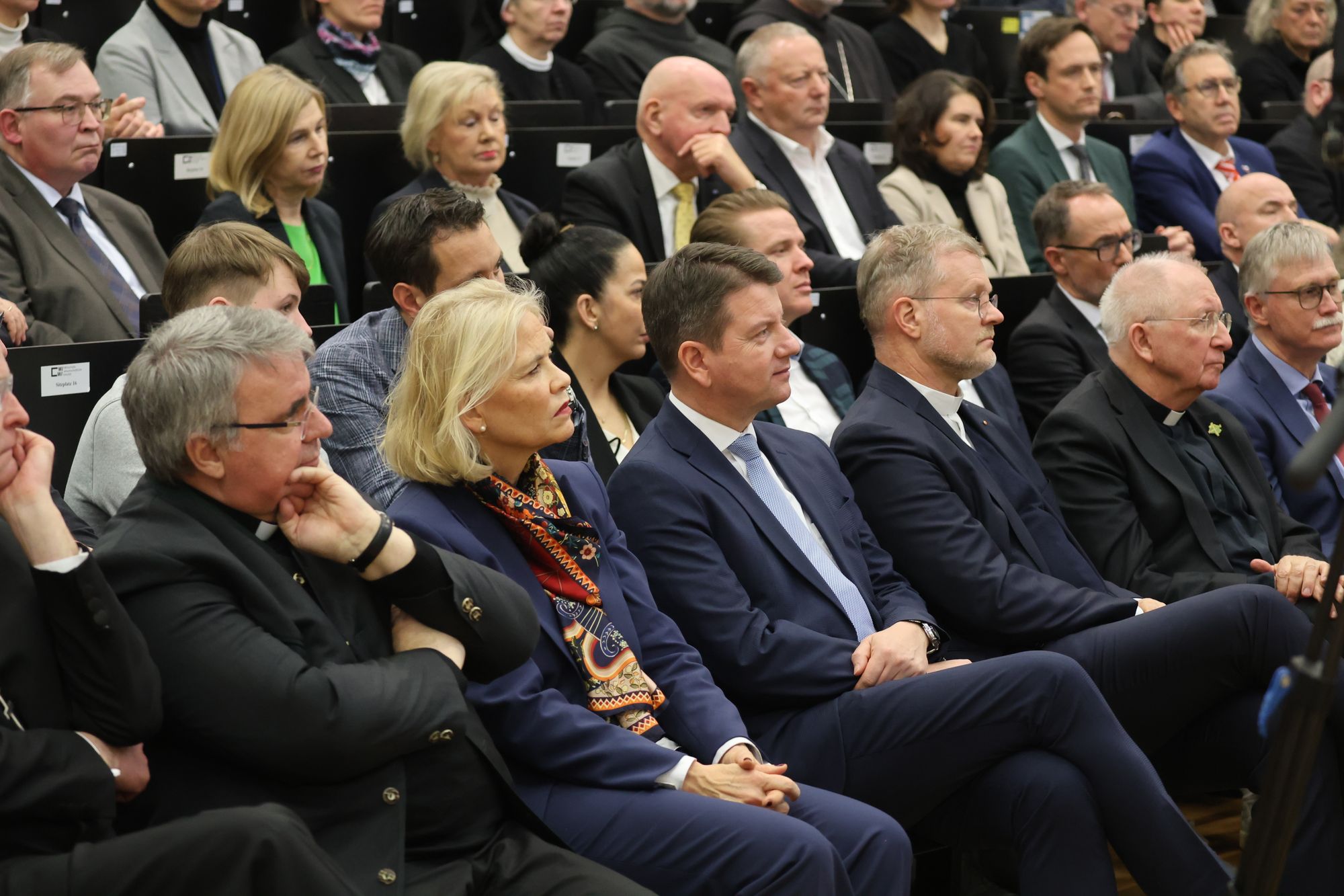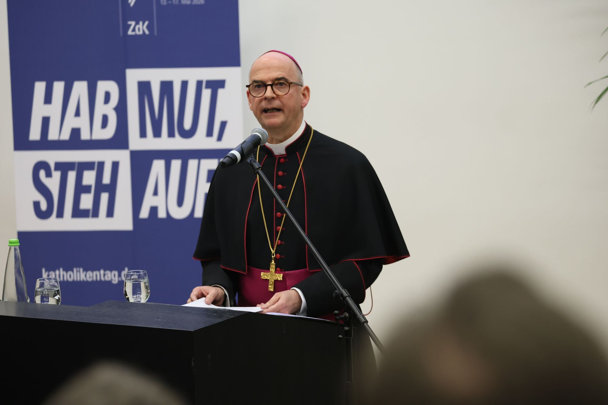 Dem Publikum gab der Bischof mit Blick auf das Leitwort „Hab Mut, steh auf!“ mit auf den Weg: „Hab Mut, steh auf für den demokratischen Rechtsstaat mit seiner Rechtsordnung, in dem zu leben wir das große Privileg und Glück haben. Steh mutig auf, die geltenden Wege der Normfindung und des Aushandelns politischer Streitfragen stark zu machen. Steh mutig dafür auf, Mehrheiten zu organisieren, die helfen, Missstände in unserem Gemeinwesen abzustellen und gute Lösungen voranzubringen. Steh aber auch dann immer mutig auf, wenn es darum geht, Menschenrechtsverletzungen als solche zu benennen und Menschen in ihrer Würde zu schützen.“