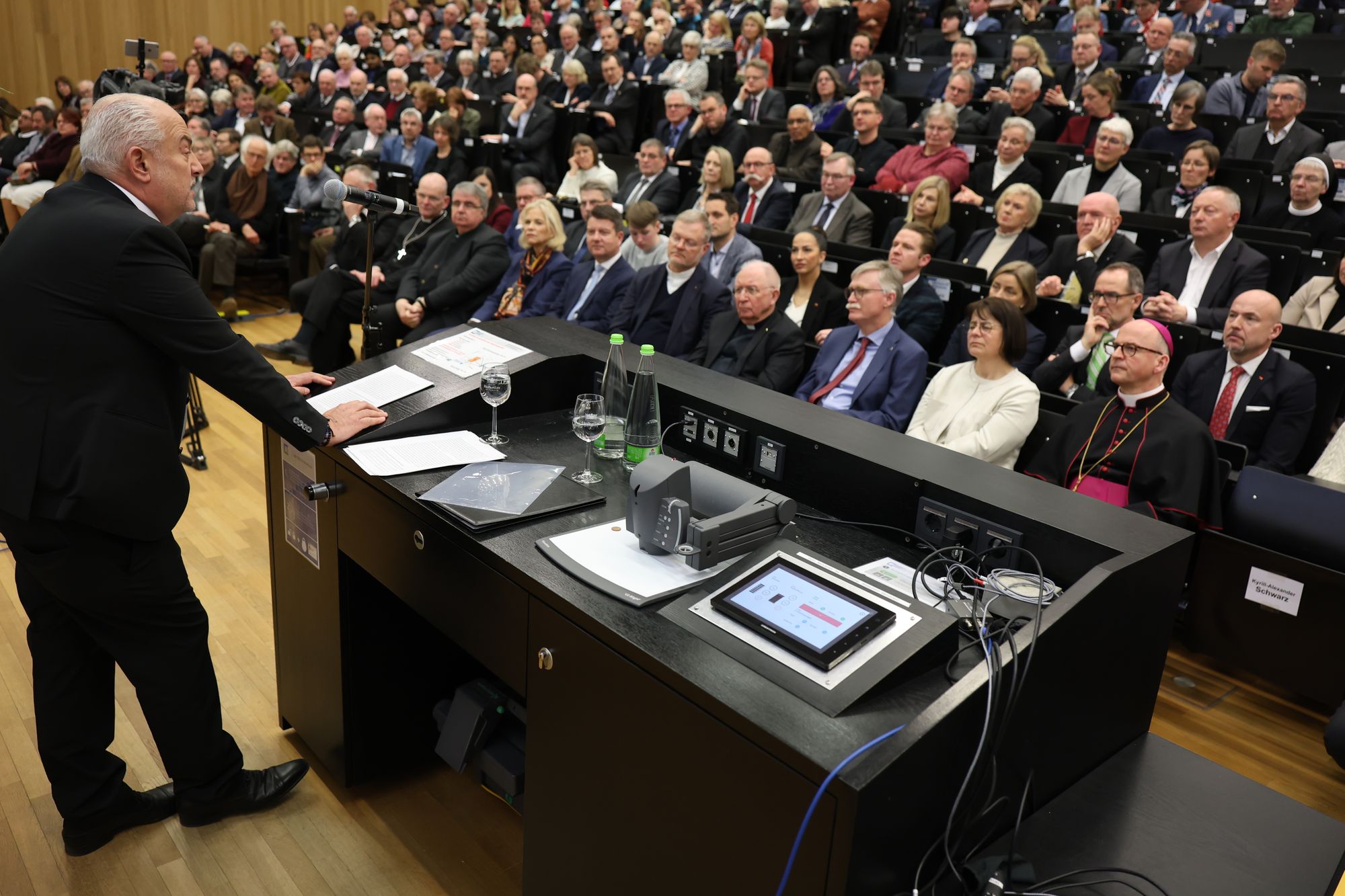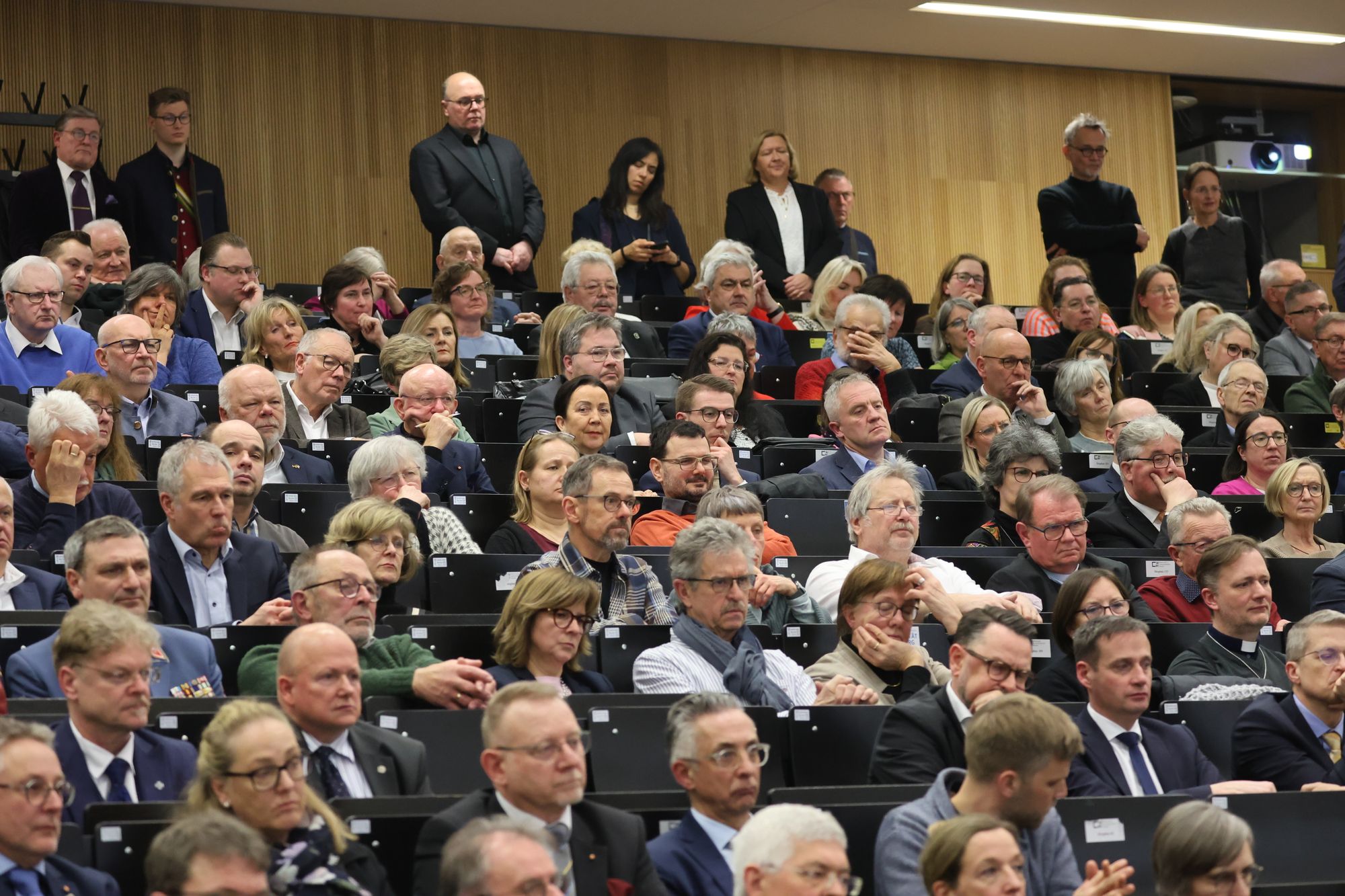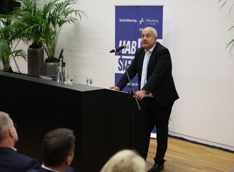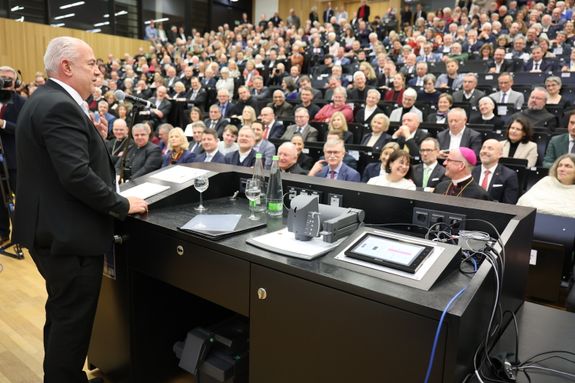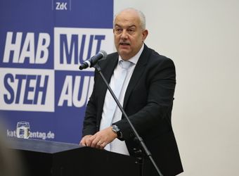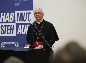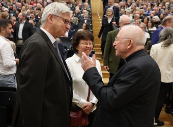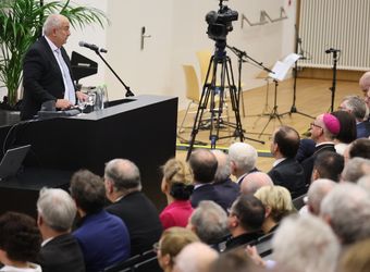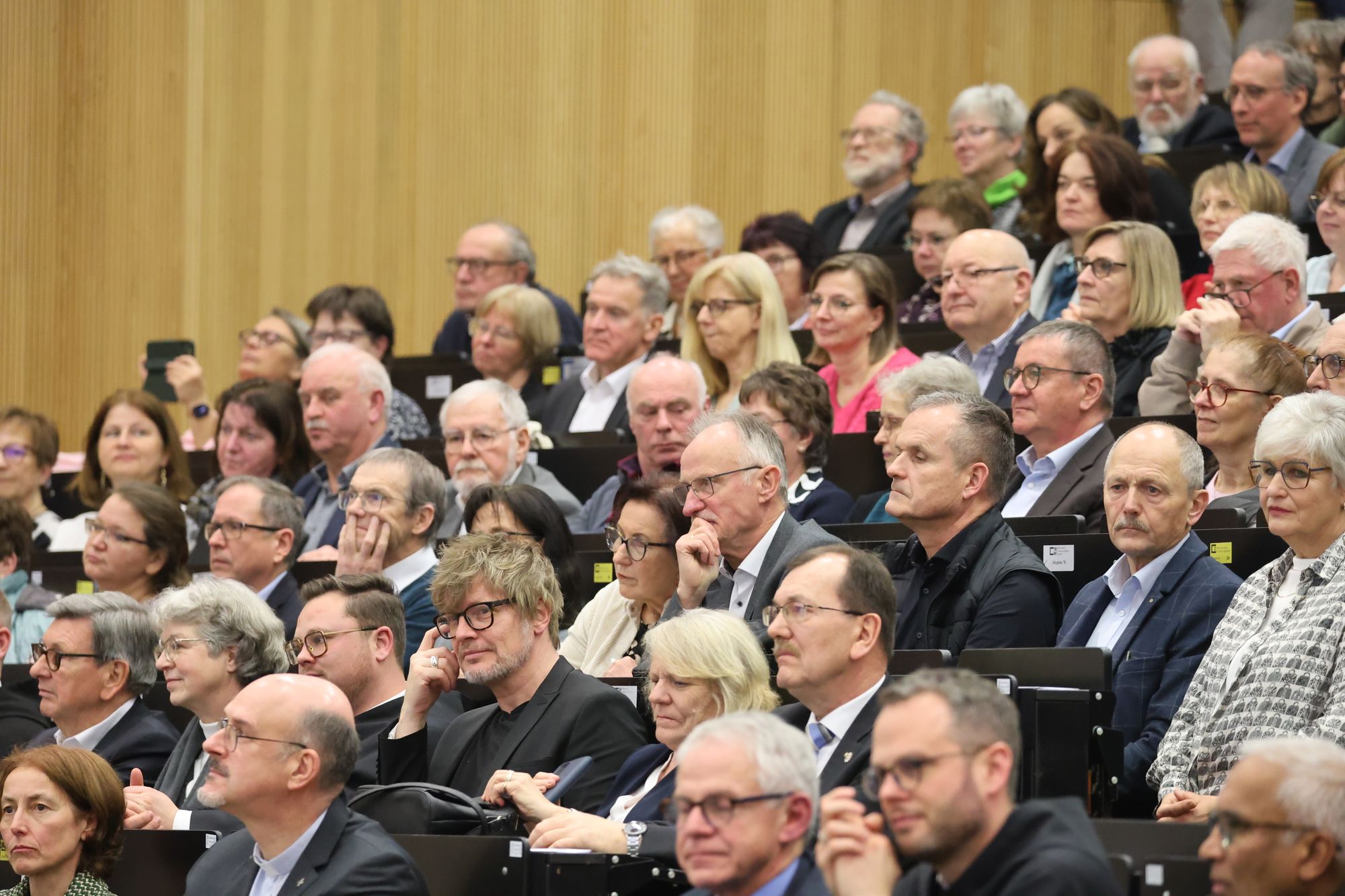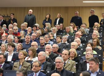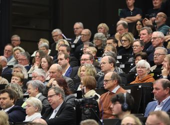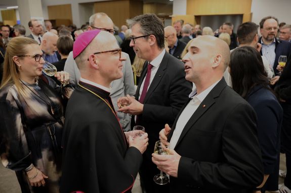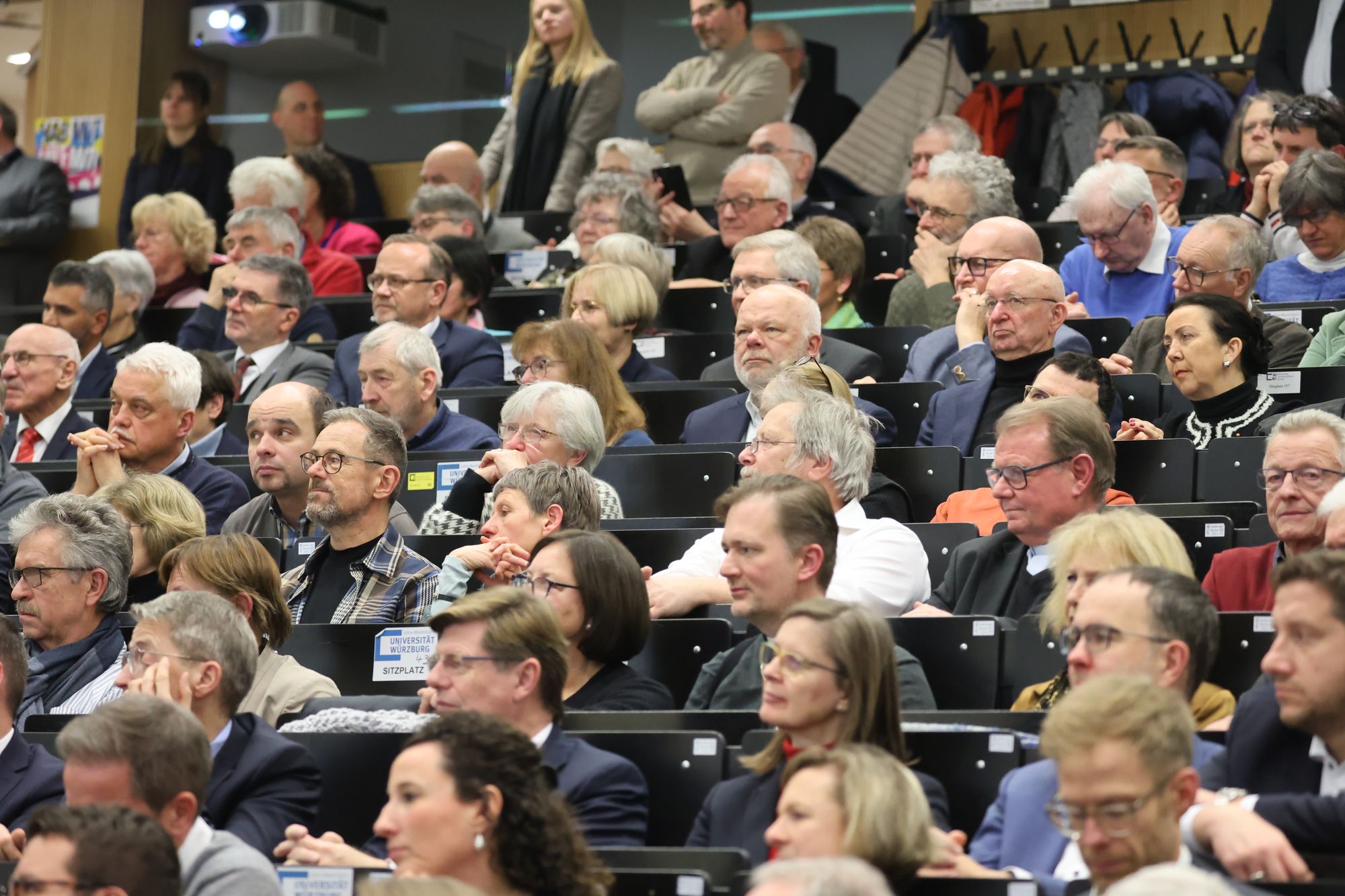 Dem Publikum gab der Bischof mit Blick auf das Leitwort „Hab Mut, steh auf!“ mit auf den Weg: „Hab Mut, steh auf für den demokratischen Rechtsstaat mit seiner Rechtsordnung, in dem zu leben wir das große Privileg und Glück haben. Steh mutig auf, die geltenden Wege der Normfindung und des Aushandelns politischer Streitfragen stark zu machen. Steh mutig dafür auf, Mehrheiten zu organisieren, die helfen, Missstände in unserem Gemeinwesen abzustellen und gute Lösungen voranzubringen. Steh aber auch dann immer mutig auf, wenn es darum geht, Menschenrechtsverletzungen als solche zu benennen und Menschen in ihrer Würde zu schützen.“