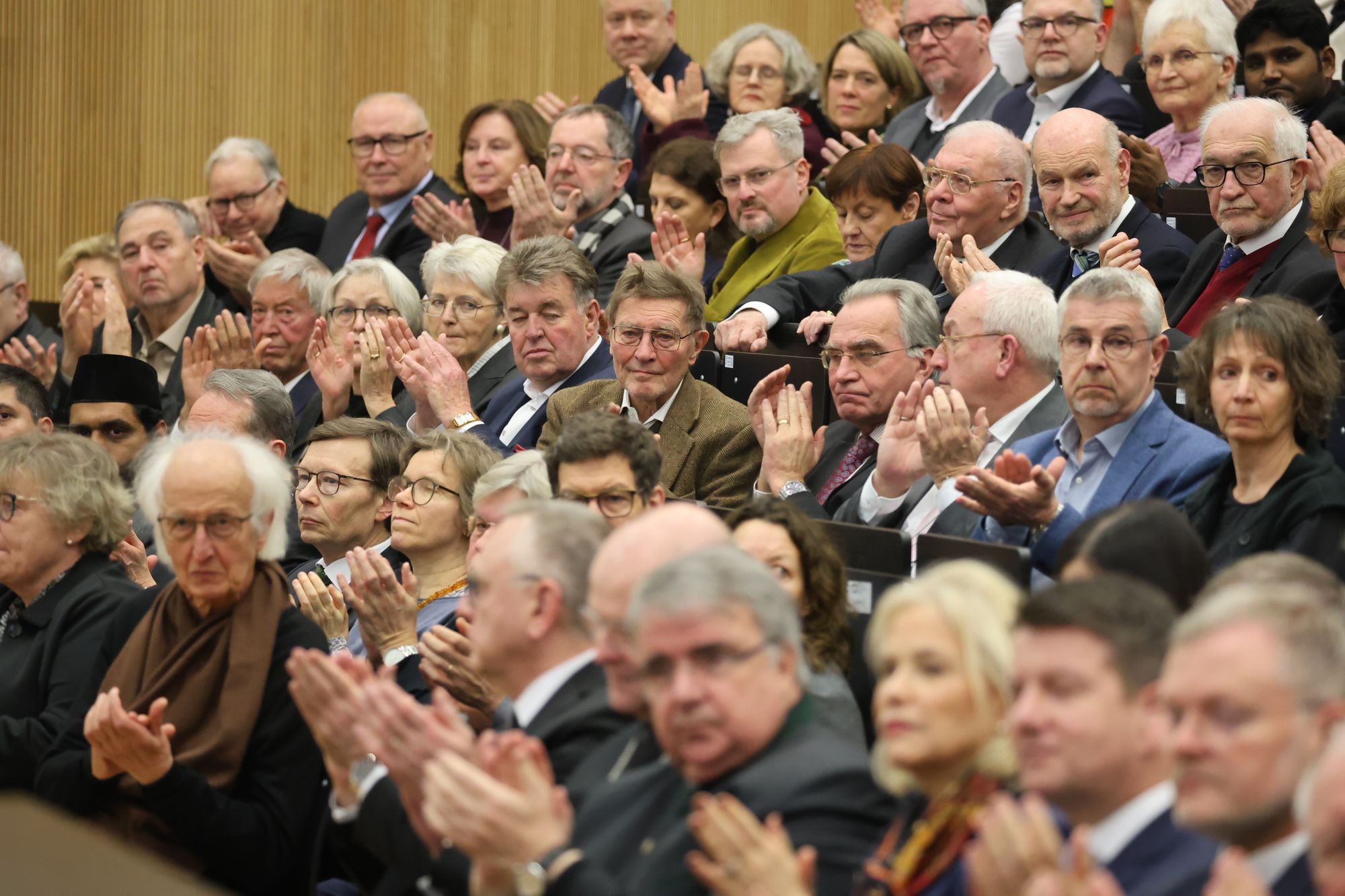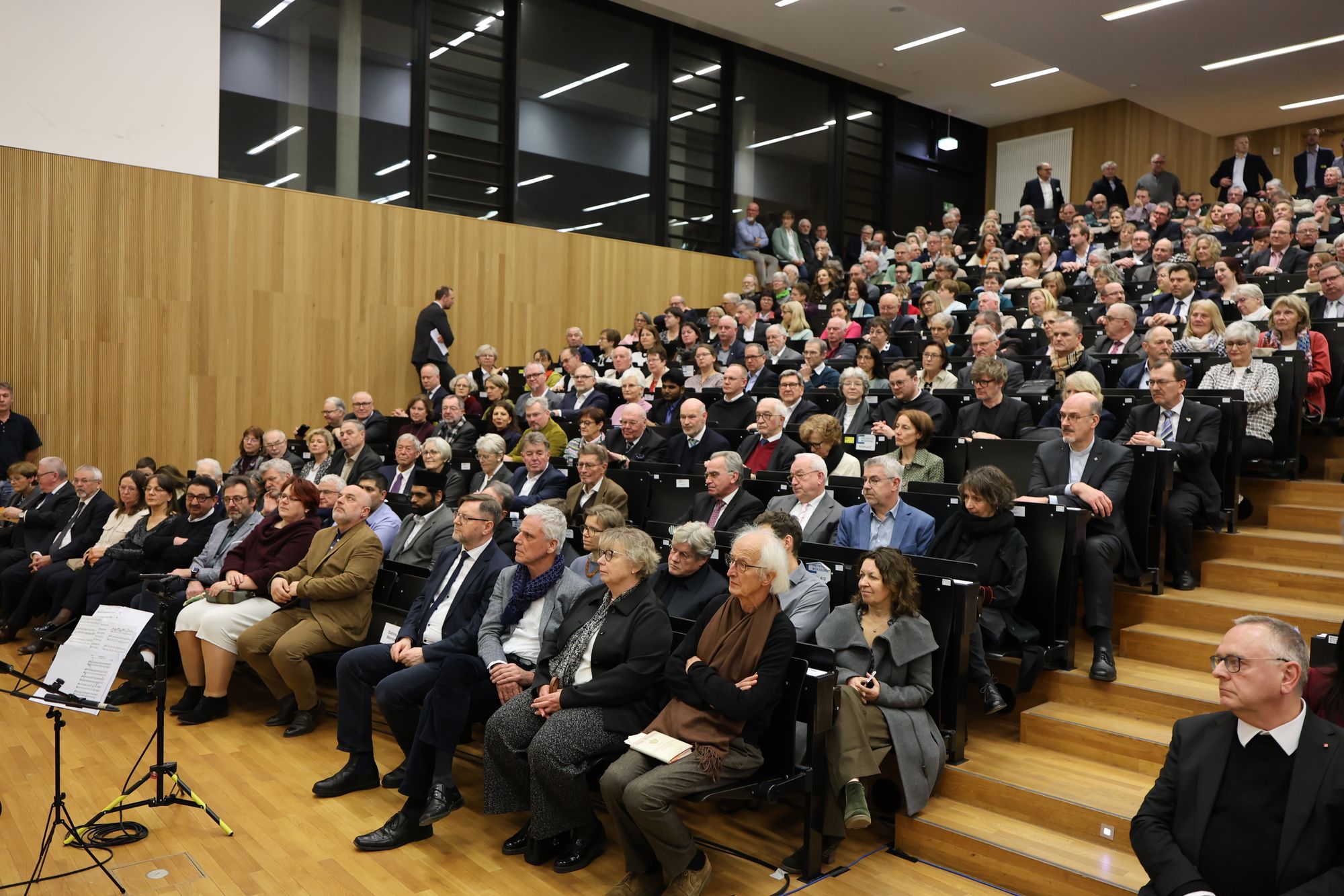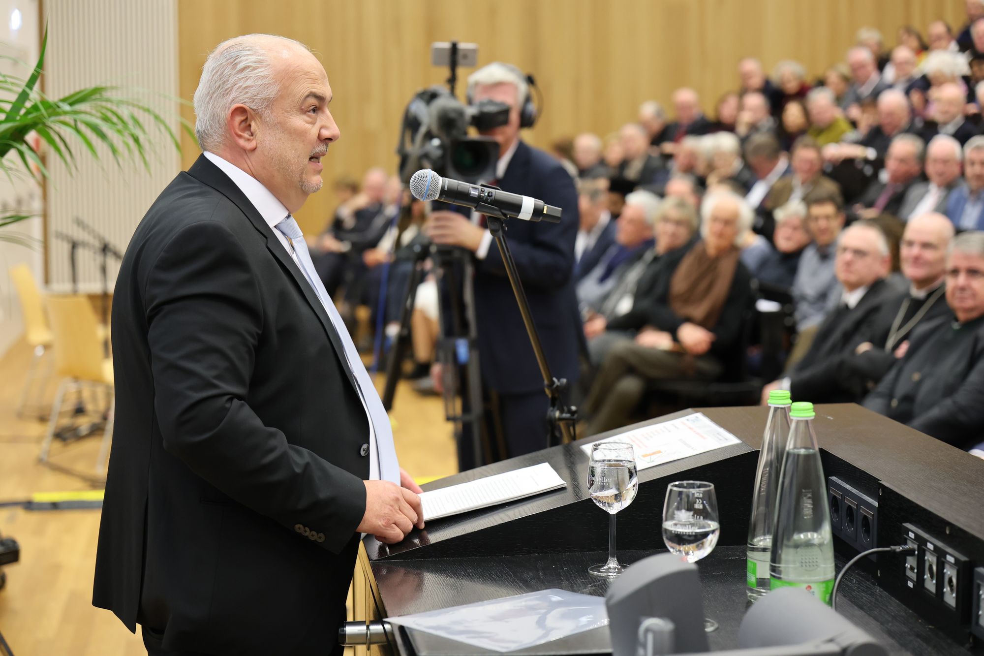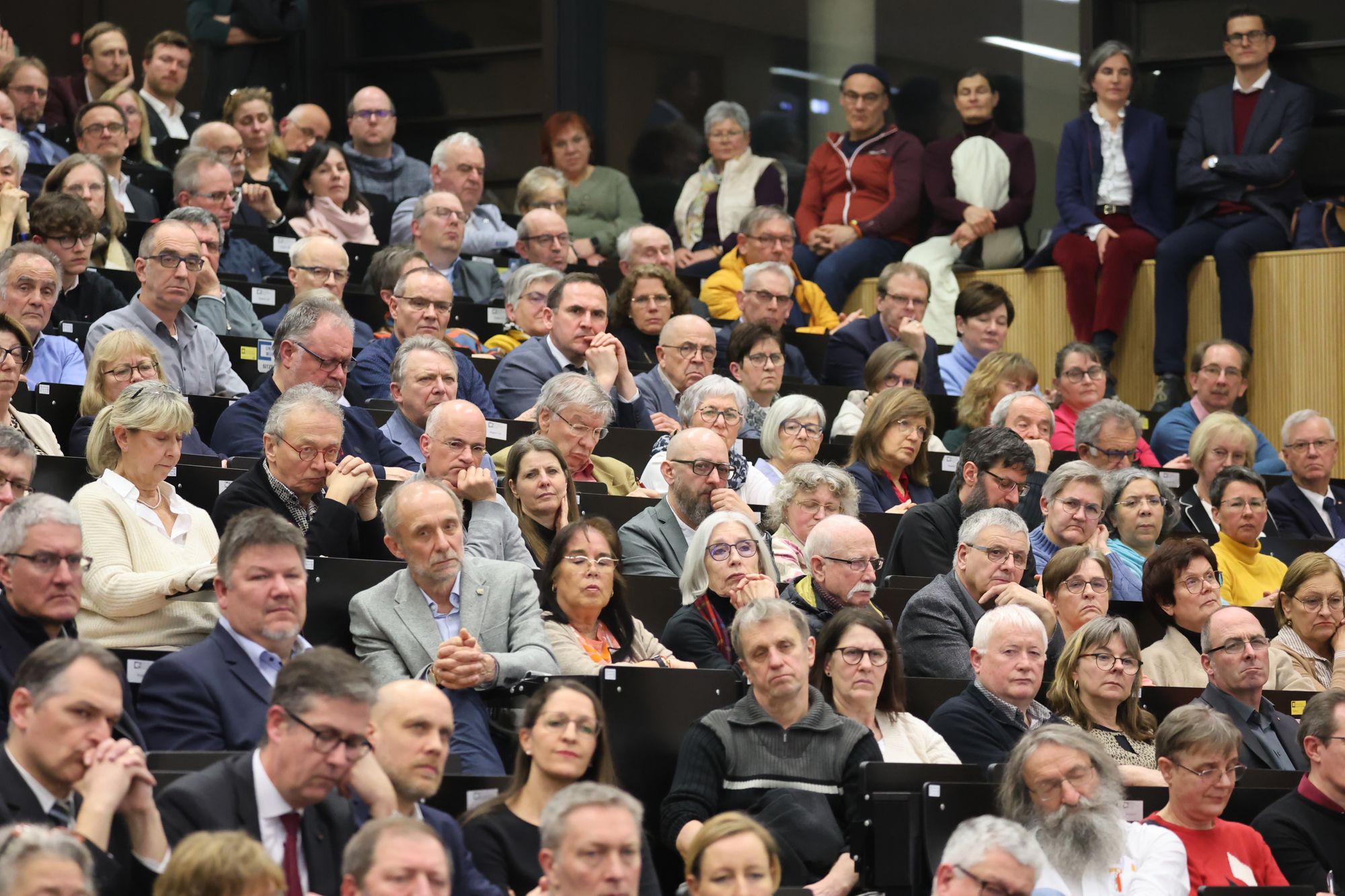 Würzburg (POW) Ziviler Ungehorsam hat viele Gesichter: Der containernde Jesuitenpater und die Kirchengemeinde, die Kirchenasyl gewährt, nehmen ihn ebenso für sich in Anspruch wie Klimaaktivisten, die Kunstwerke mit Suppe beschmieren. „Hab Mut, steh auf!“, lautet das Jahresmotto des Bistums und das Leitwort für den 104. Deutschen Katholikentag in Würzburg. Doch wann darf der Einzelne den Gehorsam gegenüber dem für alle geltenden Gesetz aufkündigen? Nach Ansicht von Dr. Kyrill-Alexander Schwarz, Professor für Öffentliches Recht an der Julius-Maximilians-Universität Würzburg, ist Rechtsungehorsam als Mittel der politischen Auseinandersetzung in einer Demokratie ein Widerspruch in sich. „Ziviler Ungehorsam ist die Negation des demokratischen Rechtsstaats und beraubt ihn seiner Existenzgrundlage“, sagte er in seinem Vortrag „Von der Gehorsamspflicht zum Widerstandsrecht“ beim Diözesanempfang am Montagabend, 19. Januar, in der Universität am Würzburger Hubland.