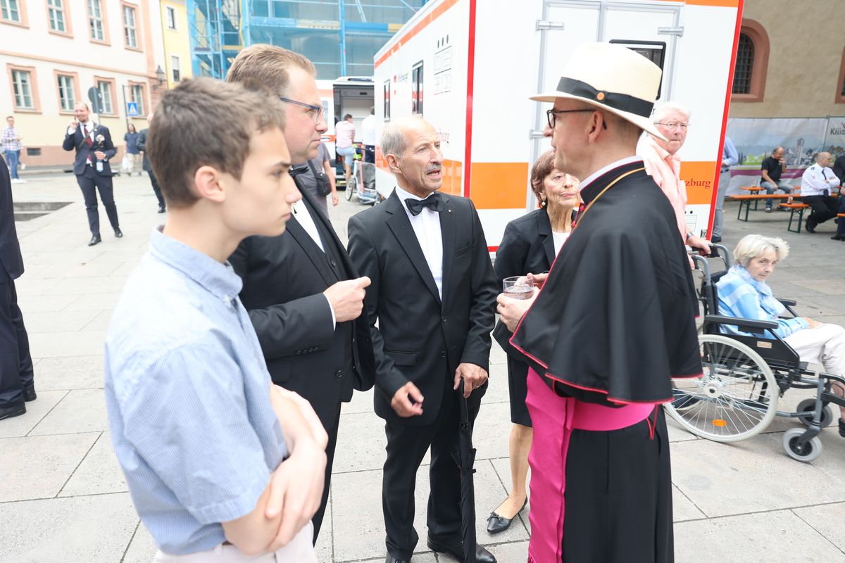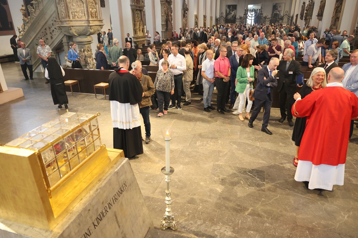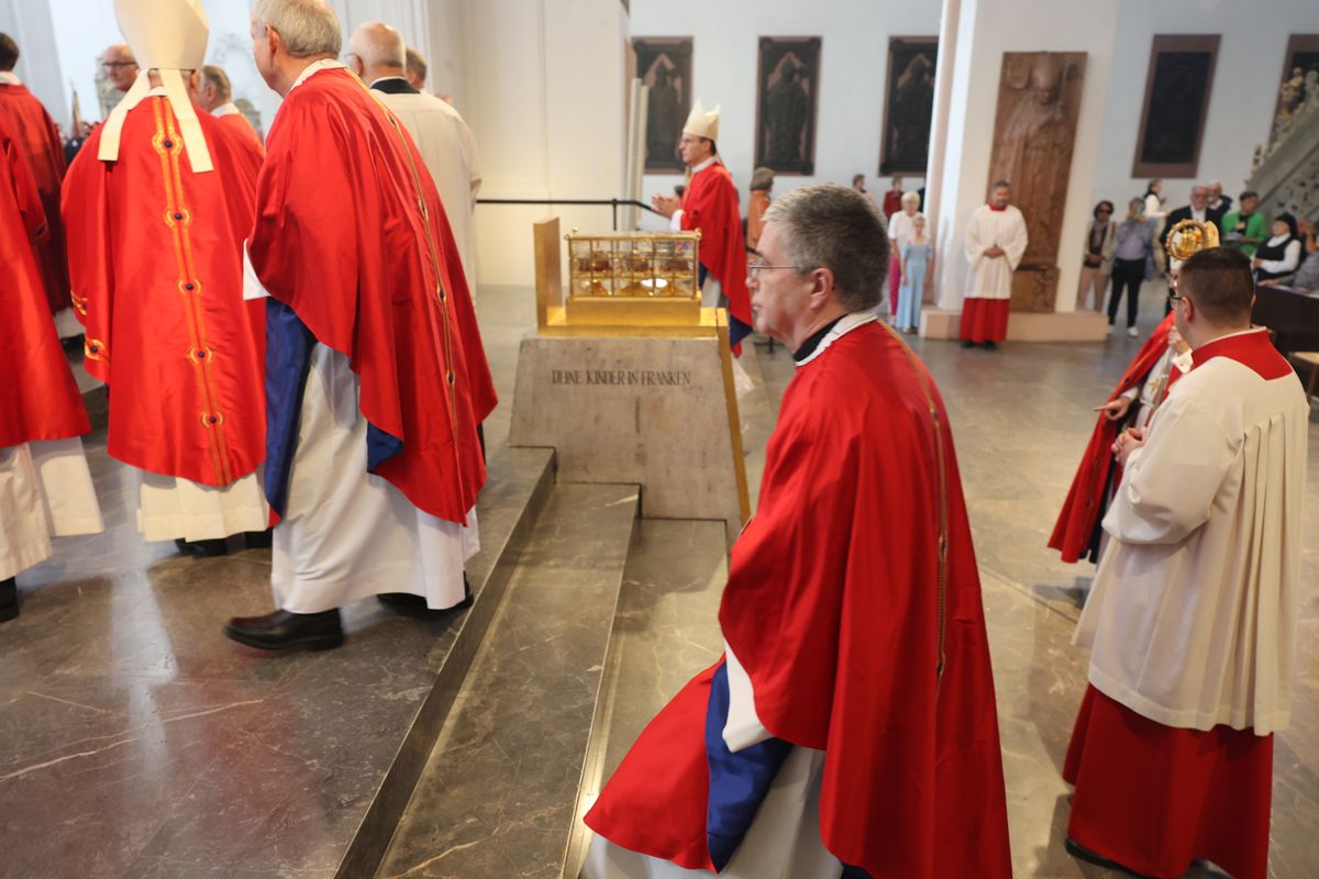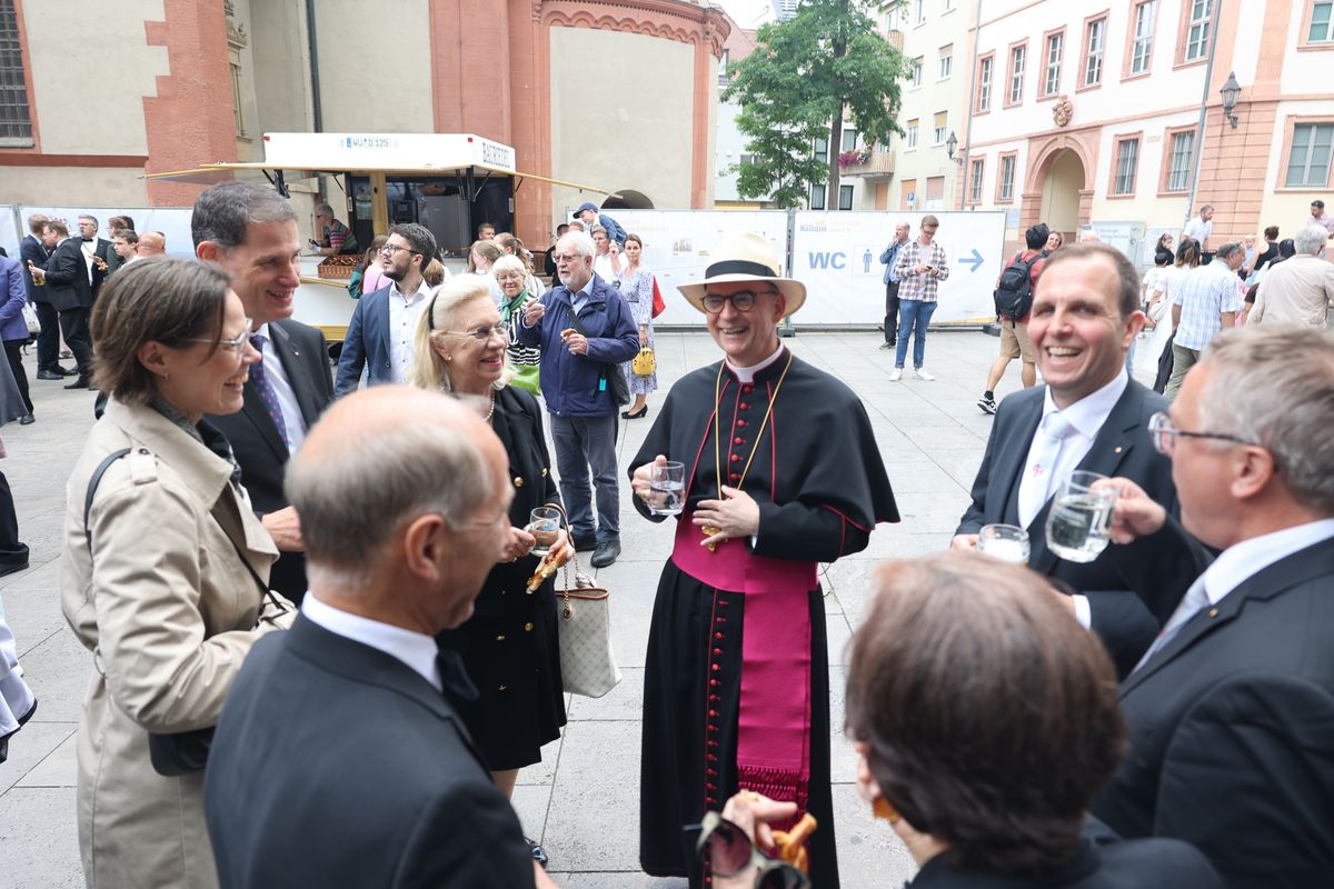 Viele Gläubige ließen sich nach dem Gottesdienst einzeln unter Auflegung von Reliquien der Frankenapostel segnen. Für die musikalische Gestaltung des Gottesdiensts im Dom sorgten Domorganist Professor Stefan Schmidt sowie der Domchor, die Domsingknaben und zwei Bläserensembles unter der Leitung von Domkapellmeister Alexander Rüth und Domkantor Julian Beutmiller, unter anderem mit der „Missa octo vocum“ von Hans Leo Hassler sowie Werken von Michael Praetorius und Felix Mendelssohn Bartholdy. Bei der Prozession spielte das Symphonische Blasorchester Kürnach. Ein Empfang auf dem Kiliansplatz schloss sich an den Gottesdienst an.