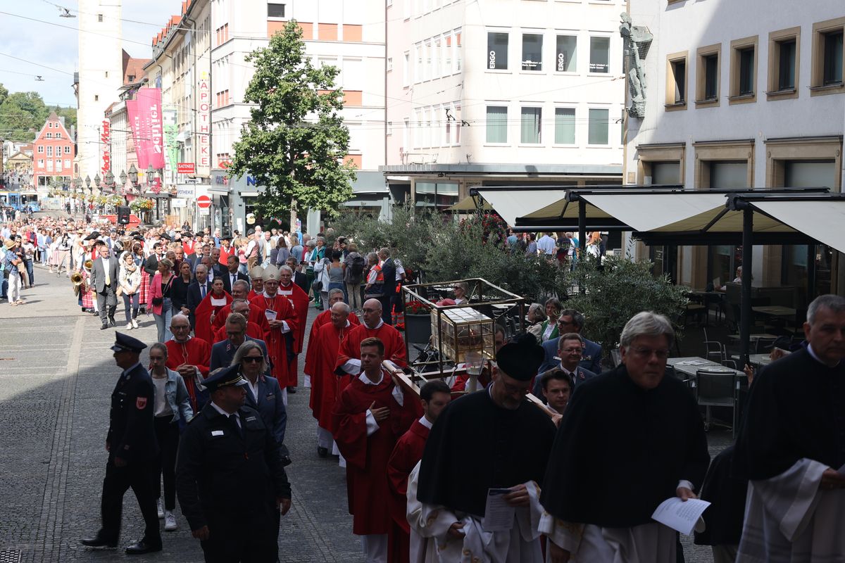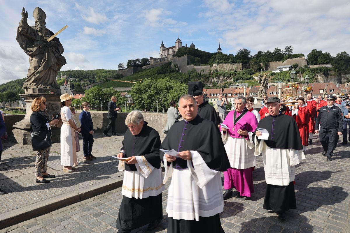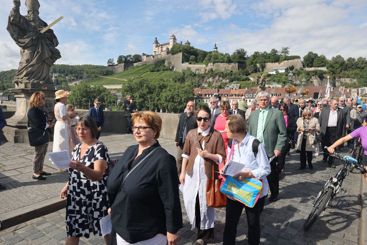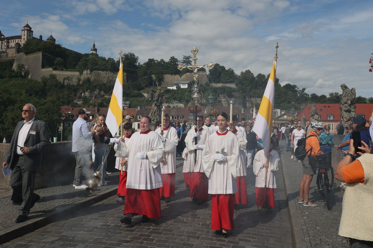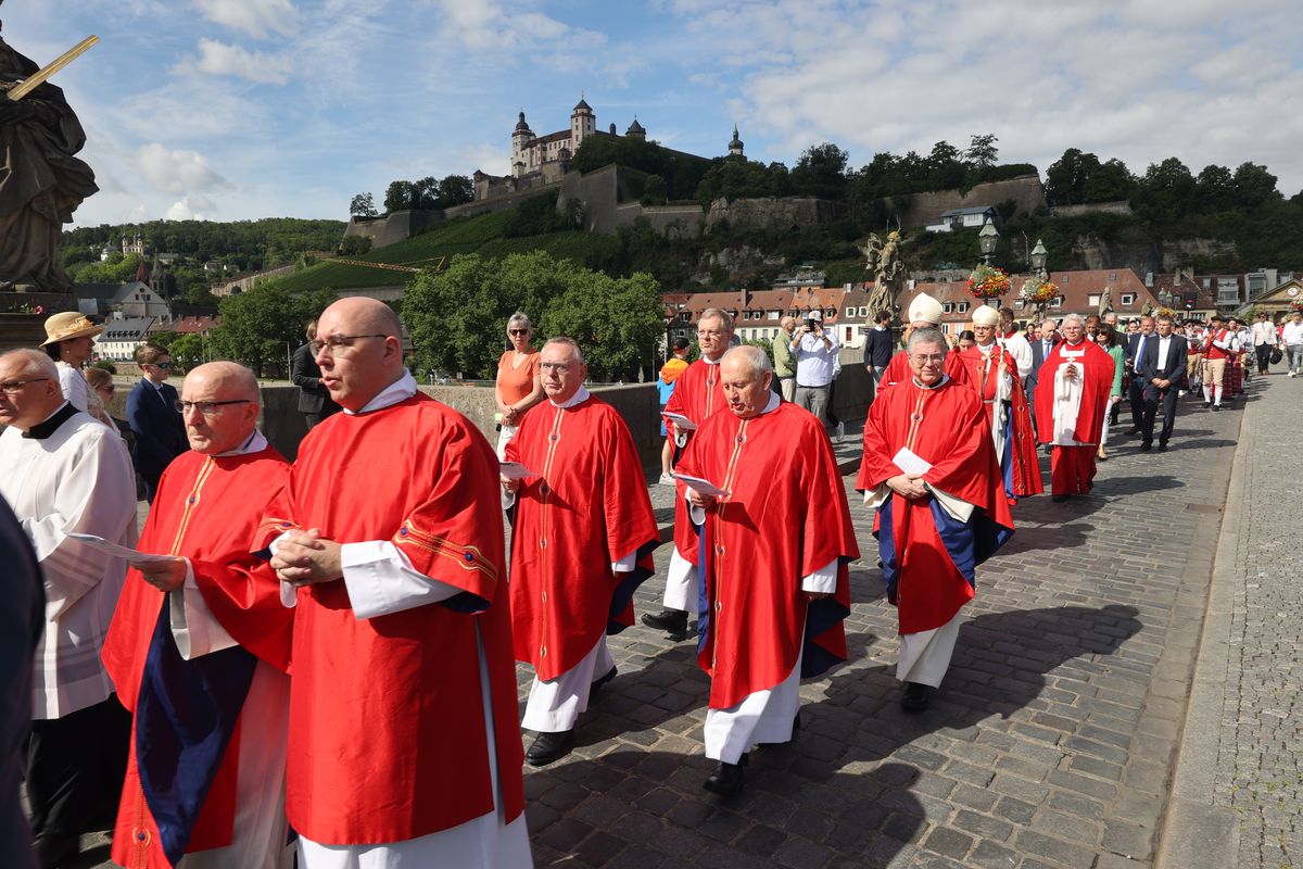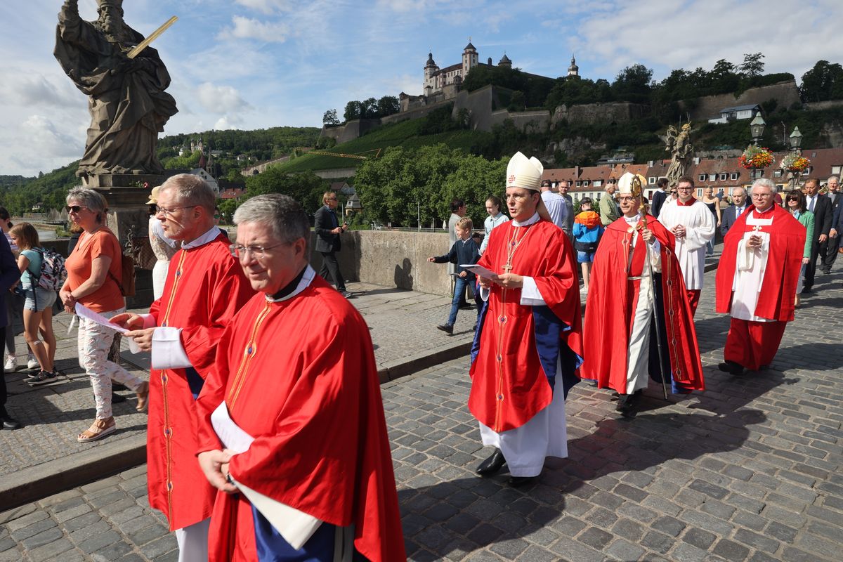 Mit einer Reliquienprozession von Sankt Burkard über die Alte Mainbrücke zum Kiliansdom und einem Pontifikalgottesdienst ist am Sonntag, 7. Juli, die Kiliani-Wallfahrtswoche 2024 eröffnet worden.