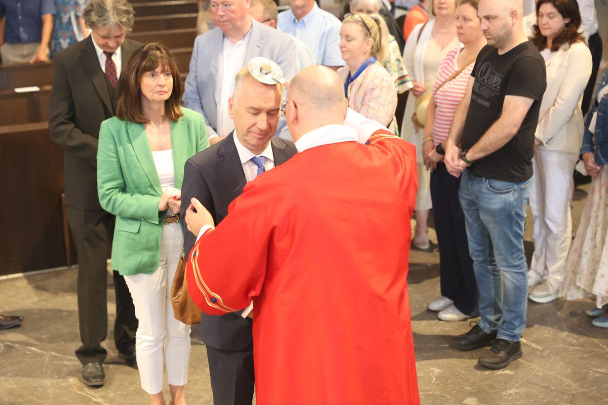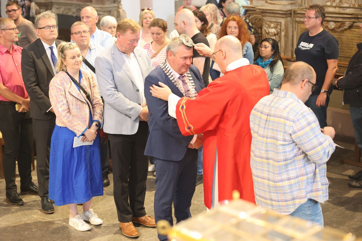 Würzburg (POW) Mit einem irischen Akzent hat die Kiliani-Wallfahrtswoche 2024 begonnen: Bischof Dr. Franz Jung eröffnete sie feierlich am Sonntag, 7. Juli, mit der Reliquienprozession von der Pfarrkirche Sankt Burkard über die Alte Mainbrücke in den Kiliansdom. Dort feierte der Bischof einen Pontifikalgottesdienst mit rund 1100 Gläubigen. Eine Delegation aus der Pfarrei Saint Kilian in Mullagh, dem irischen Geburtsort des Frankenapostels in der Grafschaft Cavan, sowie der irische Botschafter in Deutschland, Dr. Nicholas O’Brien, feierten den Gottesdienst mit. Außerdem nahm auch eine Delegation aus Dundee, Würzburgs schottischer Partnerstadt, an der Feier teil.