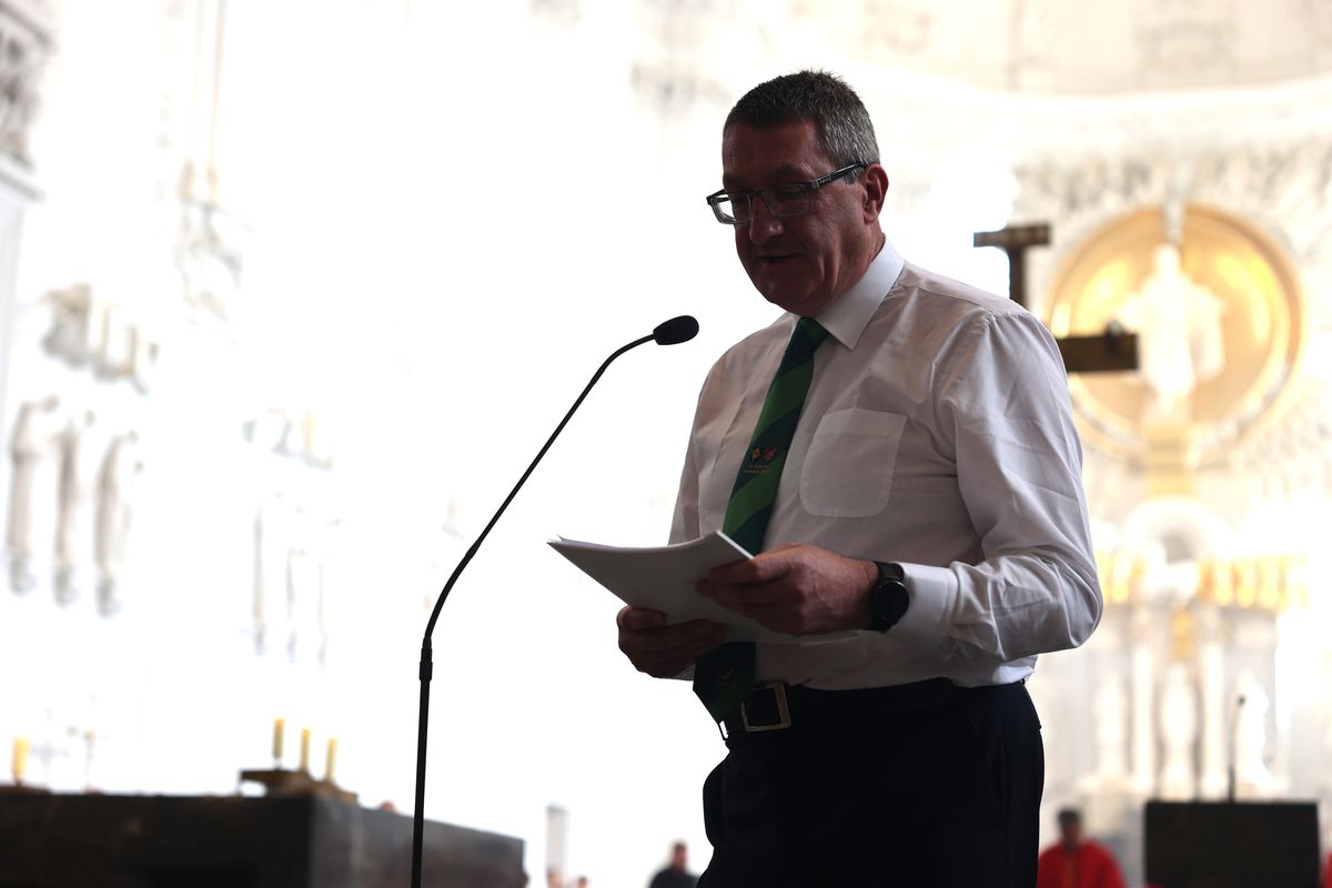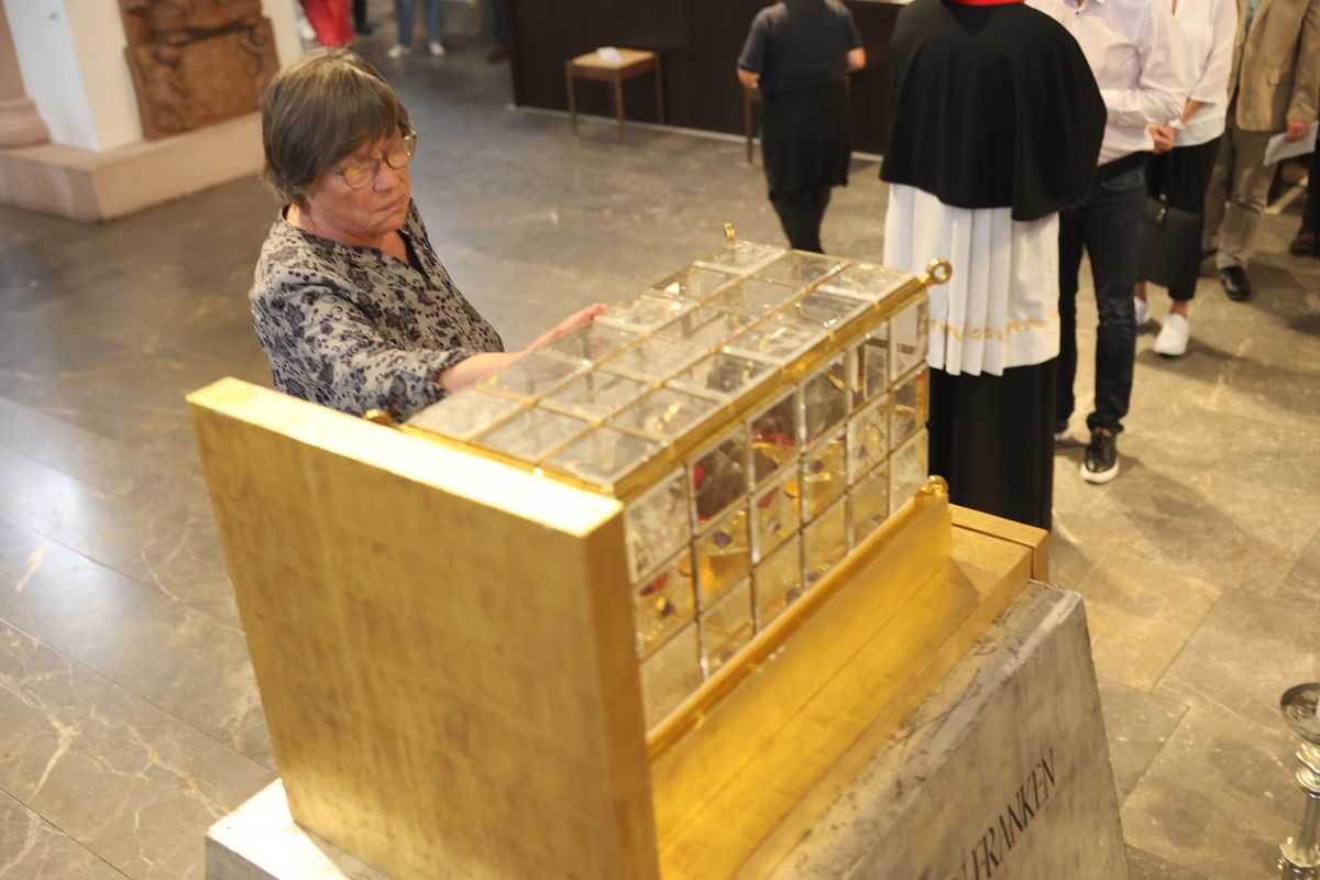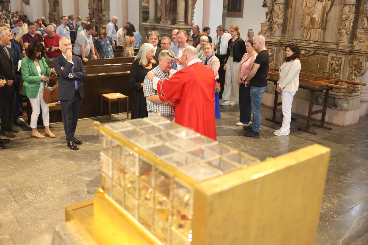 Am Ende des Gottesdiensts lud Pat Smyth von Saint Kilian’s Heritage Centre in Mullagh die Würzburger zur Pilgerfahrt im Oktober nach Irland ein. Ursprünglich war geplant, dass Martin Hayes, Bischof von Kilmore, den Gottesdienst mitfeiert und die Einladung persönlich ausspricht. Wegen eines Pilotenstreiks bei Aer Lingus war allerdings die Anreise kurzfristig gescheitert. In dem verlesenen Grußwort betonte Bischof Hayes, wie sehr er dem ersten Besuch in Würzburg entgegengefiebert habe. „Wir freuen uns darauf, die Reliquien der Frankenapostel und die Pilgerreisenden unter der Führung von Bischof Franz im Oktober bei uns begrüßen zu können.“ Es sei eine gute Gelegenheit, deren Zeugenschaft für den katholischen Glauben, ihre Antwort auf Gottes Liebe, das Beispiel Christi und die Inspiration des Heiligen Geistes zu feiern. „Während wir uns weiterhin auf das Privileg des Besuchs der Reliquien der Frankenapostel bei uns vorbereiten, gelten unsere Hoffnung und unser Gebet der Erneuerung des Glaubens in Irland.“ Besonderen Dank sprach Hayes seinem Amtsbruder Bischof Jung und dem Würzburger Domkapitel aus, die ihr Einverständnis für die Reise der Reliquien nach Irland gegeben haben.