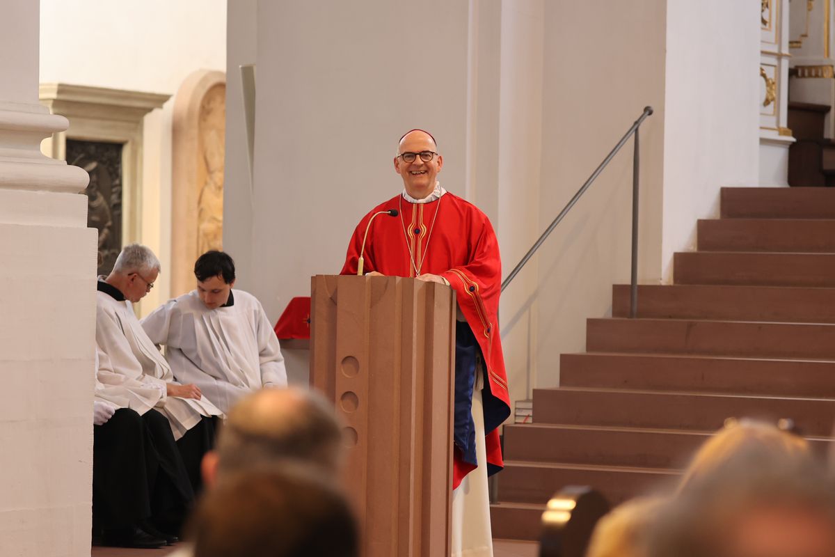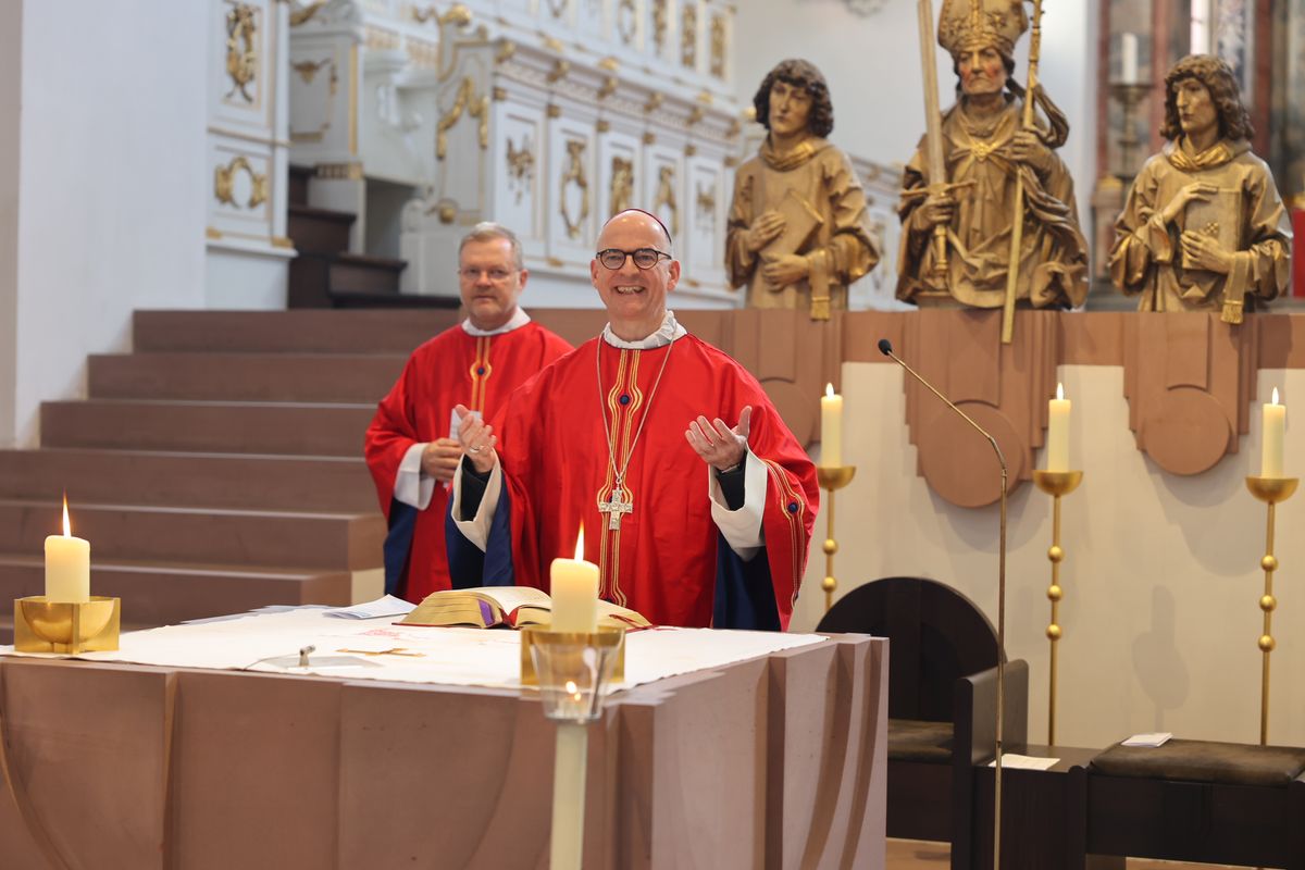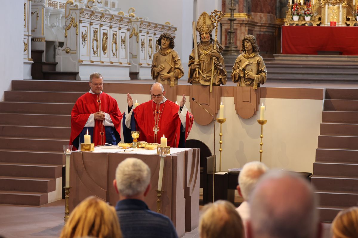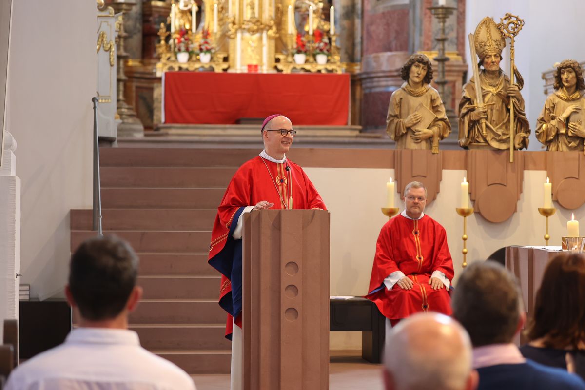 Im Gottesdienst predigte Bischof Jung auf Englisch und erklärte, im Hebräerbrief werde betont, dass Gastfreundschaft wichtig sei. „Denn durch sie haben einige, ohne es zu ahnen, Engel beherbergt.“ Weil die Menschen in Unterfranken Kilian und Gefährten aufgenommen hätten, seien sie reich beschenkt worden. „Denn unsere Frankenapostel verkündeten die Botschaft von der Menschwerdung Gottes.“ Kilian und seine Gefährten hätten die Heimat aufgegeben, weil sie Christus finden wollten, den sie als Erfüllung ihrer Sehnsucht erkannt hätten. „Wer Christus hat, hat alles. In diesem Vertrauen haben sie auch ihr Leben für Christus ohne Zögern eingesetzt.“