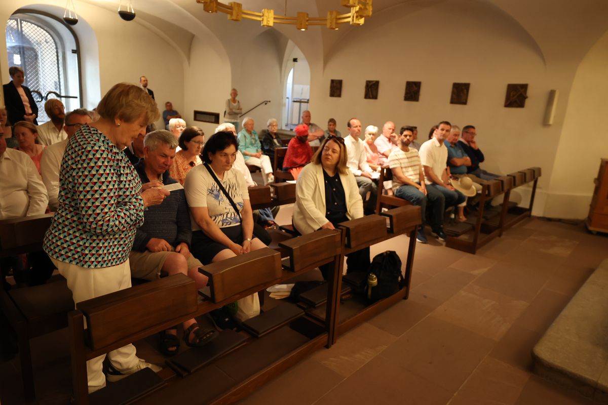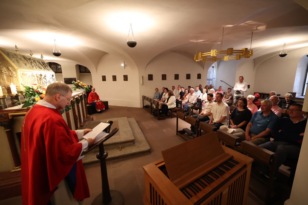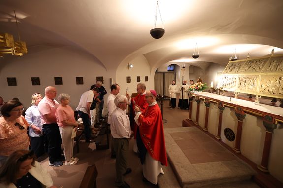 Bis heute stehe die Kirche in Unterfranken auf dem Fundament, das die Frankenapostel gelegt haben, sagte Bischof Jung. „Ahmen wir ihren Glauben nach und erneuern wir ihn in unserer Zeit. Jesus Christus, dessen Stern schon Kilian und seinen Gefährten aufgegangen ist, leuchtet bis heute auch uns“, betonte der Bischof. Am Schrein der Märtyrer in der Krypta des Neumünsters erteilten der Bischof und sein Generalvikar den irischen Pilgern einzeln den Segen mit Reliquiaren der Frankenapostel. Zuvor beteten alle gemeinsam das Gebet der Frankenapostel.