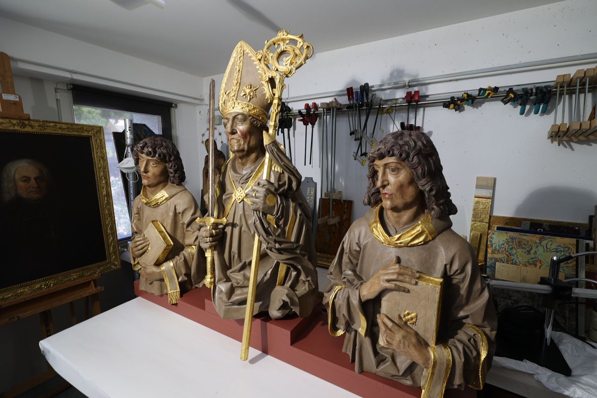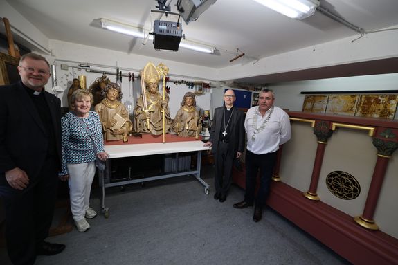 Zum Abschluss der Tour besichtigte die Gruppe in Randersacker bei einem Restaurator den Abguss der Büsten der Frankenapostel aus dem Neumünster und eine Replik des Altars für die Gebeine von Kilian und Gefährten aus der Neumünsterkrypta. Beide werden bei der Wallfahrt des Bistums Würzburg im Oktober in Irland den Gastgebern als Geschenk überreicht. Hergestellt wurden die Kopien von Büsten und Altar zum 1300-Jahr-Jubiläum des Martyriums der Frankenapostel, wo sie auf einem Wagen durch die Innenstadt gefahren wurden. Seither waren die Büsten im Haus des Frankenbunds, die Altarkopie in einer Scheune im Ochsenfurter Gau aufbewahrt.