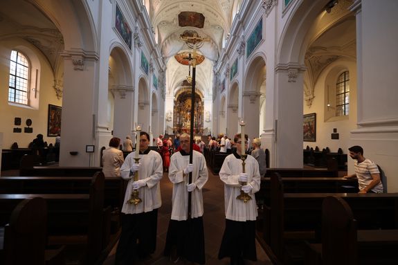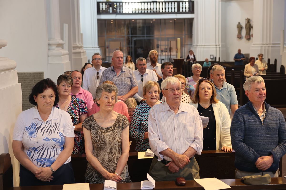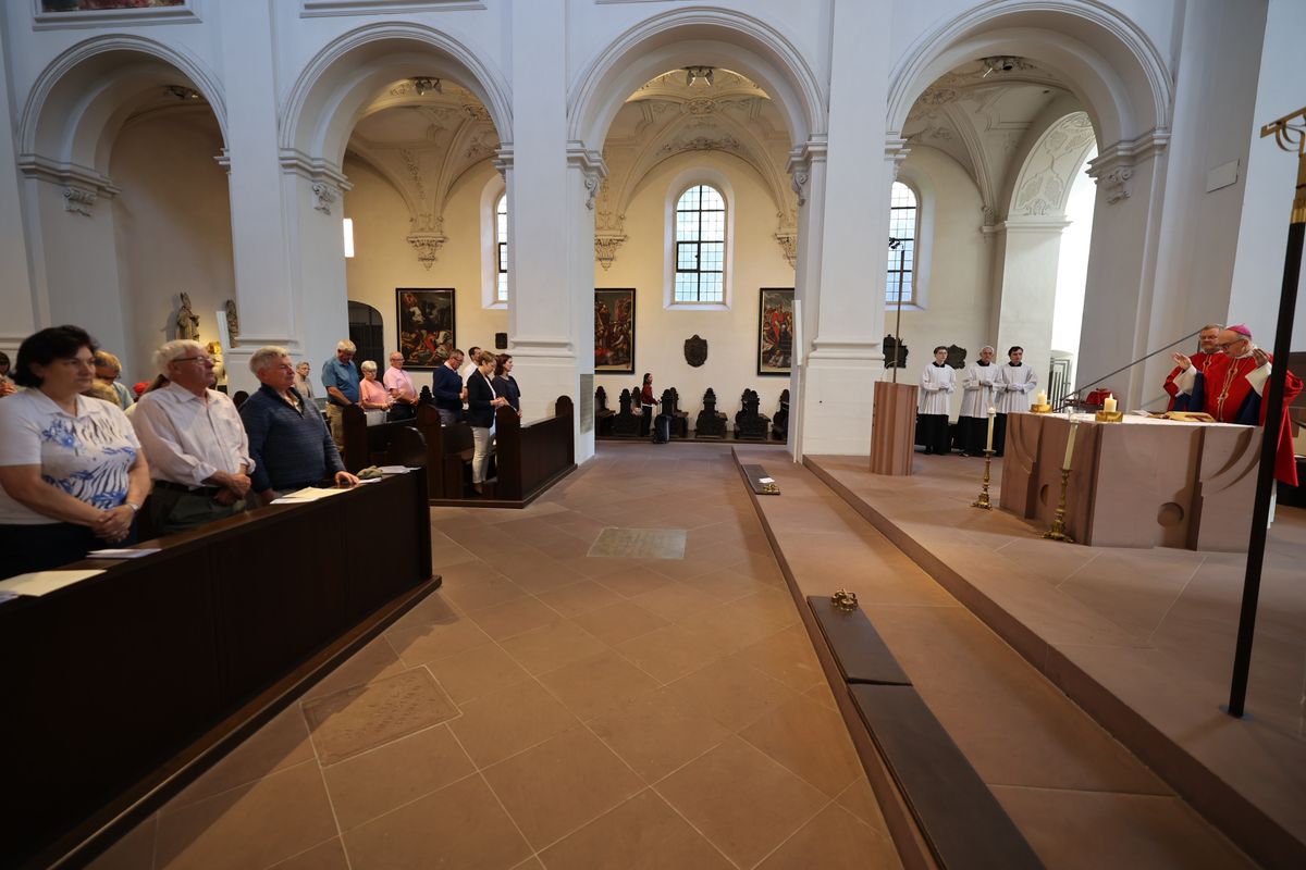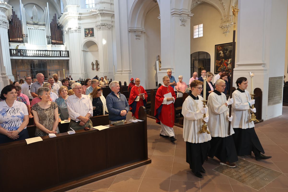 Würzburg (POW) Einen Gottesdienst in englischer Sprache haben Bischof Dr. Franz Jung und Generalvikar Dr. Jürgen Vorndran am Montag, 8. Juli, im Würzburger Neumünster mit der Delegation aus dem irischen Mullagh, Heimatort des heiligen Kilian, gefeiert. Danach besichtigte die Gruppe in der Würzburger Universitätsbibliothek bedeutende Bücher aus der Zeit der Frankenapostel sowie irischer Herkunft (siehe eigener Bericht).
