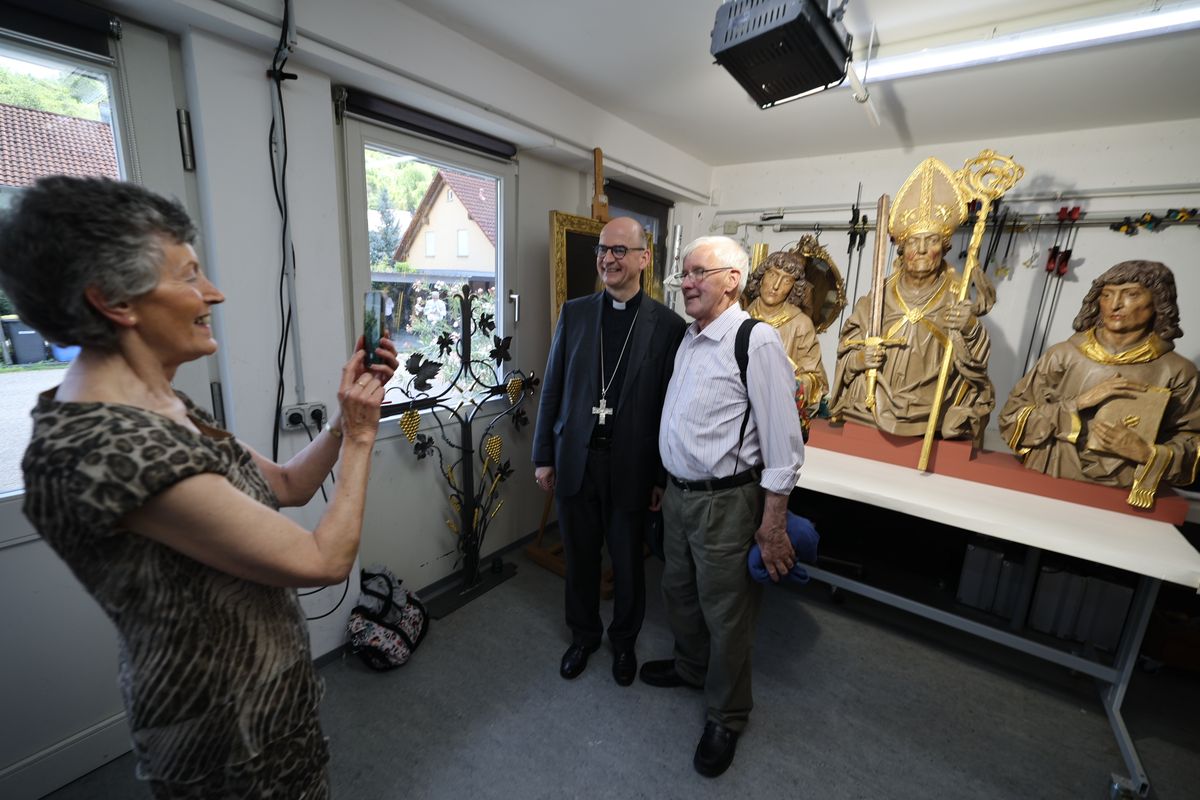 Nach einem englischsprachigen Gottesdienst im Neumünster besichtigten die Irischen Gäste mit Bischof Dr. Franz Jung und Generalvikar Dr. Jürgen Vorndran in der Universitätsbibliothek wertvolle Handschriften mit Irlandbezug, ehe sie in der Werkstatt von Christoph Schädel in Randersacker Repliken von Frankenapostelbüsten und Altar aus der Neumünsterkrypta in Augenschein nahmen, die im Herbst bei der Würzburger Irlandwallfahrt als Gastgeschenke an das Bistum Kilmore gehen.