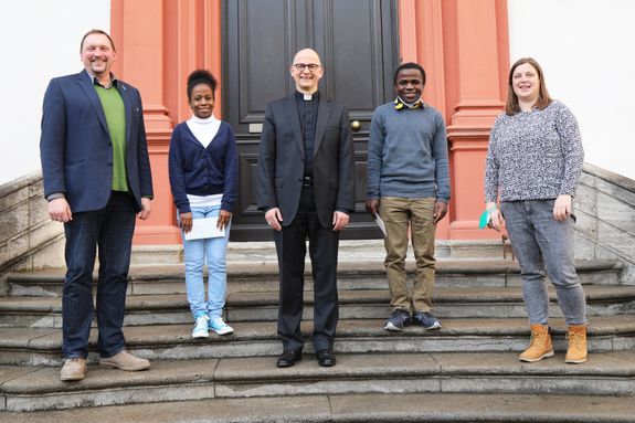 Würzburg/Mbinga (POW) „Mimi ni nani“ erklingt es im Bischofshaus. Die „weltwärts“-Freiwilligen Esta Leander Luena (27) und Goodluck Mully (28) aus dem Partnerbistum Mbinga in Tansania verabschieden sich mit einem Lied auf Kisuaheli von Bischof Dr. Franz Jung. „Du, o Herr, hast mich hierher gebracht, du kümmerst dich um mich“ – das Lied ist auch ein Dank für die Zeit, die sie im Bistum Würzburg verbracht haben. Seit fast einem Jahr leben und arbeiten die beiden Lehrer in Deutschland und sammelten dabei neue Eindrücke und Erfahrungen. Ende Februar werden sie in ihre Heimat zurückkehren. Die Organisation dieses Freiwilligendienstes liegt federführend in den Händen des Bunds der Deutschen Katholischen Jugend (BDKJ) und wird in Zusammenarbeit mit den Kooperationspartnern der Weltkirche durchgeführt.