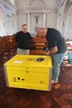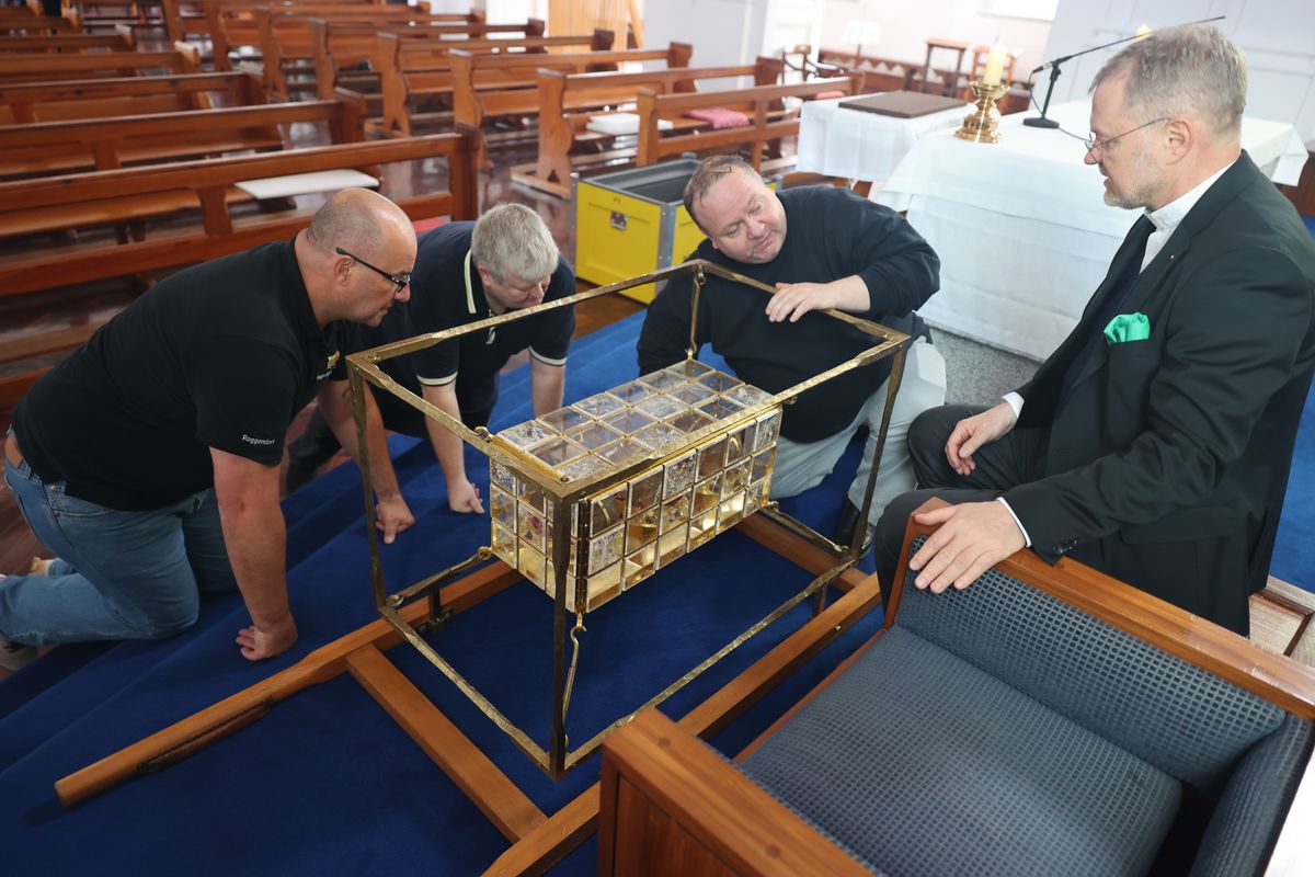 In einer der Hauskapellen wurde der Reliquienschrein aus der Klimakiste genommen und in das Tragegestell montiert.