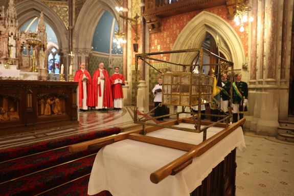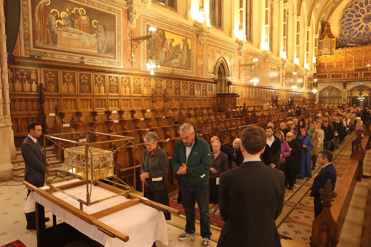 Fast eine halbe Stunde traten am Ende des Gebets Deutsche und Iren in der Kapelle nach vorne, um schweigend und im Gebet die Reliquien der Frankenapostel zu verehren. Musikalisch gestaltet wurden Prozession und Evensong von der Saint Mary’s Brass and Reed Band Maynooth, einem Ensemble der Jungen Herren der Dommusik unter der Leitung von Domkapellmeister Alexander Rüth sowie Domkantor Julian Beutmiller, Eoin Shanahan und Professor em. Gerard Gillen an der Orgel.