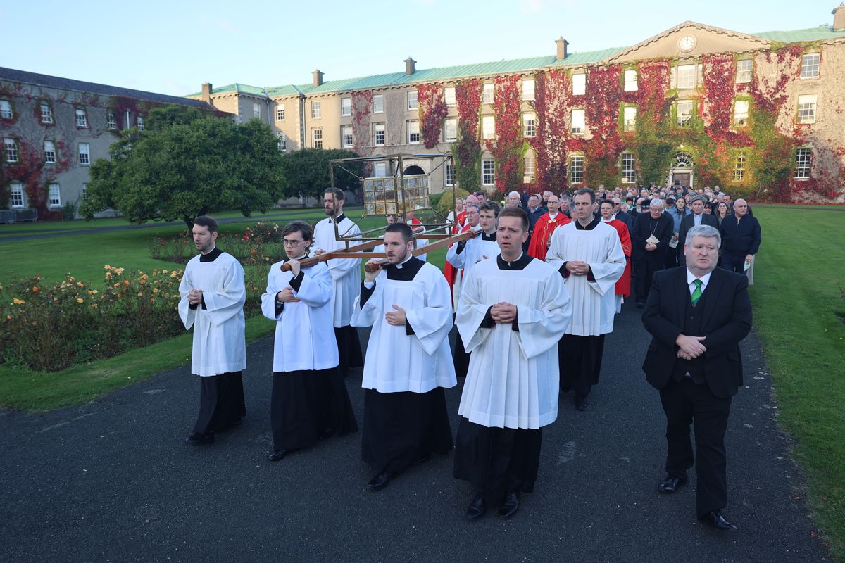 Maynooth (POW) Der Rahmen hat zu dem Ereignis perfekt gepasst: Bei ihrer erstmaligen Rückkehr nach Irland sind am Mittwoch, 2. Oktober, die Häupter der Frankenapostel Kilian, Kolonat und Totnan in Maynooth, dem zentralen irischen Priesterseminar mit Päpstlicher Hochschule, von der gesamten irischen Bischofskonferenz, die dort tagte, und mehreren hundert Gläubigen begrüßt worden. Die mehr als 100 Pilgerinnen und Pilger aus dem Bistum Würzburg mit Bischof Dr. Franz Jung und Generalvikar Dr. Jürgen Vorndran an der Spitze nahmen in der knapp 30 Kilometer westlich von Dublin gelegenen Stadt bei Abendsonne an einer Prozession mit dem Reliquienschrein über den Saint Joseph Square der Hochschule in die große neugotische College Chapel teil, die als eine der schönsten Kirchen Irlands gilt.