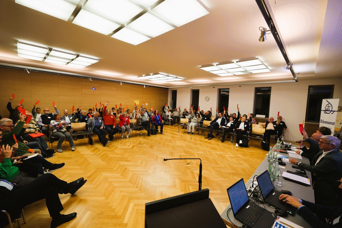 Domkapitular Albin Krämer, Bischofsvikar für den Katholikentag 2026, stellte gemeinsam mit Dominik Großmann, Referent des Bistums Würzburg für den Katholikentag, das an diesem Tag vom Hauptausschuss des Zentralkomitees der deutschen Katholiken (ZdK) beschlossene biblische Motto „Hab Mut, steh auf!“ für die Großveranstaltung in Würzburg vor. Er bezeichnete vor dem Diözesanrat den Katholikentag als „große Chance für das Bistum“. Wer Ideen für Angebote habe, sei aufgerufen, bis spätestens April 2025 seine Bewerbung einzureichen, damit diese geprüft werden könne. „Prima wäre es auch, wenn sich pro Pastoralem Raum eine Handvoll Frauen und Männer im Bistumsbüro für den Katholikentag 2026 (E-Mail dominik.grossmann@bistum-wuerzburg.de, Telefon 0931/38665107) melden, die bereit sind, sich regelmäßig über den aktuellen Stand zu informieren und als ,Botschafterinnen und Botschafter für den Katholikentag' und Ansprechpartner für die Pfarreiengemeinschaften zu fungieren.“