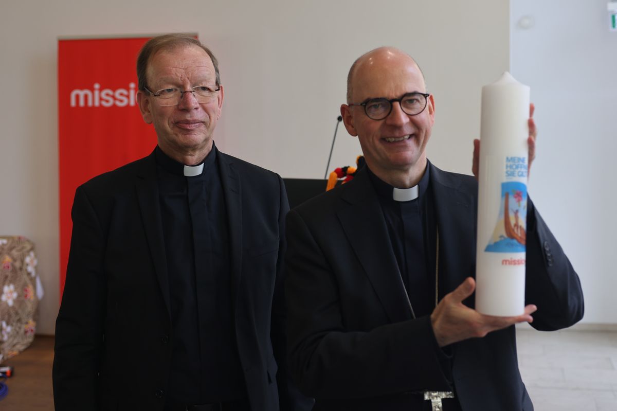 Monsignore Wolfgang Huber von "missio" überreichte dem Gastgeber Bischof Dr. Franz Jung (rechts) zum Dank eine Kerze.