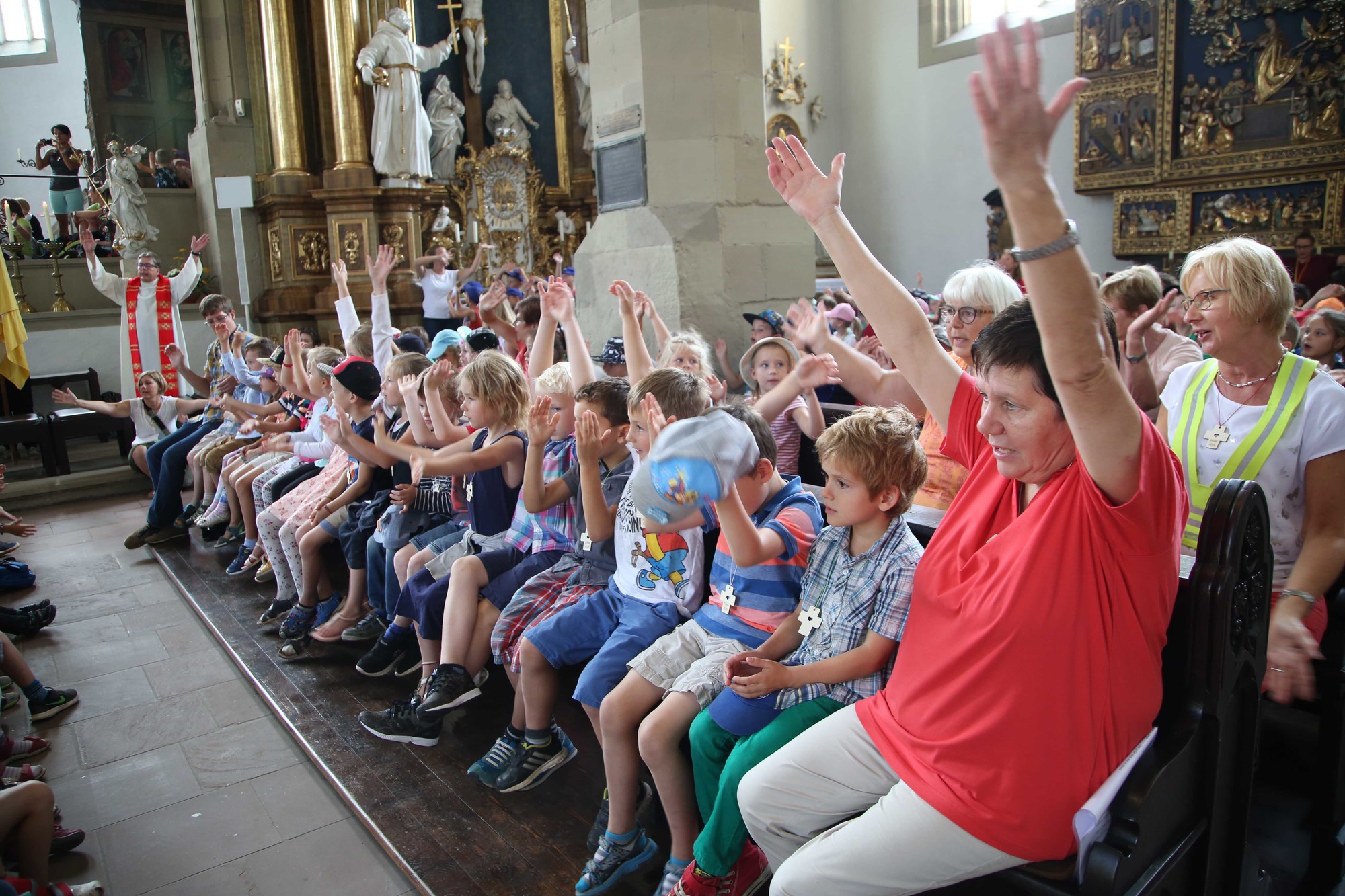 Dann taucht auf einmal ein Forscher mit Rucksack und einer großen Lupe auf. „Ich bin mitten auf einer Entdeckungsreise. Ich erforsche die Welt und die vielen Dinge darin“, erzählt er den Kindern. Er begleitet sie von Sankt Burkard über die Alte Mainbrücke zum Dom. Rund 30 Helfer von der Caritas sind im Einsatz und reichen den jungen Pilgern Brötchen zur Stärkung. In einem schier endlosen Zug ziehen die Kinder und ihre Begleiter in den Dom ein. Am Hauptportal wartet schon Bischof Jung und besprengt sie mit Weihwasser. Im Dom rutschen die Kleinen neugierig auf ihren bunten Kiliani-Sitzkissen bis in den Altarraum vor. Dort zeigen die fünften Klassen der Sankt-Ursula-Schule in kleinen Szenen, wo man Gott überall finden kann. Der Naturforscher findet ihn in der Schönheit der Blumen, der Psychologe bei den Menschen und der Security-Mann in seiner Arbeit als Beschützer. Zum Schluss tritt ein „Lebenskünstler“ auf: „Ich lasse mich überraschen und bin offen für alles.“