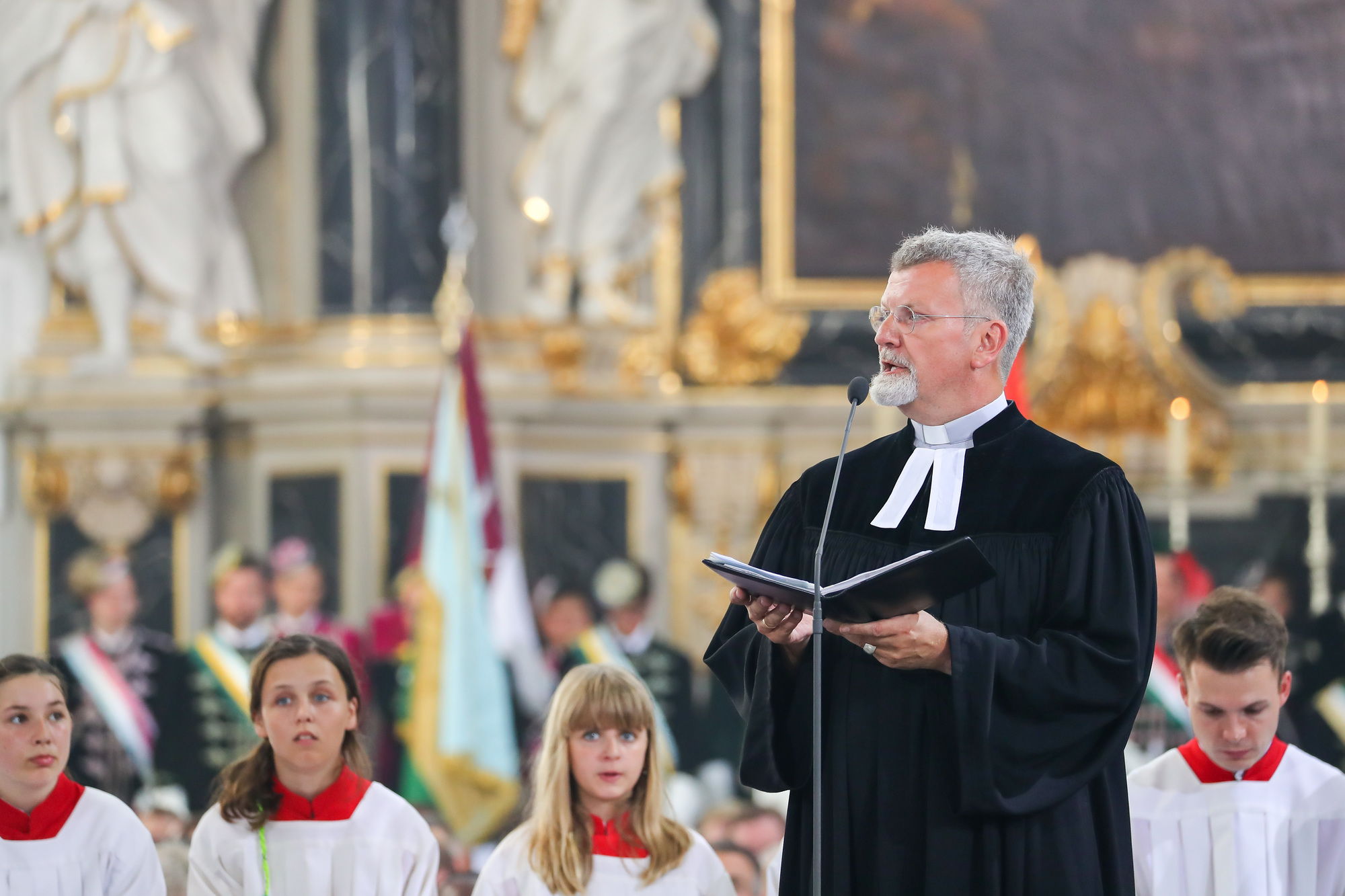 Das Grußwort der kurzfristig erkrankten Regionalbischöfin Gisela Bornowski las Ökumenebeauftragter Kirchenrat Andreas Werner vor. Darin erklärte sie, es werde im unterfränkischen Teil des evangelisch-lutherischen Kirchenkreises Ansbach-Würzburg „fast überall eine lebendige und geschwisterliche Ökumene gelebt“, die als große Bereicherung erfahren werde. „Es ist unser Auftrag, diese Einladung Jesu zu den Menschen zu bringen.“ Die Welt sehe Protestanten und Katholiken dabei immer zusammen und nicht wenige unterschieden nicht mehr zwischen den beiden Konfessionen. „So werden wir gemeinsam wahrgenommen, wertgeschätzt, beurteilt und manchmal auch verurteilt für die Fehler der jeweils anderen Konfession.“ Das Gedenken an den Beginn der Reformation vor 500 Jahren sei ökumenisch begangen und als Christusfest gefeiert worden. Dieser Ausdruck geschwisterlicher Verbundenheit sei Ansporn, die Einheit im Leib Christi „mit allen unseren Kräften“ zu suchen und zu fördern. „Christus, der Herr der einen Kirche, ruft alle zu sich, er unterscheidet nicht zwischen arm und reich, alt und jung, dumm oder gescheit, Mann oder Frau, evangelisch oder katholisch, orthodox oder freikirchlich. Denn er will alle bei sich haben.“ Regionalbischöfin Bornowski bot Bischof Jung daher die Zusammenarbeit „im versöhnten, ökumenischen Geist an, auf allen Ebenen kirchlicher Arbeit“. Zugleich wünschte sie ihm, dass Christus ihn immer mit dem Geist der Kraft, Liebe und Besonnenheit leite.