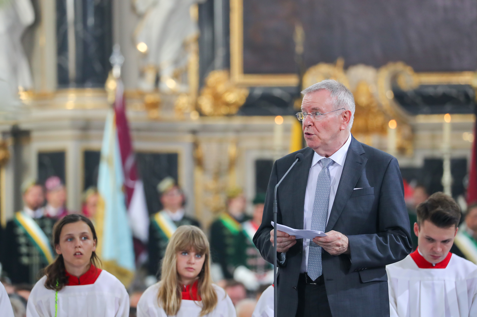 Landtagspräsidentin Barbara Stamm hieß im Namen der Bayerischen Staatsregierung Bischof Jung herzlich willkommen in Bayern. „Wir sind fest überzeugt: Es wird auch Ihre Heimat werden.“ Stamm überbrachte Bischof Jung die Grüße von Ministerpräsident Dr. Markus Söder und der beiden unterfränkischen Kabinettsmitglieder Justizminister Professor Dr. Winfried Bausback und Innenstaatssekretär Gerhard Eck. Die warmen Socken, die Jung als Abschiedsgeschenk in Speyer erhalten habe, werde er in Unterfranken nicht nur wegen des „recht angenehmen“ Klimas nicht brauchen. „Vor allen Dingen werden Sie die Erfahrung machen, dass Ihnen die Menschen hier in Würzburg mit großer Offenheit und Herzenswärme begegnen, dass sie Ihnen großes Vertrauen entgegenbringen – und viele Hoffnungen.“ So zum Beispiel, dass er als Bischof bei allen etwa in der Gemeindepastoral erforderlichen Reformen die Betroffenen mitnehme und sich der enormen Bedeutung der Seelsorge für die Menschen bewusst sei. „Ich bin überzeugt, dass Ihnen all dies wunderbar gelingen wird und dass wir weiterhin gemeinsam die Dinge im Bistum Würzburg gut gestalten: als lebendige Kirche, ab heute mit Ihnen als unserem Bischof an der Spitze.“ Der Wahlspruch „Hoffnung als Anker der Seele“ sei eine wunderbare Botschaft. Gerade in diesen Zeiten seien Halt und Orientierung, seien Anker, die Sicherheit geben, notwendig, erklärte Stamm. Deswegen freue sie sich sehr über Jung als neuen Würzburger Bischof.